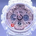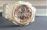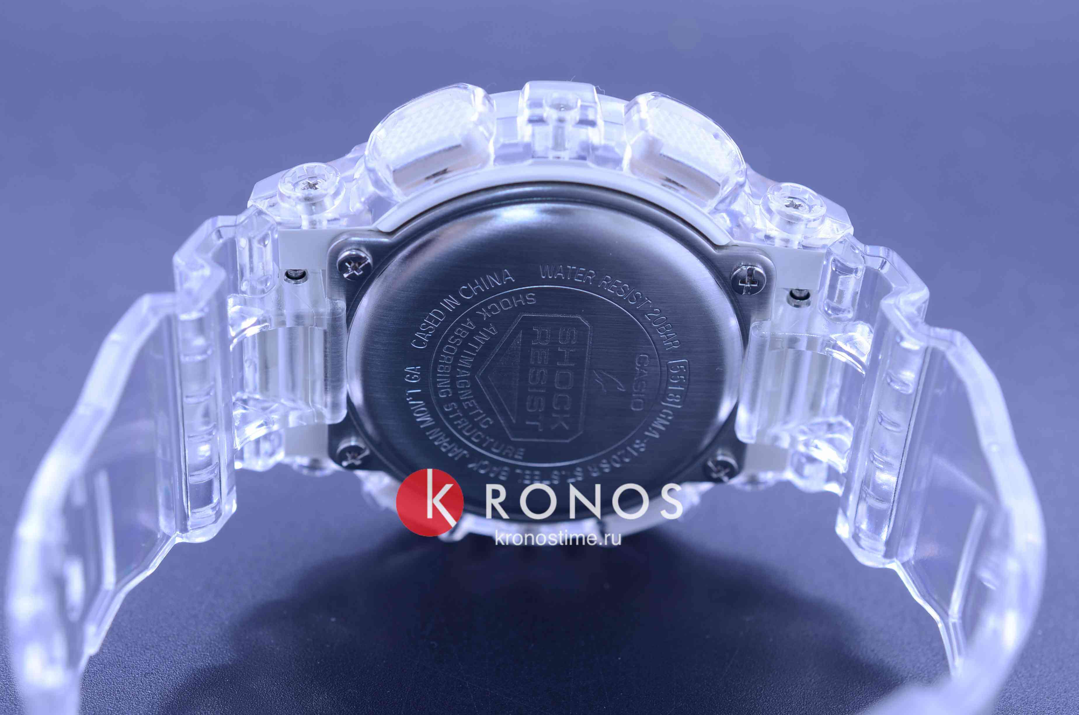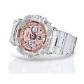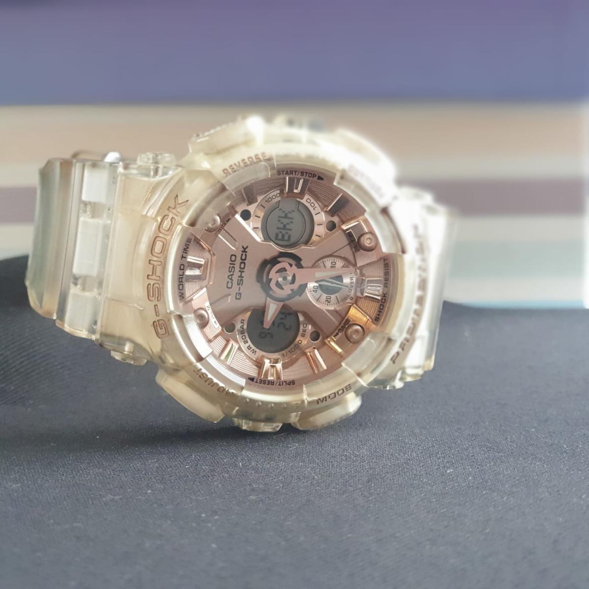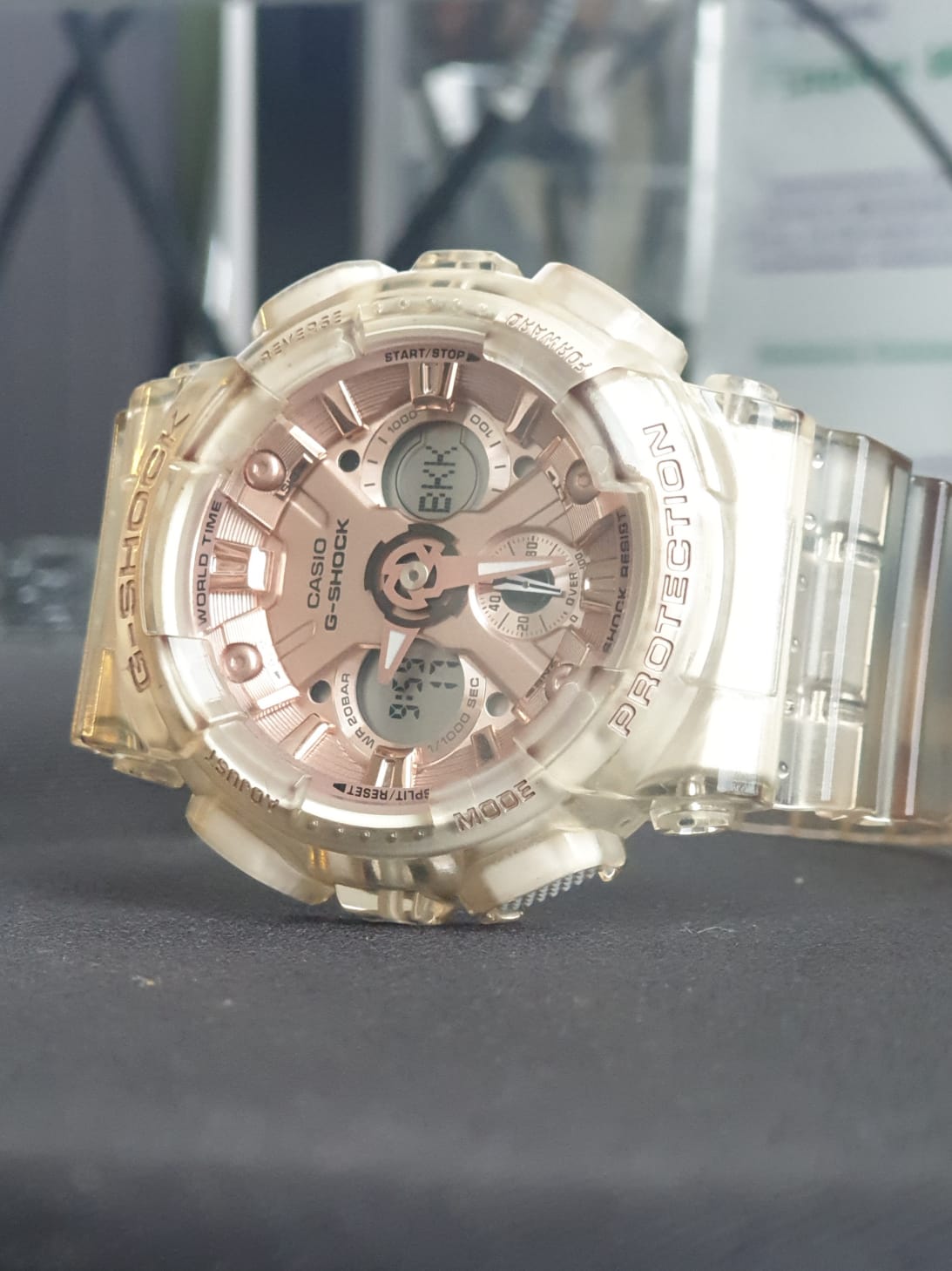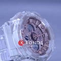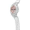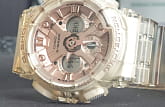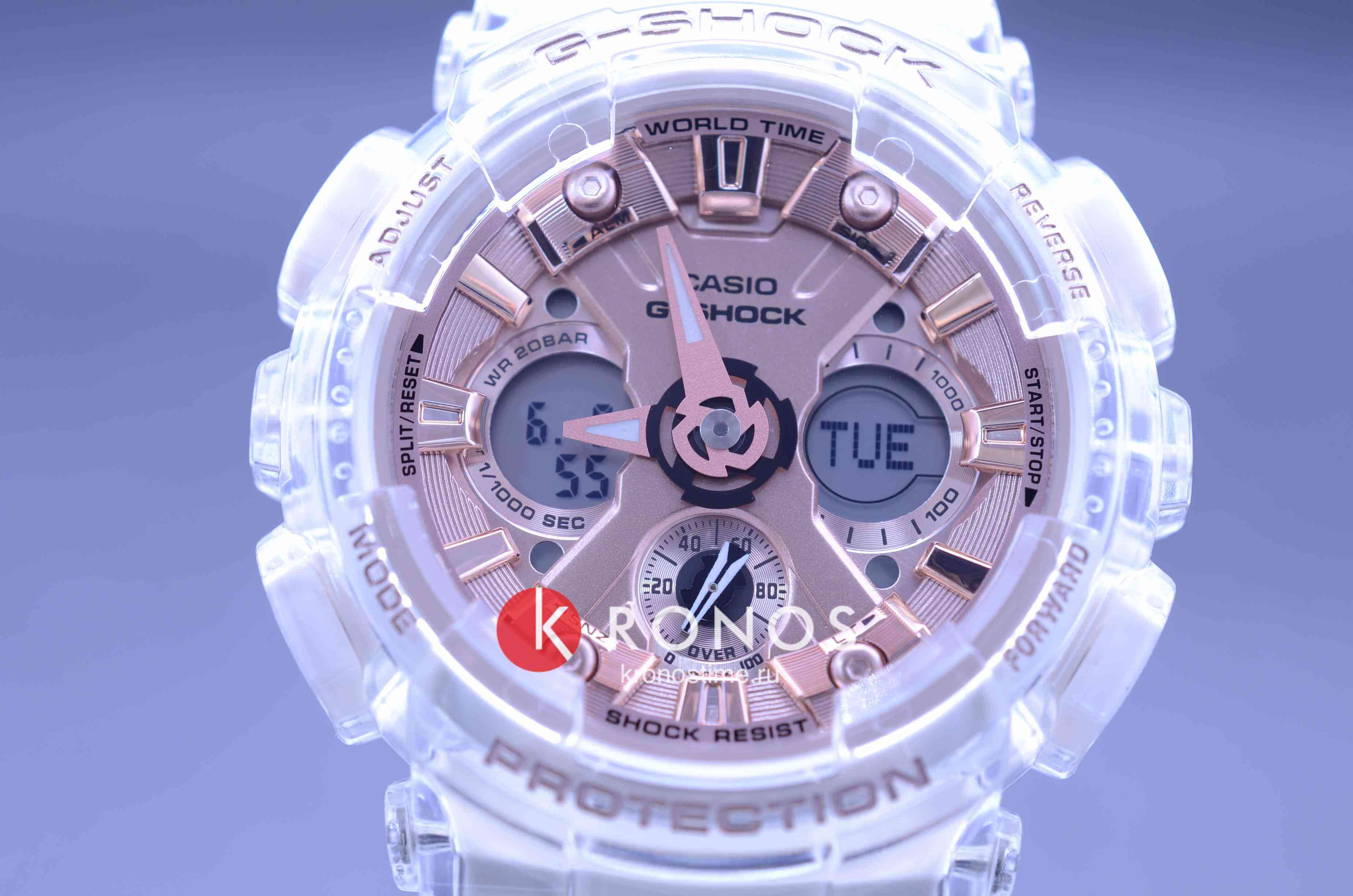 Наручные часы представлены в линейке G-Shock Women Skeleton, выполненной на базе моделей G-Shock GMA-110/120. Они напоминают о механических часах скелетонах, демонстрируя полупрозрачный пластиковый корпус и ремешок. Цветовым акцентом стал переливающийся циферблат оттенка розового золота, который придётся по душе любой моднице. Аксессуар характеризуется лёгким весом и комфортно сидит на запястье, выдерживая нагрузки, вибрации, воздействие магнитных полей. Японский кварцевый механизм позволяет измерять время с высокой точностью хода. Калибр работает за счёт батарейки, рассчитанной на 3 года службы. Используется закаленное минеральное стекло, препятствующее возникновению царапин. Яркая светодиодная подсветкаСветодиодная подсветкаСветодиодная или LED-подсветка обеспечивает появление яркого холодного свечения за счёт LED-элементов - маленьких лампочек. Они потребляют минимальное количество энергии, чаще всего можно встретить 1 светодиод, в нижней части циферблата. освещает циферблат, позволяя использовать часы в темноте. Функции помогают справляться с ежедневными делами: хронографХронографФункция позволяет измерять отрезки времени с особой точностью: часы, минуты, секунды. Верным признаком хронографа является наличие на циферблате 3 дополнительных окошек-счётчиков., таймер, вечный календарьВечный календарьКлассическое часовое усложнение, представляющее собой календарь, рассчитанный на несколько лет вперёд (стандартно – до 2099 года). Определяет текущую дату, день недели, месяц., секундомер, мировое времяМировое время Полезное часовое усложнение, отображающее время в основных городах и известных областях по всему миру, оно связано с часовыми поясами, удобно для путешественников и бизнесменов. , будильник, UTCUTCВсемирное кординационное время, не имеющее привязки к географическому положению Гринвича, основывается на атомном отсчёте времени. Регулировка времени осуществляется более точно, чем устаревшее GMT.
