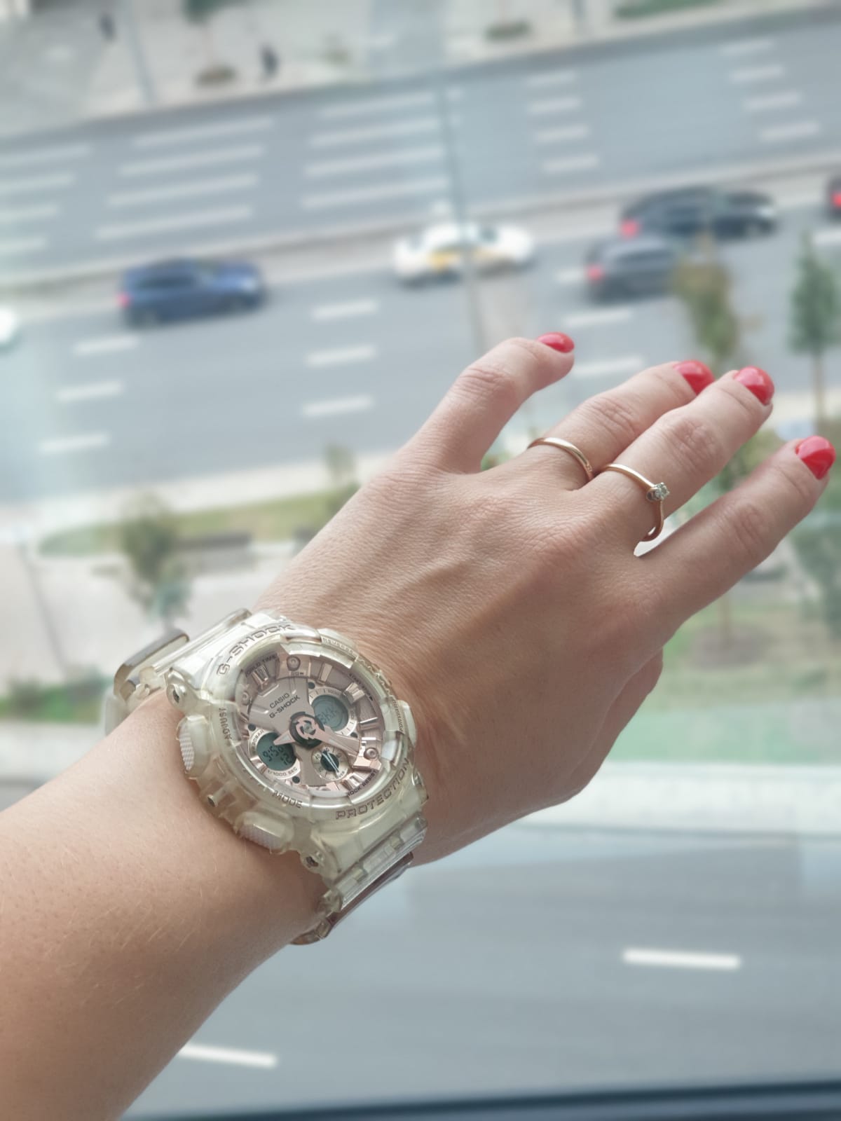 Розовое золото и белый прозрачный пластик придают уникальность. Хорошая водозащита до 200м. Ударостойкие.