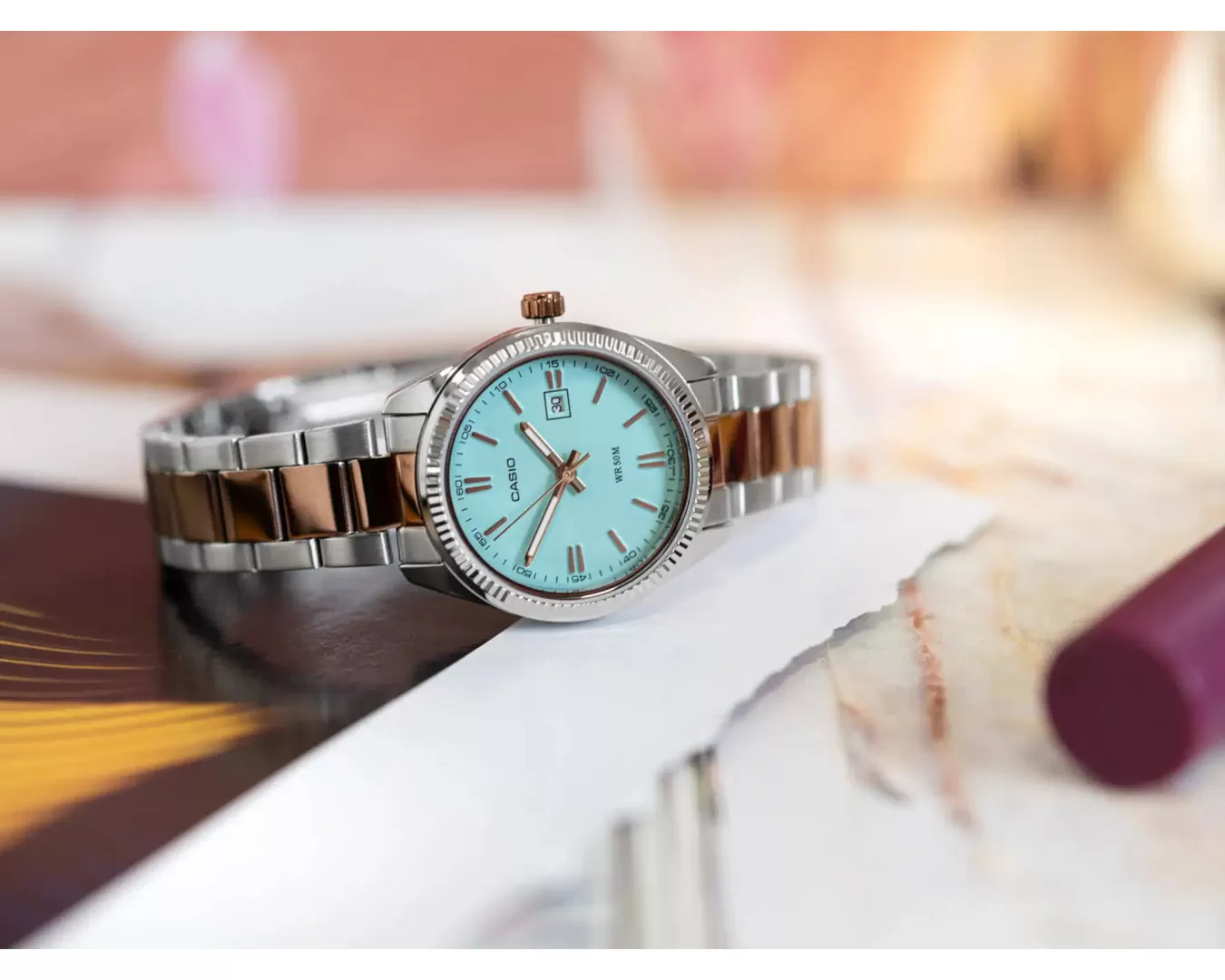 Японские женские часы Casio Collection LTP-1302PRG-2AVEF с минеральным стекломМинеральное стеклоМинеральное стекло представляет собой искусственно выращенный минерал кварца. Такое стекло отличается особой устойчивостью к повреждениям и царапинам. Уступает по некоторым качествам сапфировому стеклу.. Светящееся покрытие обеспечивает длительную подсветку в темное время суток после короткого воздействия света. Корпус выполнен из гипоаллергенной латуни. Модель комплектуется надёжным механизмом, точность хода которого составляет +/- 20 сек/мес. Стрелки с люминесцентным покрытиемЛюминесцентное покрытиеПозволяет считывать показания времени в темноте. Производители наносят на стрелки, часовые индексы, безель или поверхность циферблата светонакопительный состав, дающий холодное свечение.. Стальной браслет на раскладной застёжкеРаскладная застёжкаТакой тип застёжки используется только на браслетах из металла. Она никогда не раскрывается полностью, происходит разделение на 2 и более частей. Раскладывающая застёжка снизит вероятность потери часов к минимуму. с IP-покрытиемIP-покрытиеМетод ионного напыления. Демонстрирует повышенную устойчивость к истиранию, окислению и химическим веществам. Под воздействием высокого давления и температуры около 1500°C молекулы металла надёжно соединяются с частицами корпуса часов.. Окошко даты находится в положении 3 часа. Водонепроницаемость 50 метров, позволит защитить корпус от случайных брызг или капель дождя.