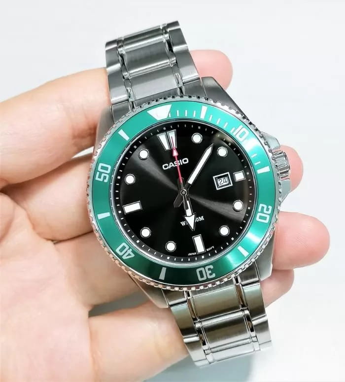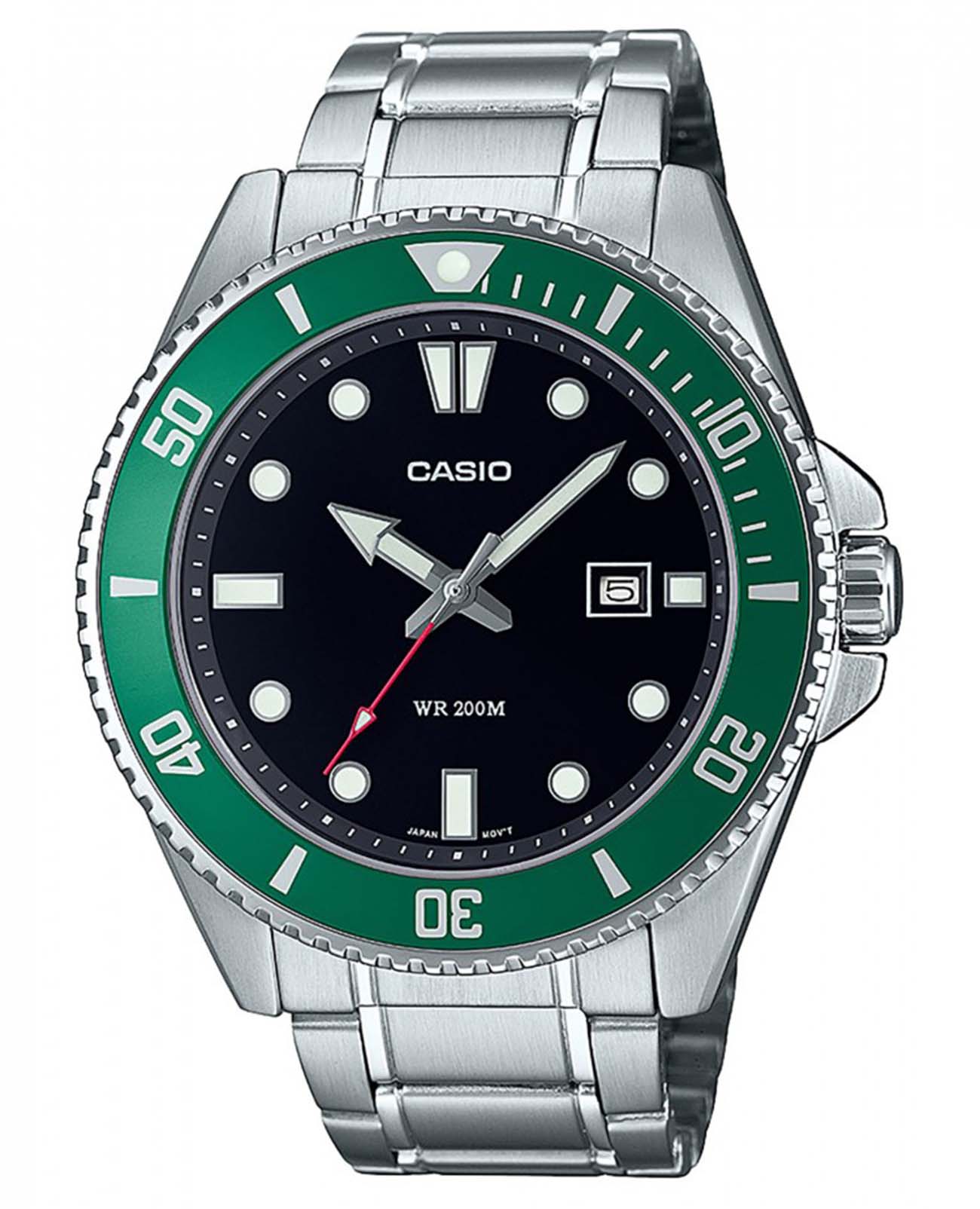 Японские мужские кварцевые часы с минеральным стекломМинеральное стеклоМинеральное стекло представляет собой искусственно выращенный минерал кварца. Такое стекло отличается особой устойчивостью к повреждениям и царапинам. Уступает по некоторым качествам сапфировому стеклу. Casio Collection MDV-107D-3A, кварцевый механизм с высокой точностью. Корпус часов изготовлен из нержавеющей стали. Вращающийся безельБезельВнешний ободок, закрепляющий стекло. В спортивных часах так называется поворотное кольцо с делениями на циферблате, выполняет роль таймера – замеряет отрезки времени на шкале. Неподвижный безель – элемент декора. Однонаправленно вращающийся безель на дайверских часах позволяет фиксировать моменты погружения и выныривания на поверхность. из нержавеющей стали с IP-покрытиемIP-покрытиеМетод ионного напыления. Демонстрирует повышенную устойчивость к истиранию, окислению и химическим веществам. Под воздействием высокого давления и температуры около 1500°C молекулы металла надёжно соединяются с частицами корпуса часов.. Подсветка NeobriteПодсветка NeobriteИспользование светонакопительных составов на основе сульфида цинка или алюмината стронция, яркий свет можно наблюдать на протяжении 6-10 часов после «зарядки» часов около источника света. обеспечивает длительное послесвечение в темноте даже после кратковременного нахождения на свету. Окошко даты находится в положении 3 часа. Класс водозащиты: 200 метров, позволит плавать, нырять и заниматься другими водными видами спорта. Стальной браслет с раскладной застёжкойРаскладная застёжкаТакой тип застёжки используется только на браслетах из металла. Она никогда не раскрывается полностью, происходит разделение на 2 и более частей. Раскладывающая застёжка снизит вероятность потери часов к минимуму..