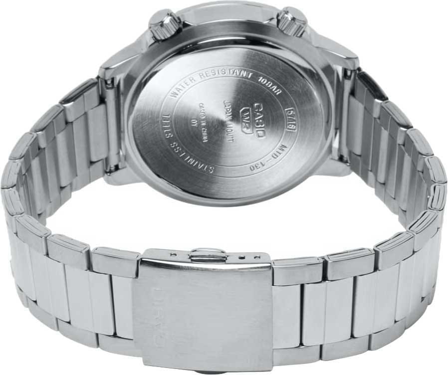 Мужские японские часы Casio MTD-130D-1A3, кварцевый механизм с высокой точностью. Класс водозащиты: 100 метров. Круглый стальной корпус изготовлен из нержавеющей стали. Апертура даты на отметке 4 часа. Браслет из нержавеющей стали с раскладной застежкойРаскладная застёжкаТакой тип застёжки используется только на браслетах из металла. Она никогда не раскрывается полностью, происходит разделение на 2 и более частей. Раскладывающая застёжка снизит вероятность потери часов к минимуму..