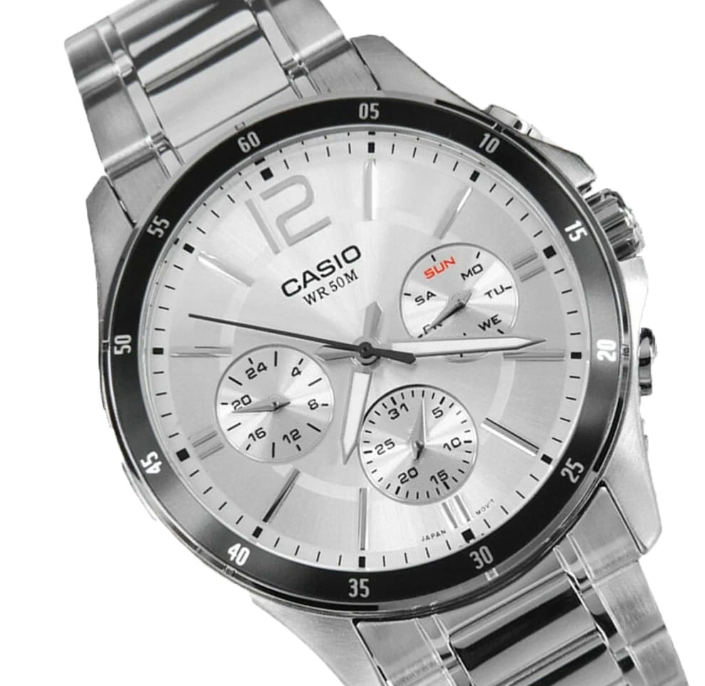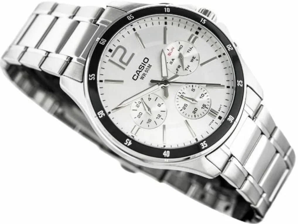 Японские мужские наручные часы с минеральным стекломМинеральное стеклоМинеральное стекло представляет собой искусственно выращенный минерал кварца. Такое стекло отличается особой устойчивостью к повреждениям и царапинам. Уступает по некоторым качествам сапфировому стеклу. Casio Collection MTP-1374D-7A, кварцевый механизм с высокой точностью. Класс водозащиты: 50 метров, позволит защитить корпус от случайных брызг или капель дождя. Корпус часов изготовлен из стали. Стальной браслет на раскладной застёжкеРаскладная застёжкаТакой тип застёжки используется только на браслетах из металла. Она никогда не раскрывается полностью, происходит разделение на 2 и более частей. Раскладывающая застёжка снизит вероятность потери часов к минимуму.. Стрелки с люминесцентным покрытиемЛюминесцентное покрытиеПозволяет считывать показания времени в темноте. Производители наносят на стрелки, часовые индексы, безель или поверхность циферблата светонакопительный состав, дающий холодное свечение.. 12-ти и 24-х часовой формат времени, число и день недели вынесены на отдельные циферблаты. Метки в виде штрихов и арабской цифры 12. Заводная головка с защитой. БезельБезельВнешний ободок, закрепляющий стекло. В спортивных часах так называется поворотное кольцо с делениями на циферблате, выполняет роль таймера – замеряет отрезки времени на шкале. Неподвижный безель – элемент декора. Однонаправленно вращающийся безель на дайверских часах позволяет фиксировать моменты погружения и выныривания на поверхность. с IP-покрытиемIP-покрытиеМетод ионного напыления. Демонстрирует повышенную устойчивость к истиранию, окислению и химическим веществам. Под воздействием высокого давления и температуры около 1500°C молекулы металла надёжно соединяются с частицами корпуса часов..
