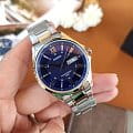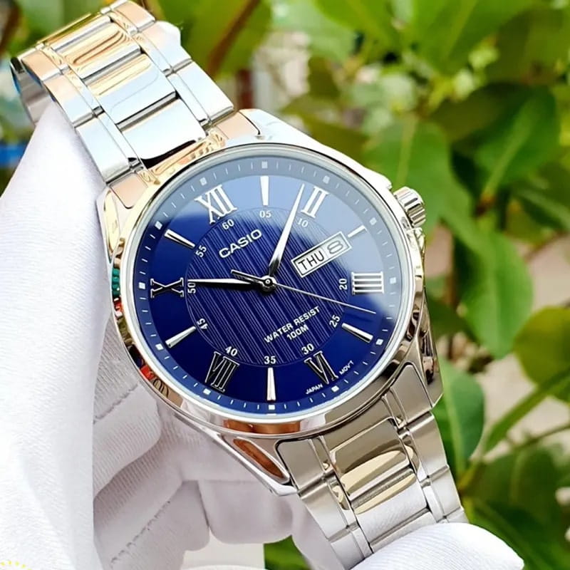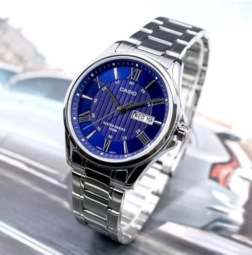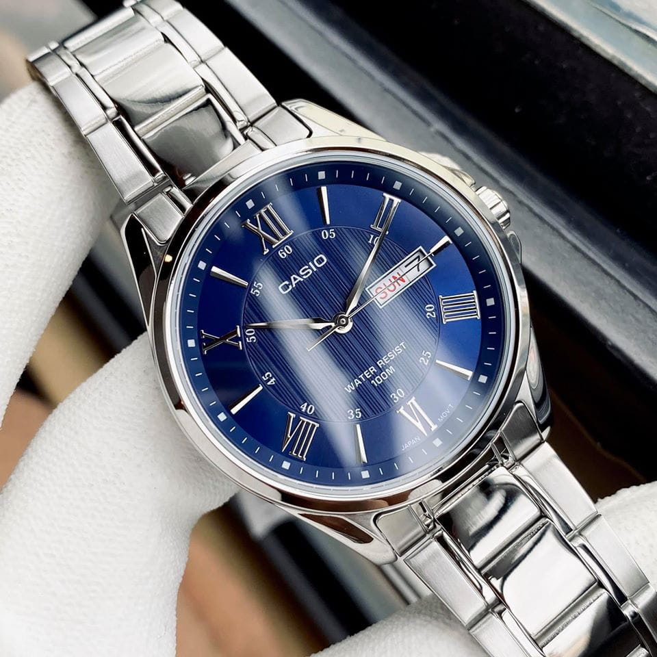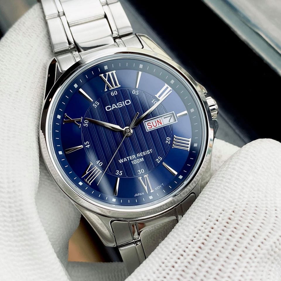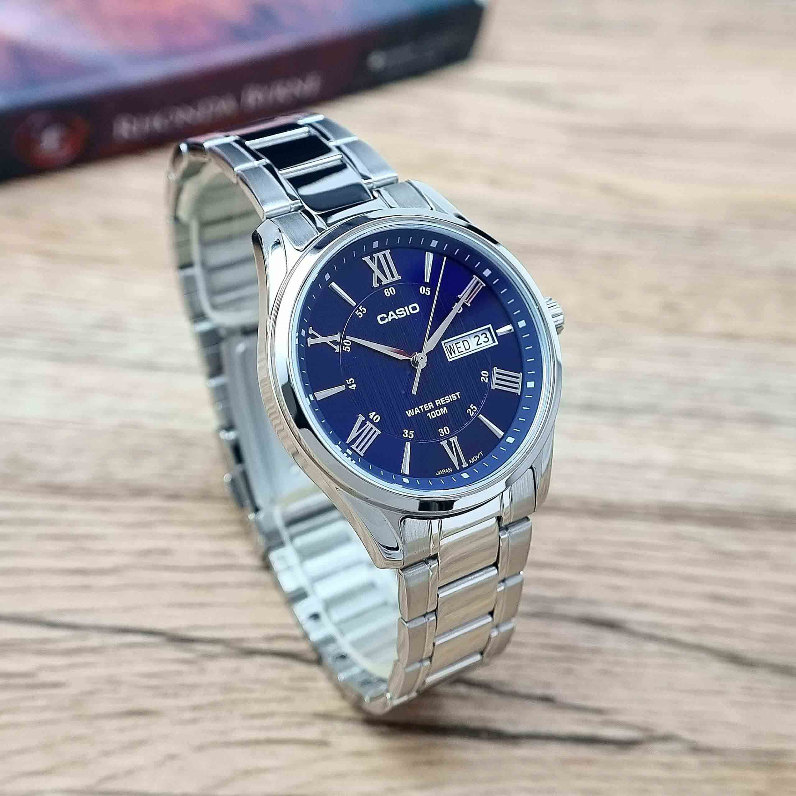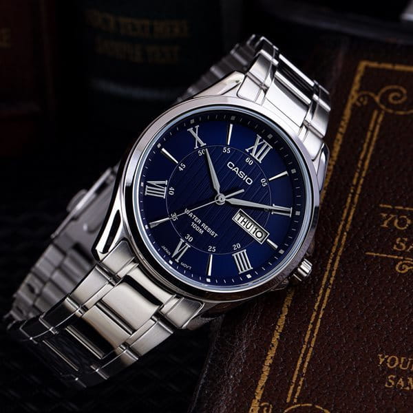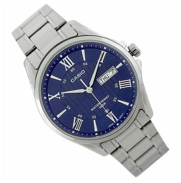Японские мужские наручные часы с минеральным стекломМинеральное стеклоМинеральное стекло представляет собой искусственно выращенный минерал кварца. Такое стекло отличается особой устойчивостью к повреждениям и царапинам. Уступает по некоторым качествам сапфировому стеклу. Casio Collection MTP-1384D-2A, кварцевый механизм с высокой точностью. Класс водозащиты: 100 метров, позволит плавать, нырять и заниматься другими водными видами спорта. Корпус часов изготовлен из стали. Стальной браслет на раскладной застёжкеРаскладная застёжкаТакой тип застёжки используется только на браслетах из металла. Она никогда не раскрывается полностью, происходит разделение на 2 и более частей. Раскладывающая застёжка снизит вероятность потери часов к минимуму.. Окошки дня недели и даты находятся в положении 3 часа.