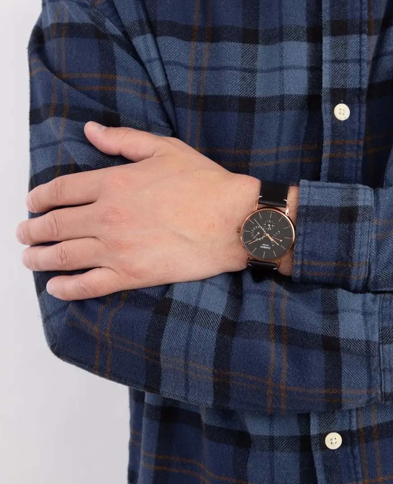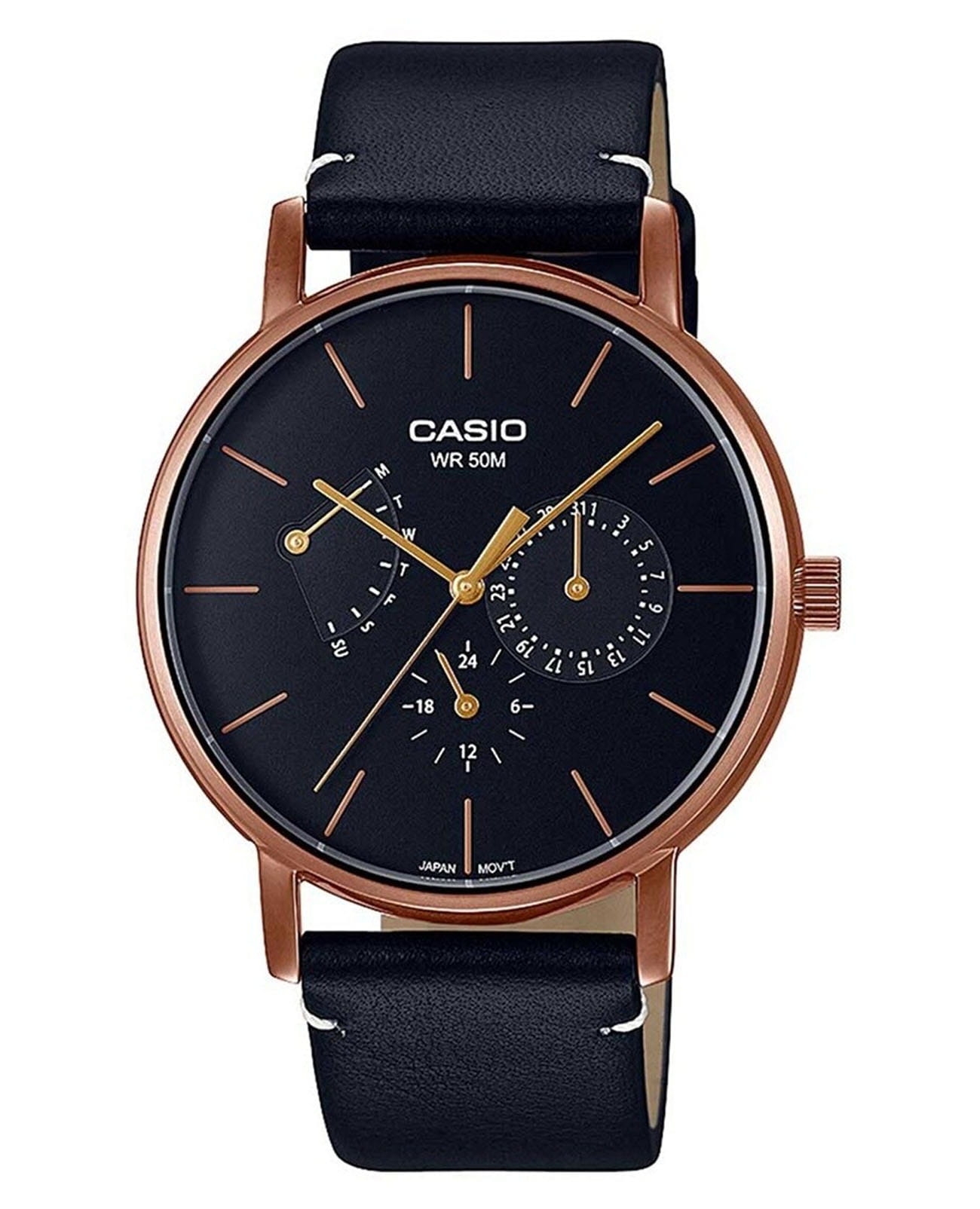 Японские мужские часы с минеральным стекломМинеральное стеклоМинеральное стекло представляет собой искусственно выращенный минерал кварца. Такое стекло отличается особой устойчивостью к повреждениям и царапинам. Уступает по некоторым качествам сапфировому стеклу. Casio Collection MTP-E320RL-1E, кварцевый механизм с высокой точностью. Корпус часов изготовлен из стали с IP-покрытиемIP-покрытиеМетод ионного напыления. Демонстрирует повышенную устойчивость к истиранию, окислению и химическим веществам. Под воздействием высокого давления и температуры около 1500°C молекулы металла надёжно соединяются с частицами корпуса часов.. Число и день недели вынесены на отдельные циферблаты. Метки в виде штрихов. Батарейка рассчитана на 3 года. Класс водозащиты: 50 метров, позволит защитить корпус от случайных брызг или капель дождя. Кожаный ремешок на стандартной застёжке.
