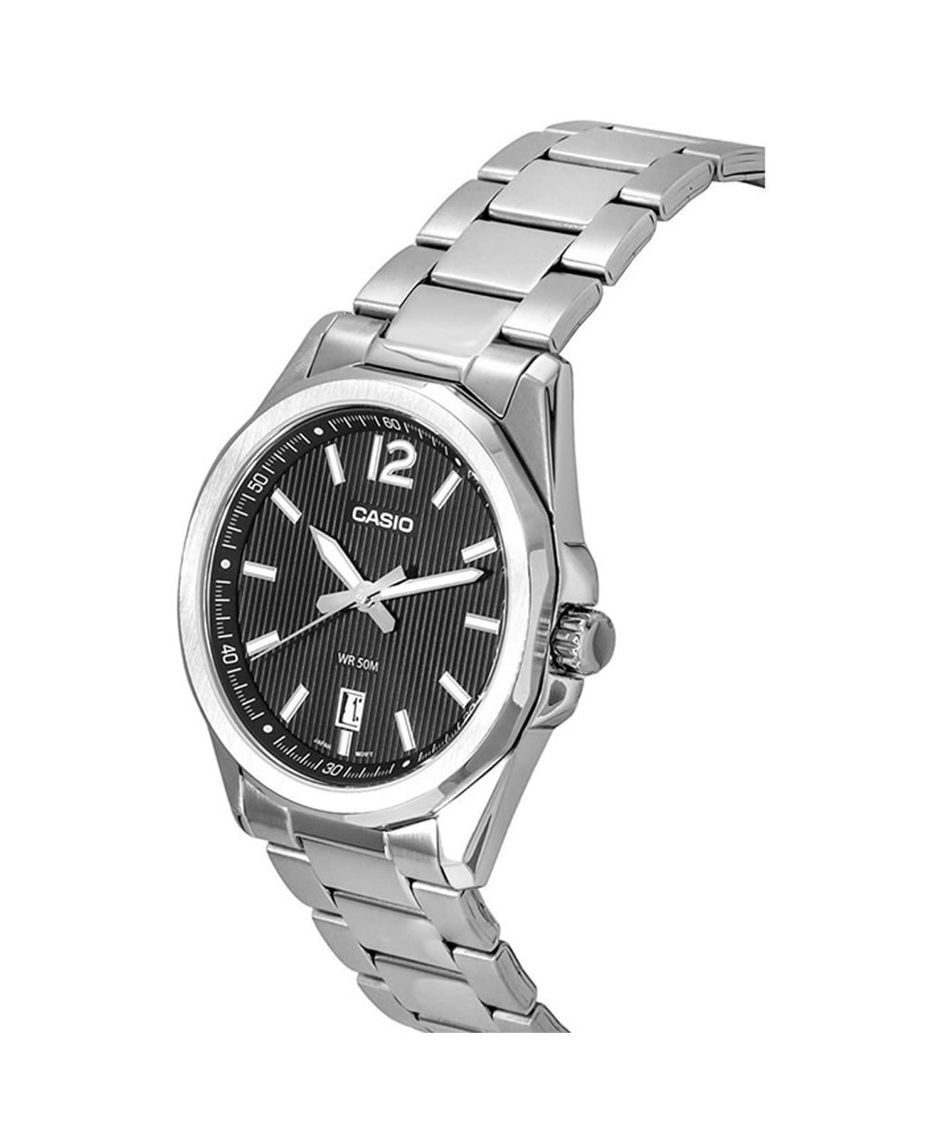 Японские мужские часы с минеральным стекломМинеральное стеклоМинеральное стекло представляет собой искусственно выращенный минерал кварца. Такое стекло отличается особой устойчивостью к повреждениям и царапинам. Уступает по некоторым качествам сапфировому стеклу. Casio Collection MTP-E725D-1A, кварцевый механизм с высокой точностью. Корпус часов изготовлен из стали. Стрелки и метки с люминесцентным покрытиемЛюминесцентное покрытиеПозволяет считывать показания времени в темноте. Производители наносят на стрелки, часовые индексы, безель или поверхность циферблата светонакопительный состав, дающий холодное свечение.. Метки в виде штрихов. Окошко даты находится в положении 6 часов. Заводная головка с защитой. Класс водозащиты: 50 метров, позволит защитить корпус от случайных брызг или капель дождя. Стальной браслет на раскладной застёжкеРаскладная застёжкаТакой тип застёжки используется только на браслетах из металла. Она никогда не раскрывается полностью, происходит разделение на 2 и более частей. Раскладывающая застёжка снизит вероятность потери часов к минимуму..