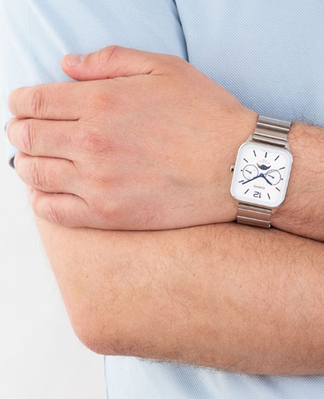Японские мужские кварцевые часы с минеральным стекломМинеральное стеклоМинеральное стекло представляет собой искусственно выращенный минерал кварца. Такое стекло отличается особой устойчивостью к повреждениям и царапинам. Уступает по некоторым качествам сапфировому стеклу. Casio Collection MTP-M305D-7A, кварцевый механизм с высокой точностью. Корпус часов изготовлен из нержавеющей стали. Циферблат с метками в виде штрихов. Особенностью модели является наличие индикатора фазы луны над шестью часами по циферблату. Индикатор имеет 4 положения и отображается новолуние и полнолуние, а также растущую и убывающую Луну. Батарейка рассчитана на 3 года. Класс водозащиты: 50 метров, позволит защитить корпус от случайных брызг или капель дождя. Стальной браслет на раскладной застёжкеРаскладная застёжкаТакой тип застёжки используется только на браслетах из металла. Она никогда не раскрывается полностью, происходит разделение на 2 и более частей. Раскладывающая застёжка снизит вероятность потери часов к минимуму..