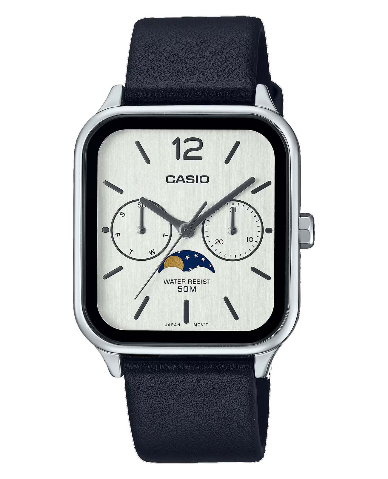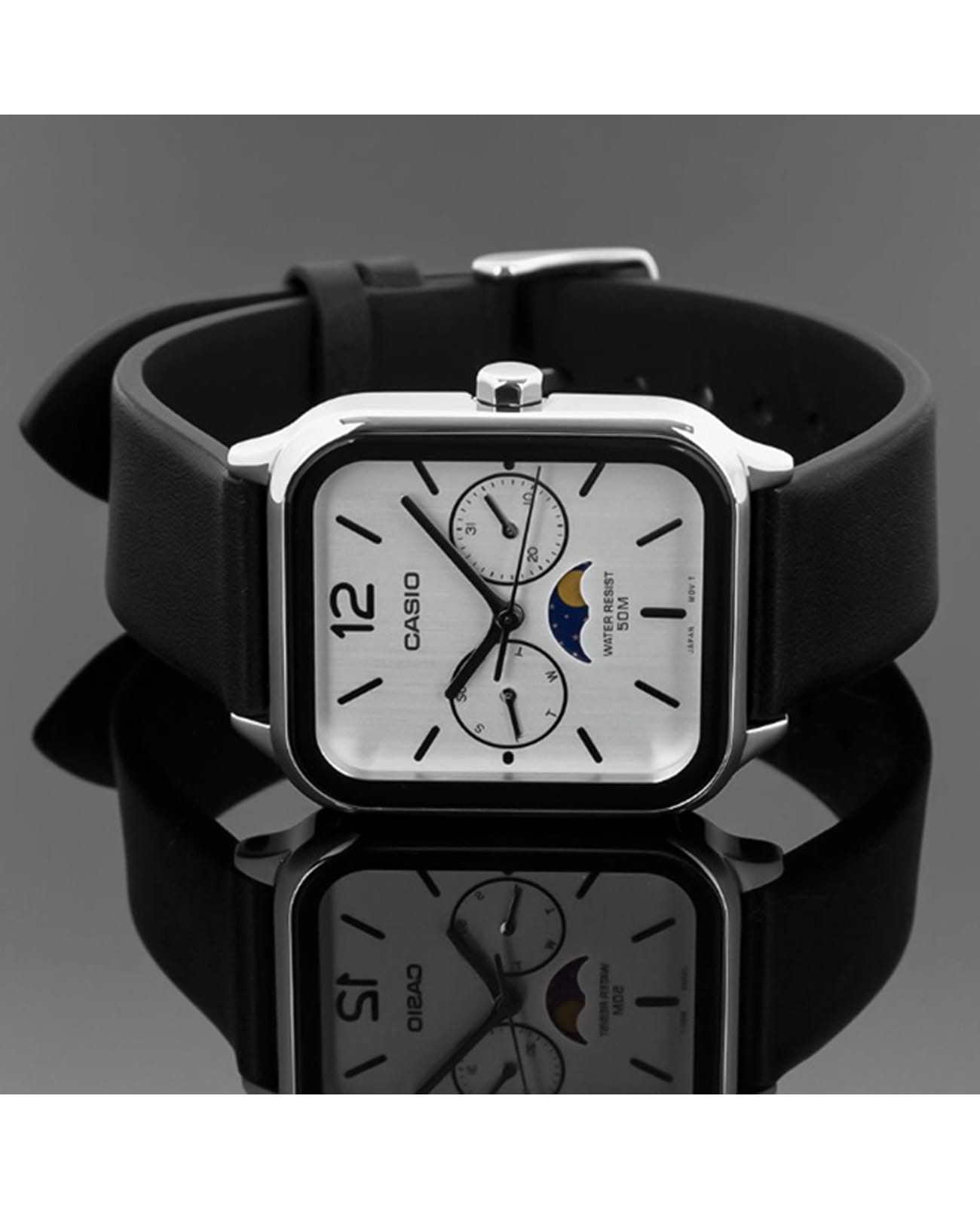 Японские мужские кварцевые часы с минеральным стекломМинеральное стеклоМинеральное стекло представляет собой искусственно выращенный минерал кварца. Такое стекло отличается особой устойчивостью к повреждениям и царапинам. Уступает по некоторым качествам сапфировому стеклу. Casio Collection MTP-M305L-7A, кварцевый механизм с высокой точностью. Корпус часов изготовлен из нержавеющей стали. Циферблат с метками в виде штрихов. Особенностью модели является наличие индикатора фазы луны над шестью часами по циферблату. Индикатор имеет 4 положения и отображается новолуние и полнолуние, а также растущую и убывающую Луну. Батарейка рассчитана на 3 года. Класс водозащиты: 50 метров, позволит защитить корпус от случайных брызг или капель дождя. Кожаный ремешок на стандартной застежке.