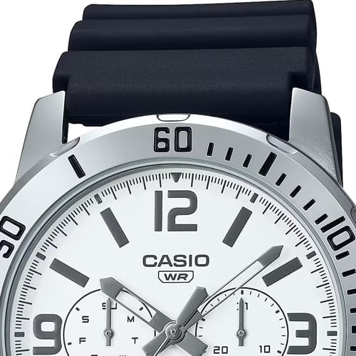 Японские мужские наручные часы с минеральным стекломМинеральное стеклоМинеральное стекло представляет собой искусственно выращенный минерал кварца. Такое стекло отличается особой устойчивостью к повреждениям и царапинам. Уступает по некоторым качествам сапфировому стеклу. Casio Collection MTP-VD300-7B, кварцевый механизм с высокой точностью. Аксессуар в классическом серебристом исполнении корпуса, с черным ремешком никогда не утратит актуальности, он будет прекрасным дополнением к классическому костюму, спортивной футболке, модных джинсах. Компактный циферблат выполнен в минималистичном стиле. Метки в виде штрихов и арабских цифр. 12-ти и 24-х часовой формат времени, число и день недели вынесены на отдельные циферблаты. Заводная головка с защитой. Батарея рассчитана на 3 года. Класс водозащиты: 50 метров, позволит защитить корпус от случайных брызг или капель дождя. Кожаный ремешок на стандартной застежке.