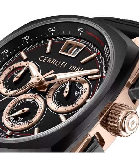 Мужские кварцевые часы Cerruti 1881 Cuneo CIWGO0085102 — спортивный аксессуар с французским дизайном и расширенным функционалом. Корпус из нержавеющей стали 316L с IP-покрытиемIP-покрытиеМетод ионного напыления. Демонстрирует повышенную устойчивость к истиранию, окислению и химическим веществам. Под воздействием высокого давления и температуры около 1500°C молекулы металла надёжно соединяются с частицами корпуса часов., размером 41.3 мм. Циферблат — чёрный с золотыми элементами, с штриховыми метками и окошком даты в положении 12 часов. Стекло — минеральноеМинеральное стеклоМинеральное стекло представляет собой искусственно выращенный минерал кварца. Такое стекло отличается особой устойчивостью к повреждениям и царапинам. Уступает по некоторым качествам сапфировому стеклу. с сапфировым покрытием. Стрелки и метки с люминесцентным покрытиемЛюминесцентное покрытиеПозволяет считывать показания времени в темноте. Производители наносят на стрелки, часовые индексы, безель или поверхность циферблата светонакопительный состав, дающий холодное свечение.. Функции: хронографХронографФункция позволяет измерять отрезки времени с особой точностью: часы, минуты, секунды. Верным признаком хронографа является наличие на циферблате 3 дополнительных окошек-счётчиков., тахиметрТахиметрРазмеченная шкала, располагается на ободке или безеле часов. Тахиметр позволяет рассчитать скорость на определённом участке пути, расстояние измеряется в километрах или милях., секундомер. Ремешок — чёрный силиконовый на стандартной застёжке. Водонепроницаемость 50 м. Идеальный выбор для тех, кто ценит французский дизайн и спортивный стиль.