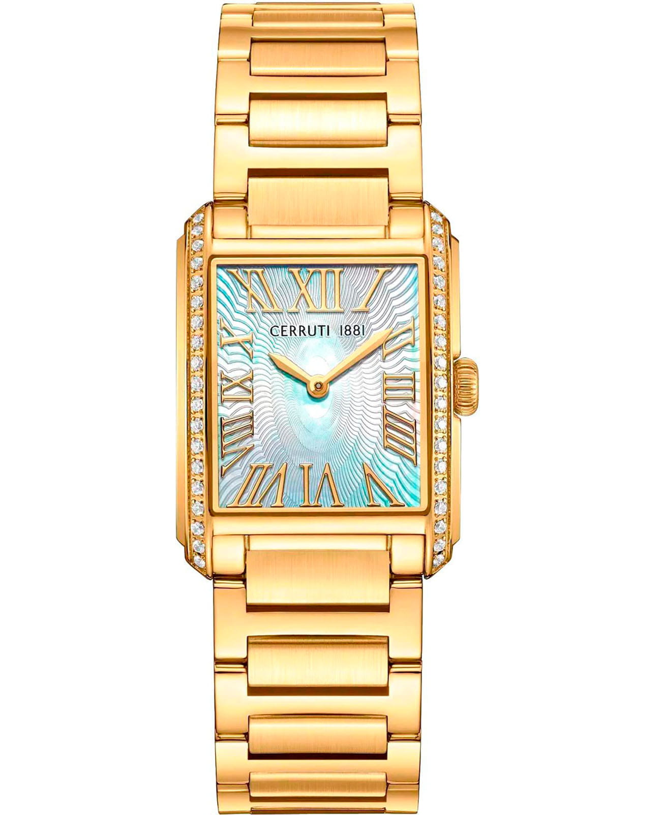 Женские кварцевые часы Cerruti 1881 Rendena CIWLG0086102 — изысканная итальянская элегантность в миниатюрном прямоугольном корпусе. Корпус из нержавеющей стали 316L с PVD-покрытиемPVDУльтратонкое покрытие наносится в технике вакуумного напыления, сочетает в себе нитрид титана особой прочности со слоем золота или оксида хрома. Несёт в себе декоративную или защитную функцию. украшен кристаллами, размером 24,5 × 32,5 мм. Циферблат — белый перламутровый с узором в виде волн и римскими цифрами. Стекло — минеральноеМинеральное стеклоМинеральное стекло представляет собой искусственно выращенный минерал кварца. Такое стекло отличается особой устойчивостью к повреждениям и царапинам. Уступает по некоторым качествам сапфировому стеклу. с сапфировым покрытием. Браслет — стальной с PVD-покрытиемPVDУльтратонкое покрытие наносится в технике вакуумного напыления, сочетает в себе нитрид титана особой прочности со слоем золота или оксида хрома. Несёт в себе декоративную или защитную функцию. на застёжке «бабочка» с кнопкамиЗастёжка "бабочка"Такой вид застёжки дополняется предохранителями, помогающими избежать случайного раскрытия браслета. Обладают изящным исполнением. . Водонепроницаемость 50 м. Идеальный выбор для тех, кто ценит итальянский дизайн и утончённую женственность.
