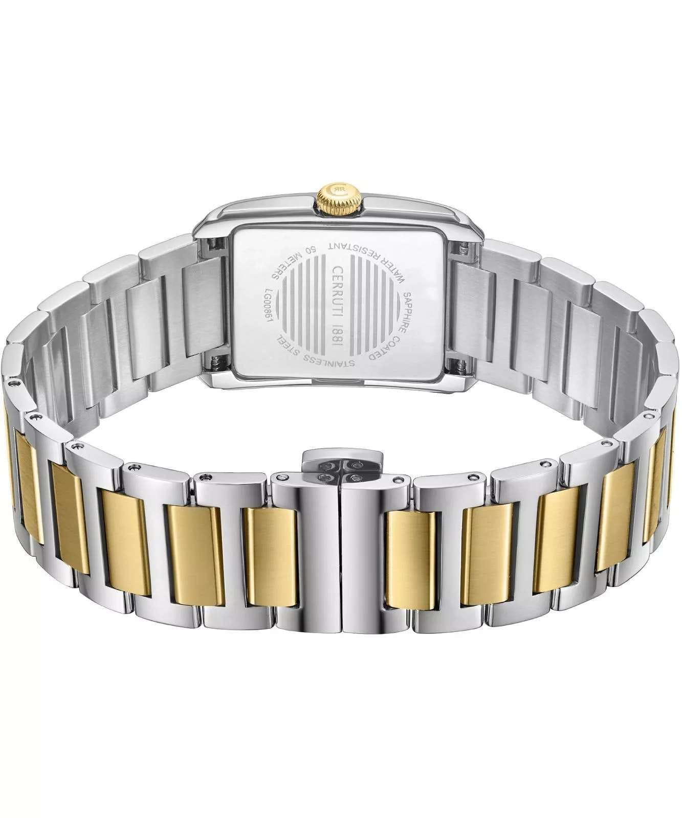Женские кварцевые часы Cerruti 1881 Rendena CIWLG0086104 — изысканная итальянская элегантность в миниатюрном прямоугольном корпусе. Корпус из нержавеющей стали 316L украшен кристаллами, размером 24,5 × 32,5 мм. Циферблат — перламутровый с узором в виде волн и римскими цифрами. Стекло — минеральноеМинеральное стеклоМинеральное стекло представляет собой искусственно выращенный минерал кварца. Такое стекло отличается особой устойчивостью к повреждениям и царапинам. Уступает по некоторым качествам сапфировому стеклу. с сапфировым покрытием. Браслет — стальной с частичным PVD-покрытиемPVDУльтратонкое покрытие наносится в технике вакуумного напыления, сочетает в себе нитрид титана особой прочности со слоем золота или оксида хрома. Несёт в себе декоративную или защитную функцию. на застёжке «бабочка» с кнопкамиЗастёжка "бабочка"Такой вид застёжки дополняется предохранителями, помогающими избежать случайного раскрытия браслета. Обладают изящным исполнением. . Водонепроницаемость 50 м. Идеальный выбор для тех, кто ценит итальянский дизайн и утончённую женственность.