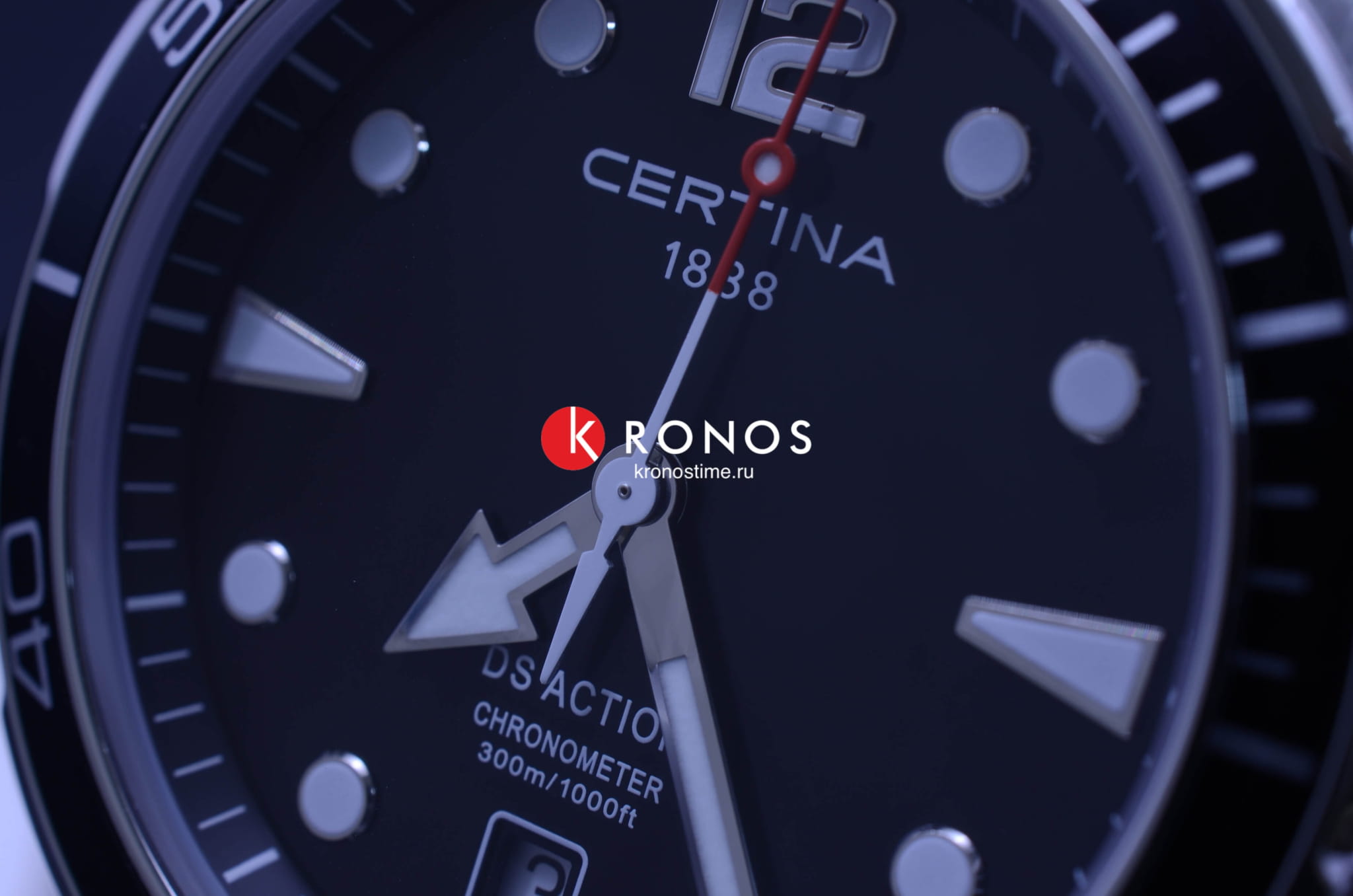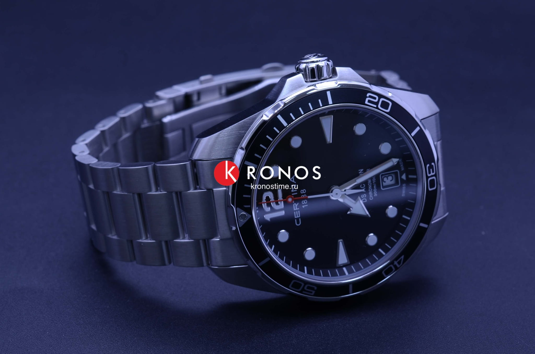 Это превосходная модель в серебристо-чёрной расцветке для тех, кто не готов соглашаться на меньшее. Наручные часы отличаются безупречными характеристиками по всем параметрам: ударопрочный корпусУдаропрочный корпусМеханизм заключён в корпус, выполненный из современных материалов, устойчивых к ударам, механическим повреждениям и падению с высоты: инновационный пластик, карбон, нержавеющая сталь, титан. из хирургической стали 316L, устойчивое к царапинам сапфировое стекло с антибликовой поверхностью, водостойкость до 30 бар, повышенная точность хода кварцевого швейцарского калибра ETA F07.412 Precidrive™Precidrive™Инновационный кварцевый механизм Certina. Часы, оснащённые этим швейцарским калибром, приравниваются к точности к сертифицированным хронометрам, точность хода составляет +/-10 секунд в год., подтверждённая сертификатом COSCСертификат COSCОфициальный сертификат, подтверждающий то, что часы ходят с особо высокой точностью. Для получения документа часы подвергаются тестовым испытаниям, разработанным швейцарским институтом тестирования хронометров COSC. Допустимая норма для механических часов -4/+6 секунд в день, для кварцевых моделей +/- 0,07 секунд в день.. Алюминиевый вращающийся безельБезельВнешний ободок, закрепляющий стекло. В спортивных часах так называется поворотное кольцо с делениями на циферблате, выполняет роль таймера – замеряет отрезки времени на шкале. Неподвижный безель – элемент декора. Однонаправленно вращающийся безель на дайверских часах позволяет фиксировать моменты погружения и выныривания на поверхность.. Закручивающиеся кнопки, заводная головка с системой защиты, задняя крышка. Индикатор EOLEOLПредставляет собой систему, уведомляющую владельца часов о необходимости замены элемента питания. За 2 недели до полного разряда батарейки секундная стрелка перестаёт ходить чётко и начинает перепрыгивать на 3-4 деления.. Апертура даты. Застёжка с фиксатором и удлинением для дайверовУдлинение для дайверовЗастёжка с удлинением для дайверов представляет собой безопасное крепление, которое позволяет надевать часы поверх гидрокостюма. Гибкая застёжка удлиняется на 1-2 миллиметра.. Диаметр корпуса: 43 мм.