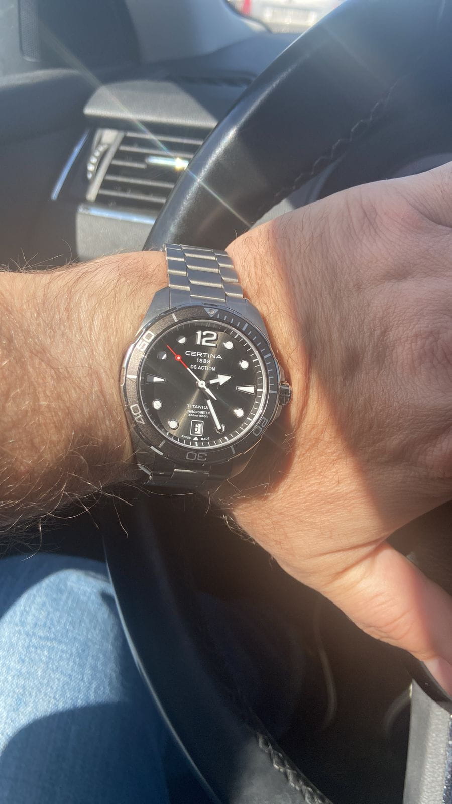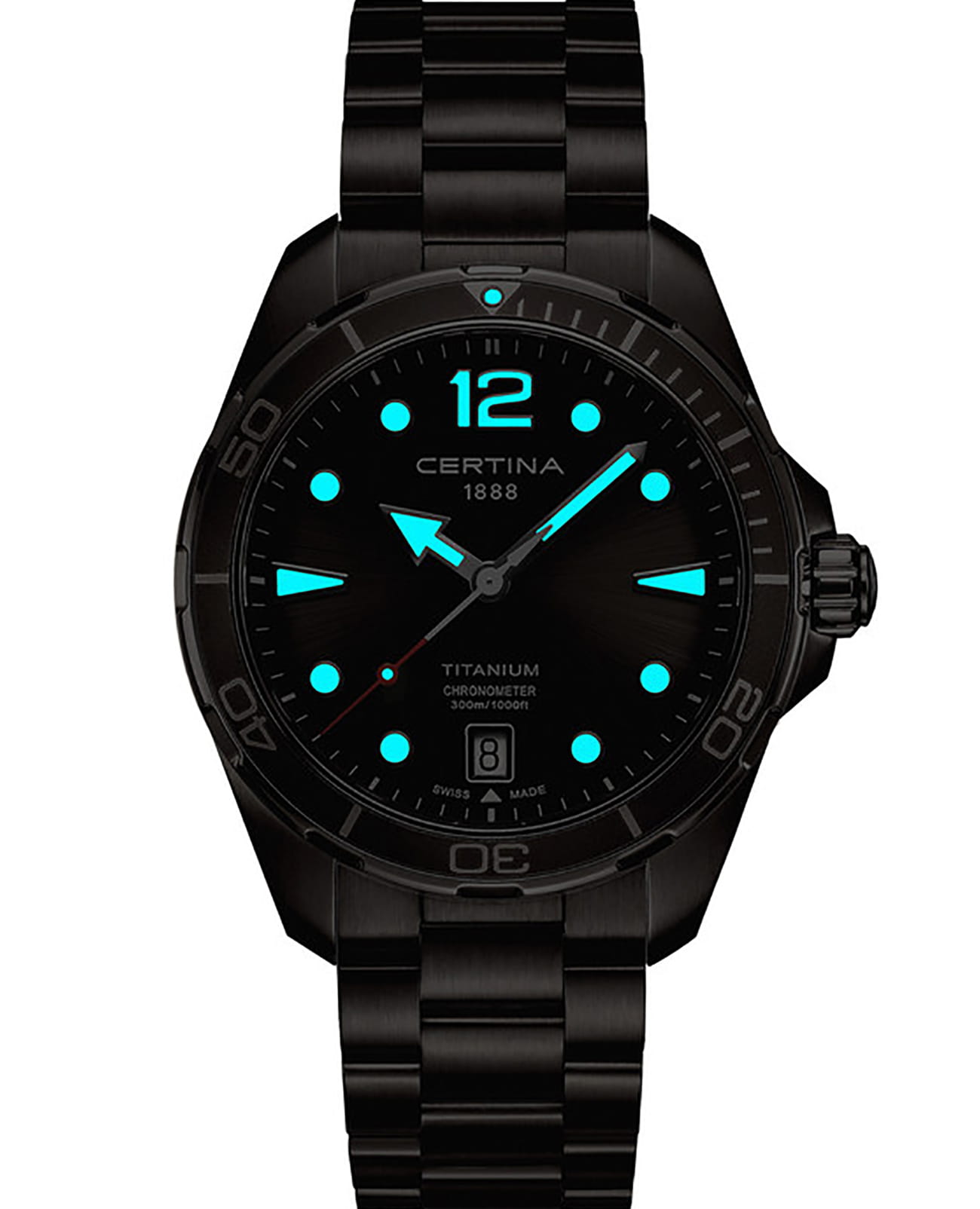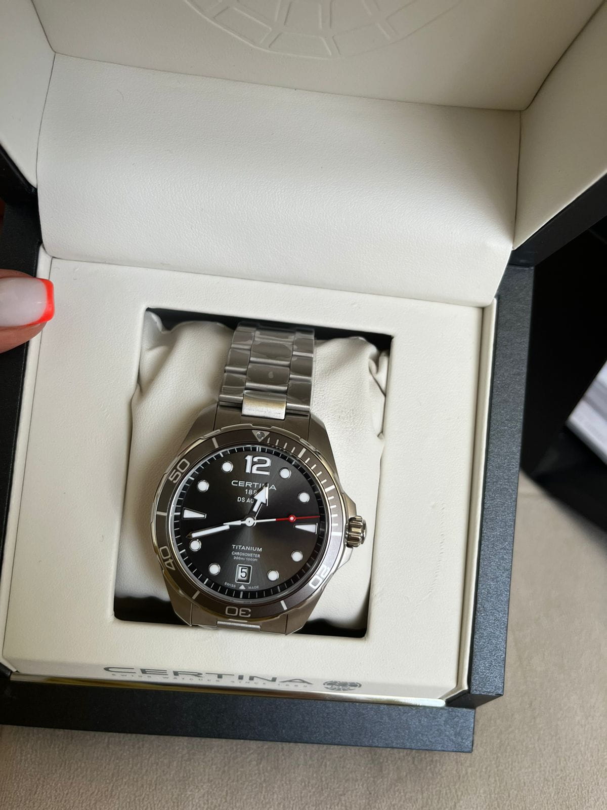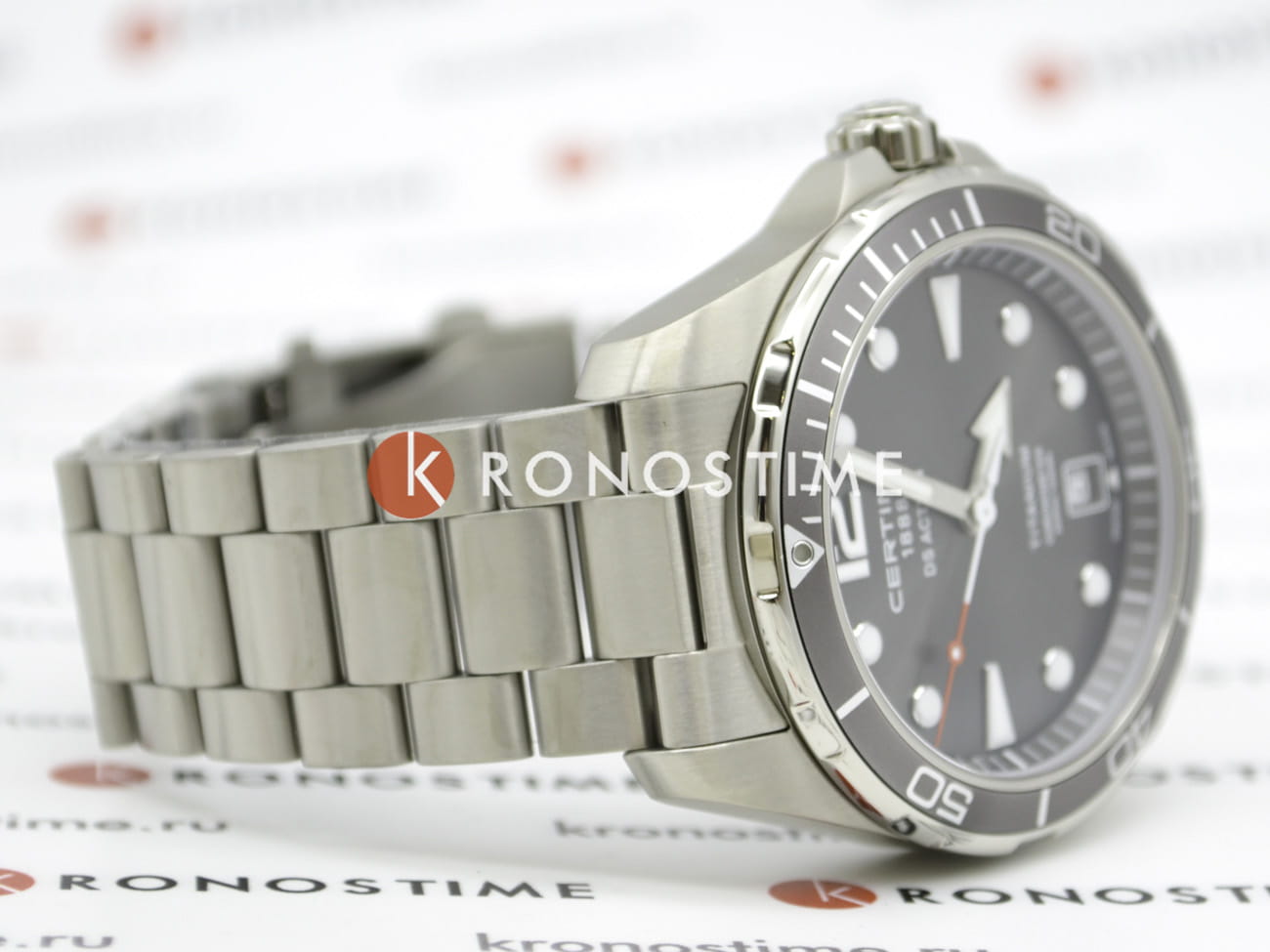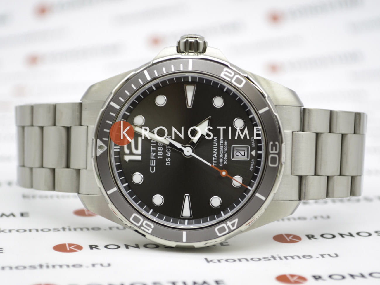 Брендовый аксессуар с антрацитовым циферблатом - идеальное дополнение как к деловому, так и к повседневному стилю. Модель отличается предельной точностью швейцарского кварцевого механизма ETA F07.412 Precidrive™Precidrive™Инновационный кварцевый механизм Certina. Часы, оснащённые этим швейцарским калибром, приравниваются к точности к сертифицированным хронометрам, точность хода составляет +/-10 секунд в год., что подтверждается официальным сертификатом COSCСертификат COSCОфициальный сертификат, подтверждающий то, что часы ходят с особо высокой точностью. Для получения документа часы подвергаются тестовым испытаниям, разработанным швейцарским институтом тестирования хронометров COSC. Допустимая норма для механических часов -4/+6 секунд в день, для кварцевых моделей +/- 0,07 секунд в день.. Высокое качество проявляет себя невооружённым глазом: титановый ударопрочный корпусУдаропрочный корпусМеханизм заключён в корпус, выполненный из современных материалов, устойчивых к ударам, механическим повреждениям и падению с высоты: инновационный пластик, карбон, нержавеющая сталь, титан. с антимагнитными свойствами, водонепроницаемость до 30 бар, сапфировое стекло, устойчивое к образованию царапин, реализация фирменной разработки DS Concept DS ConceptDouble Security Concept, обозначает двойную надёжность и безупречную точность часов Certina. Двойная система защиты подразумевает обеспечение максимальной устойчивости к ударам и высоких показателей водонепроницаемости.. Завинчивающаяся заводная головка с защитой. Закручивающиеся кнопки и задняя крышка. Одностороннее антибликовое покрытие для стекла. Вращающийся безельБезельВнешний ободок, закрепляющий стекло. В спортивных часах так называется поворотное кольцо с делениями на циферблате, выполняет роль таймера – замеряет отрезки времени на шкале. Неподвижный безель – элемент декора. Однонаправленно вращающийся безель на дайверских часах позволяет фиксировать моменты погружения и выныривания на поверхность.. Отображение текущего числа. Индикатор EOLEOLПредставляет собой систему, уведомляющую владельца часов о необходимости замены элемента питания. За 2 недели до полного разряда батарейки секундная стрелка перестаёт ходить чётко и начинает перепрыгивать на 3-4 деления.. Дайверская застёжка с фиксатором и специальным удлинениемУдлинение для дайверовЗастёжка с удлинением для дайверов представляет собой безопасное крепление, которое позволяет надевать часы поверх гидрокостюма. Гибкая застёжка удлиняется на 1-2 миллиметра.. Диаметр корпуса: 43 мм.