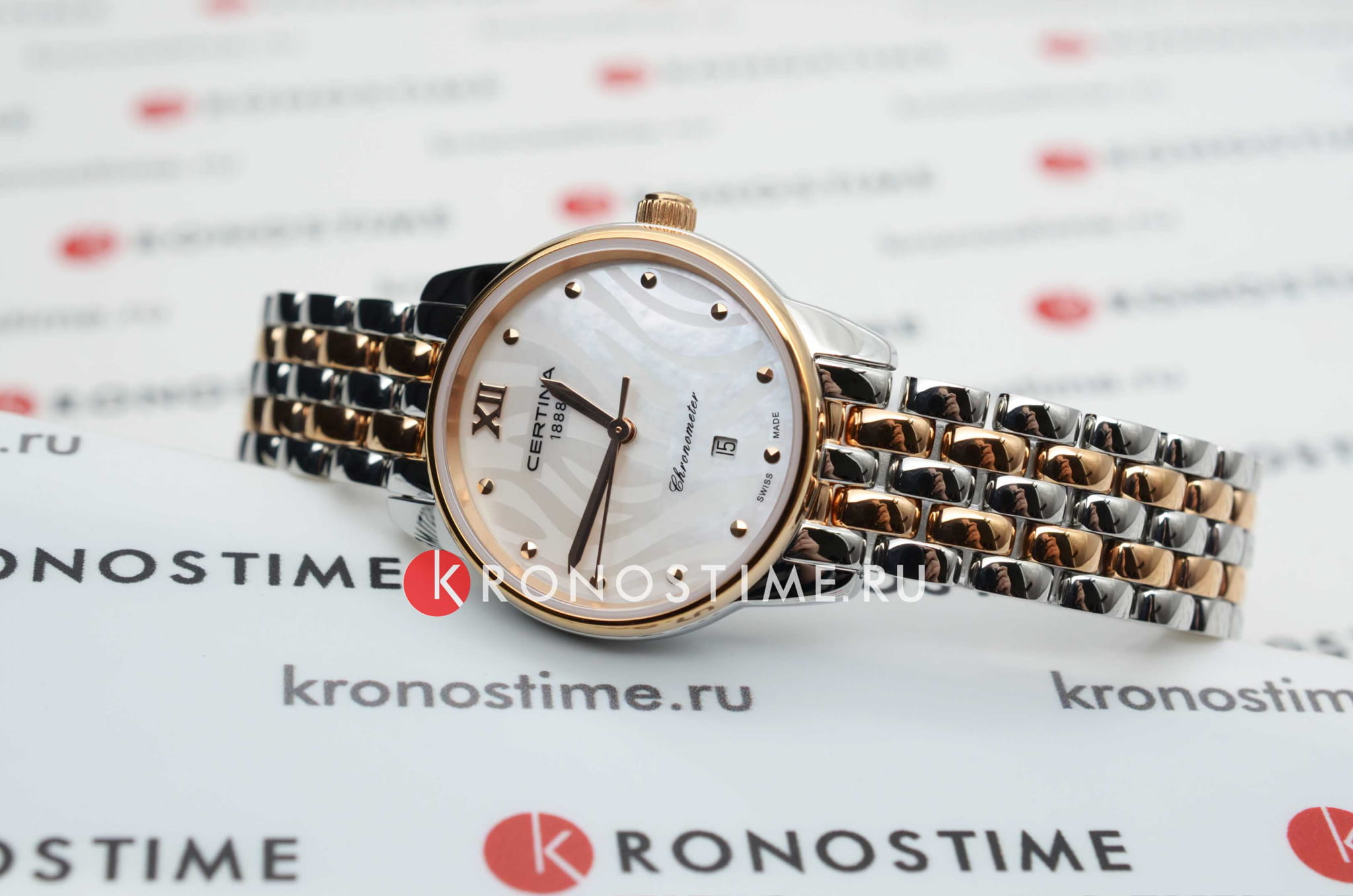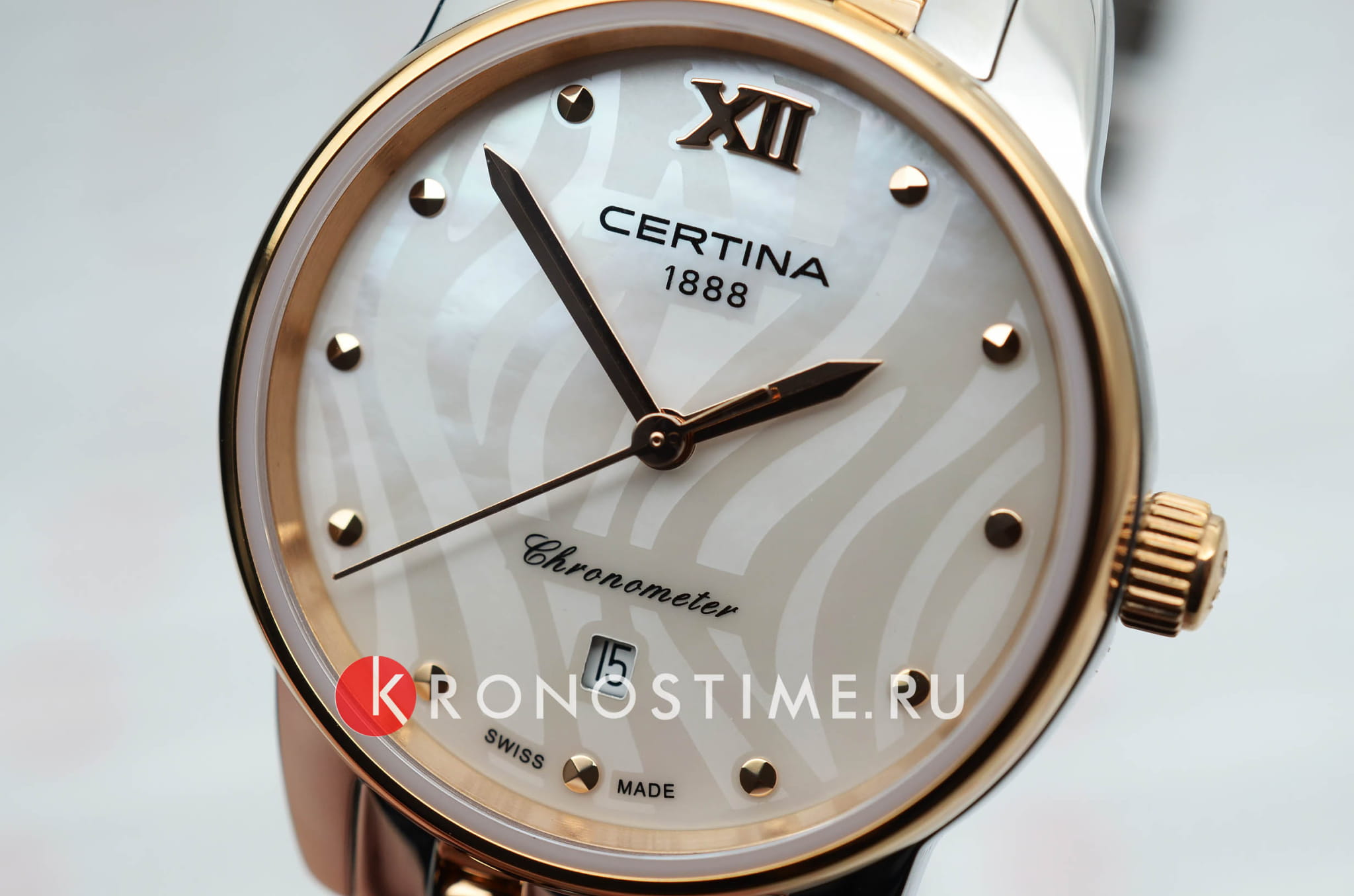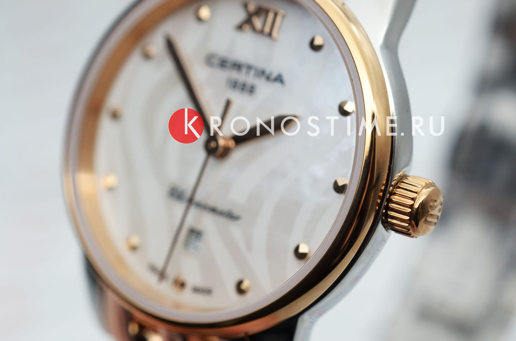 Изысканный аксессуар – лучший вариант для делового костюма или вечернего наряда. Эффектный перламутровый циферблат дополнен незатейливым узором и золотистой часовой разметкой. Часы привлекают не только дизайном, но и абсолютной точностью: швейцарский кварцевый механизм ETA G10.962 Precidrive™Precidrive™Инновационный кварцевый механизм Certina. Часы, оснащённые этим швейцарским калибром, приравниваются к точности к сертифицированным хронометрам, точность хода составляет +/-10 секунд в год. удостоился официального сертификата COSCСертификат COSCОфициальный сертификат, подтверждающий то, что часы ходят с особо высокой точностью. Для получения документа часы подвергаются тестовым испытаниям, разработанным швейцарским институтом тестирования хронометров COSC. Допустимая норма для механических часов -4/+6 секунд в день, для кварцевых моделей +/- 0,07 секунд в день.. Система DS ConceptDS ConceptDouble Security Concept, обозначает двойную надёжность и безупречную точность часов Certina. Двойная система защиты подразумевает обеспечение максимальной устойчивости к ударам и высоких показателей водонепроницаемости.. Нержавеющая сталь 316L с PVD-покрытиемPVDУльтратонкое покрытие наносится в технике вакуумного напыления, сочетает в себе нитрид титана особой прочности со слоем золота или оксида хрома. Несёт в себе декоративную или защитную функцию.. Степень водозащиты WR 100. Сапфировое стекло с антибликовой обработкой. . Отображение числа, индикатор EOLEOLПредставляет собой систему, уведомляющую владельца часов о необходимости замены элемента питания. За 2 недели до полного разряда батарейки секундная стрелка перестаёт ходить чётко и начинает перепрыгивать на 3-4 деления.. Диаметр корпуса: 27,5 мм.