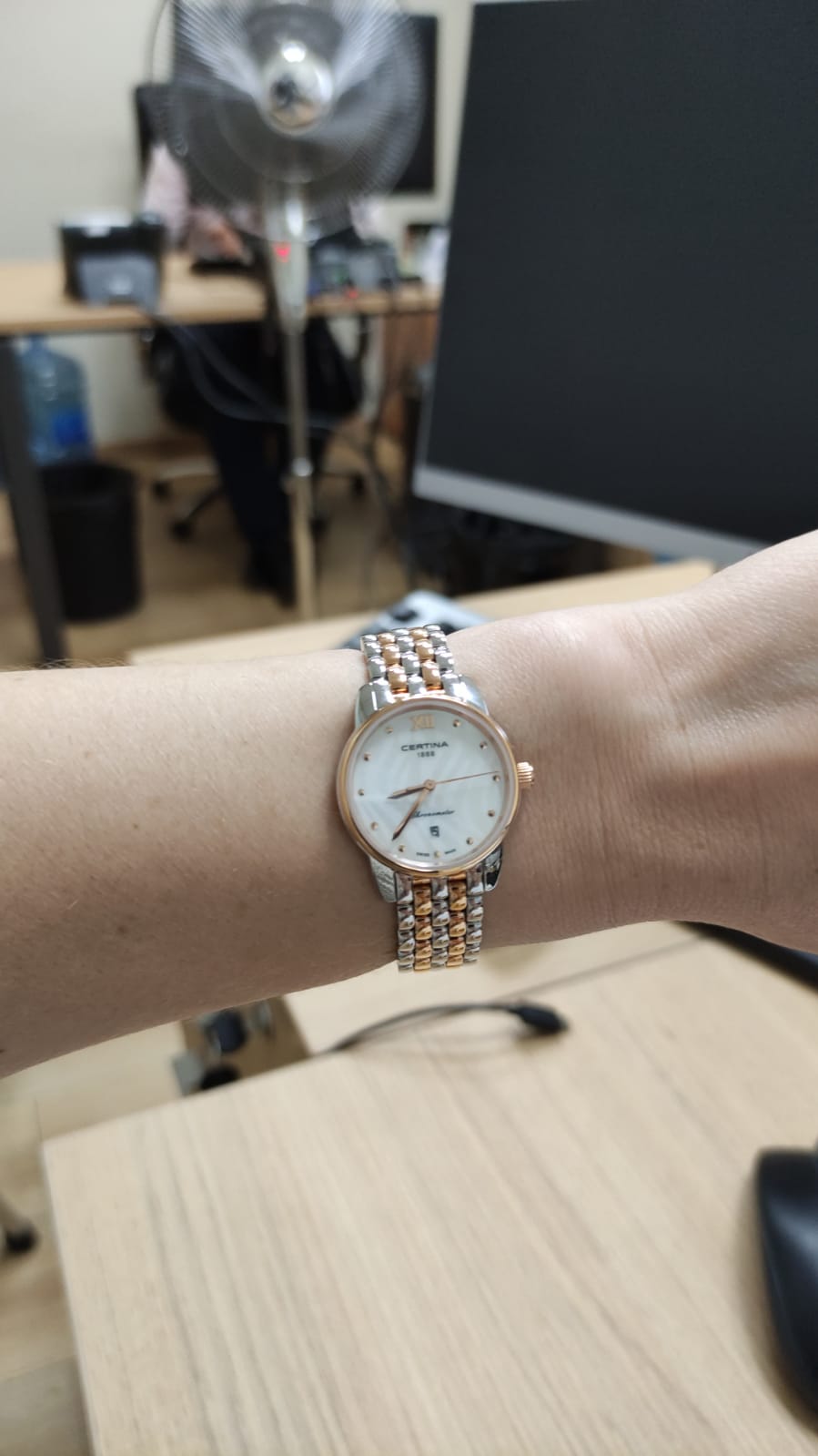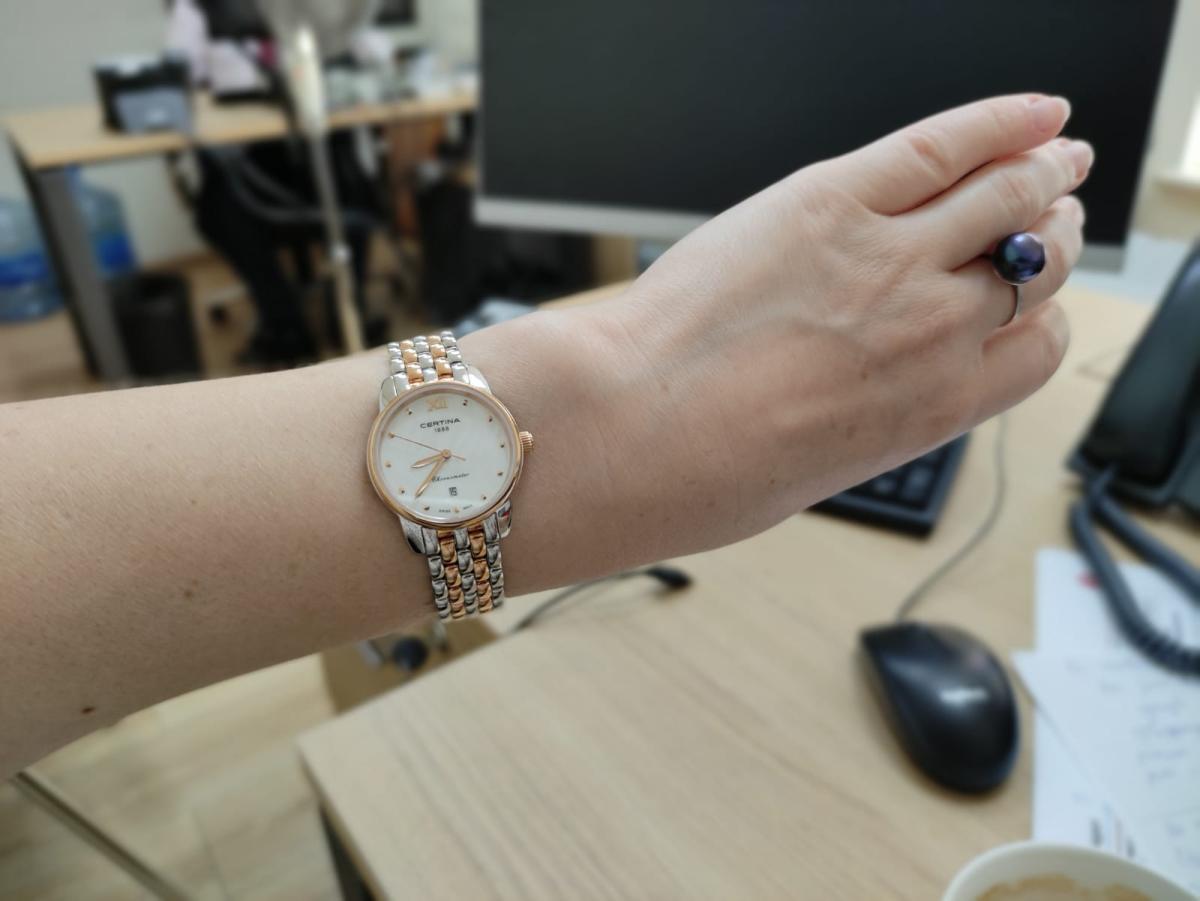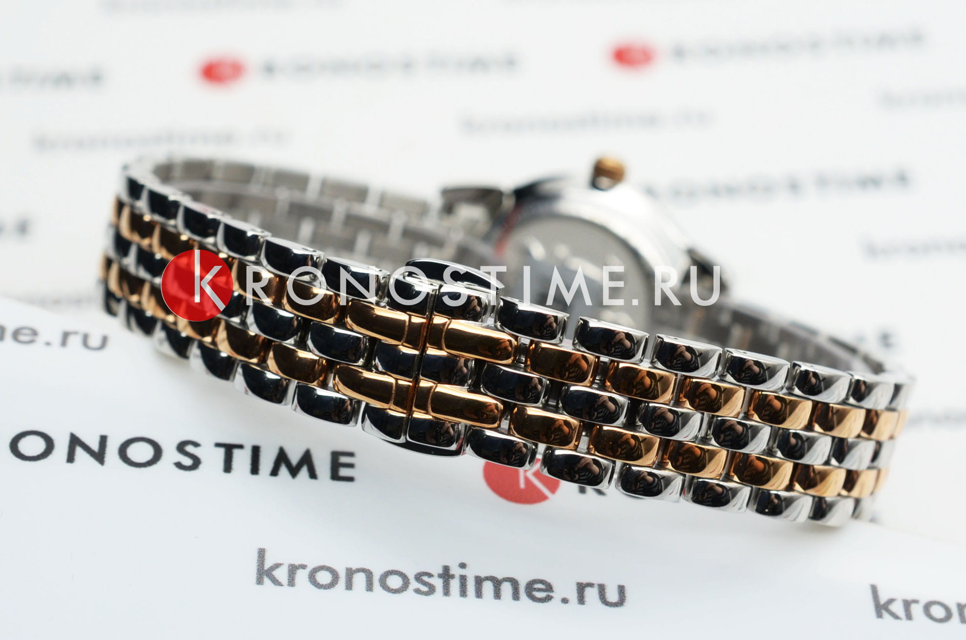 Изысканный аксессуар – лучший вариант для делового костюма или вечернего наряда. Эффектный перламутровый циферблат дополнен незатейливым узором и золотистой часовой разметкой. Часы привлекают не только дизайном, но и абсолютной точностью: швейцарский кварцевый механизм ETA G10.962 Precidrive™Precidrive™Инновационный кварцевый механизм Certina. Часы, оснащённые этим швейцарским калибром, приравниваются к точности к сертифицированным хронометрам, точность хода составляет +/-10 секунд в год. удостоился официального сертификата COSCСертификат COSCОфициальный сертификат, подтверждающий то, что часы ходят с особо высокой точностью. Для получения документа часы подвергаются тестовым испытаниям, разработанным швейцарским институтом тестирования хронометров COSC. Допустимая норма для механических часов -4/+6 секунд в день, для кварцевых моделей +/- 0,07 секунд в день.. Система DS ConceptDS ConceptDouble Security Concept, обозначает двойную надёжность и безупречную точность часов Certina. Двойная система защиты подразумевает обеспечение максимальной устойчивости к ударам и высоких показателей водонепроницаемости.. Нержавеющая сталь 316L с PVD-покрытиемPVDУльтратонкое покрытие наносится в технике вакуумного напыления, сочетает в себе нитрид титана особой прочности со слоем золота или оксида хрома. Несёт в себе декоративную или защитную функцию.. Степень водозащиты WR 100. Сапфировое стекло с антибликовой обработкой. . Отображение числа, индикатор EOLEOLПредставляет собой систему, уведомляющую владельца часов о необходимости замены элемента питания. За 2 недели до полного разряда батарейки секундная стрелка перестаёт ходить чётко и начинает перепрыгивать на 3-4 деления.. Диаметр корпуса: 27,5 мм.