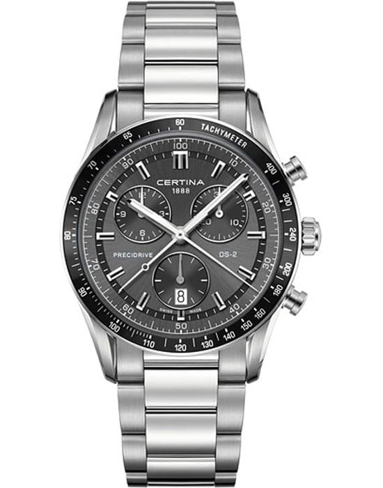 Брендовый аксессуар сразу притягивает внимание. Чёрный циферблат, дополненный контрастными элементами и функциональными окошками, отражает спортивную динамичность. Алюминиевый безельБезельВнешний ободок, закрепляющий стекло. В спортивных часах так называется поворотное кольцо с делениями на циферблате, выполняет роль таймера – замеряет отрезки времени на шкале. Неподвижный безель – элемент декора. Однонаправленно вращающийся безель на дайверских часах позволяет фиксировать моменты погружения и выныривания на поверхность. размечен шкалой тахиметраТахиметрРазмеченная шкала, располагается на ободке или безеле часов. Тахиметр позволяет рассчитать скорость на определённом участке пути, расстояние измеряется в километрах или милях.. Часы основаны на концепции Double SecurityDS ConceptDouble Security Concept, обозначает двойную надёжность и безупречную точность часов Certina. Двойная система защиты подразумевает обеспечение максимальной устойчивости к ударам и высоких показателей водонепроницаемости., что свидетельствует о высокой устойчивости к ударам и водонепроницаемости (до 10 бар) модели. Швейцарский кварцевый калибр ETA 251.264 Precidrive™Precidrive™Инновационный кварцевый механизм Certina. Часы, оснащённые этим швейцарским калибром, приравниваются к точности к сертифицированным хронометрам, точность хода составляет +/-10 секунд в год., измеряющий время с точностью до одной сотой секунды. Двухстороннее антибликовое покрытие для стекла из сапфира. Корпус и браслет из стали 316L с антикоррозионными свойствами. Задняя крышка с фирменной гравировкой. ХронографХронографФункция позволяет измерять отрезки времени с особой точностью: часы, минуты, секунды. Верным признаком хронографа является наличие на циферблате 3 дополнительных окошек-счётчиков., календарь, индикатор EOLEOLПредставляет собой систему, уведомляющую владельца часов о необходимости замены элемента питания. За 2 недели до полного разряда батарейки секундная стрелка перестаёт ходить чётко и начинает перепрыгивать на 3-4 деления., секундомер. Диаметр корпуса: 41 мм.