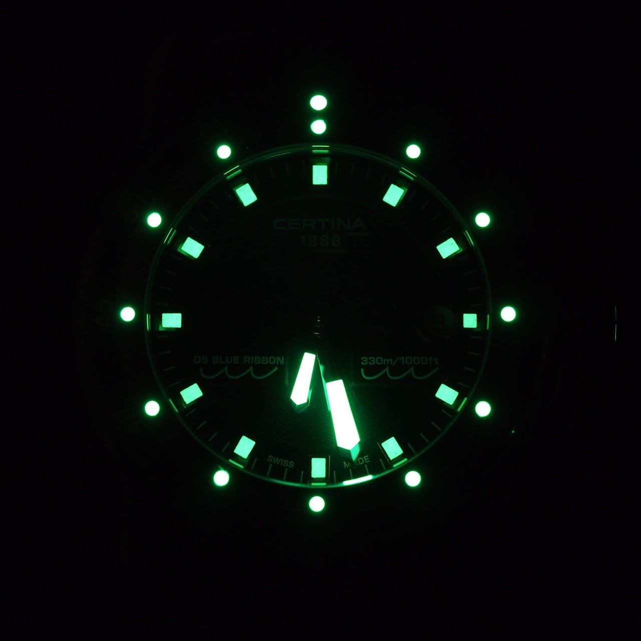 Мужские швейцарские часы с сапфировым стеклом Certina DS Blue Ribbon C007.410.11.051.01, кварцевый механизм с высокой точностью. Циферблат с люминесцентным покрытиемЛюминесцентное покрытиеПозволяет считывать показания времени в темноте. Производители наносят на стрелки, часовые индексы, безель или поверхность циферблата светонакопительный состав, дающий холодное свечение. стрелок и меток, дополнен сапфировым стекломСапфировое стеклоПрочный и надёжный материал из кристалла сапфира синтетического происхождения, характеризующийся особой твёрдостью и устойчивостью к царапинам и повреждениям., устойчивым к появлению царапин и обладающее высокой прозрачностью. Корпус часов изготовлен из стали.
