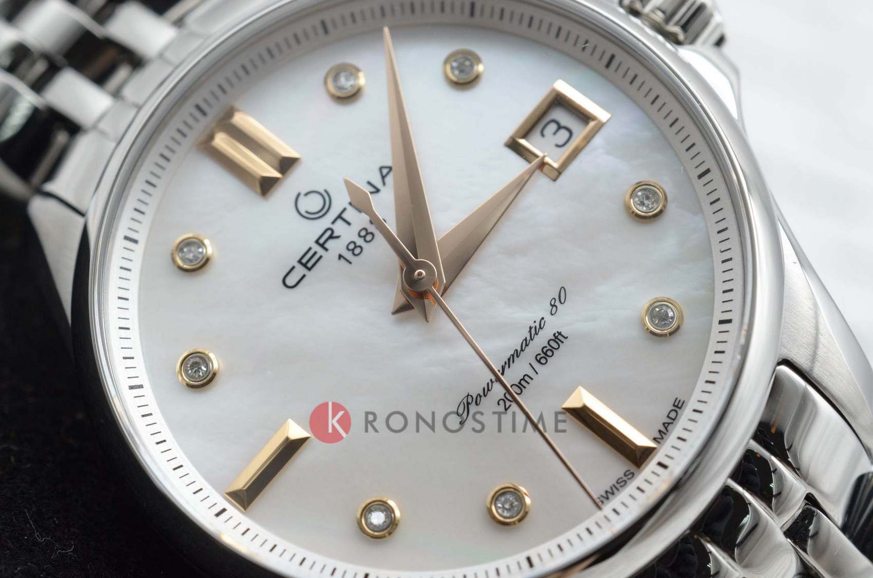 Аксессуар обладает изящным силуэтом, отражающим классический стиль и элегантность. Циферблат украшен восемью роскошными бриллиантами оттенка Top Wesselton. Калибр Powermatic с автоподзаводом не только имеет 80-часовой запас хода, но и оснащен балансирной пружиной Nivachron ™, гарантирующей надежную точность, не подверженную влиянию магнитных полей. Сверкающие бриллианты и изысканные детали создают неподвластную времени элегантность.. Концепция DS ConceptDS ConceptDouble Security Concept, обозначает двойную надёжность и безупречную точность часов Certina. Двойная система защиты подразумевает обеспечение максимальной устойчивости к ударам и высоких показателей водонепроницаемости. гарантирует повышенную ударопрочность часов и сохранение водонепроницаемости до 20 бар. Одностороннее антибликовое покрытие сапфирового стекла. Корпус и браслет из хирургической стали 316L.. Диаметр корпуса: 34,5 мм.