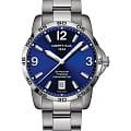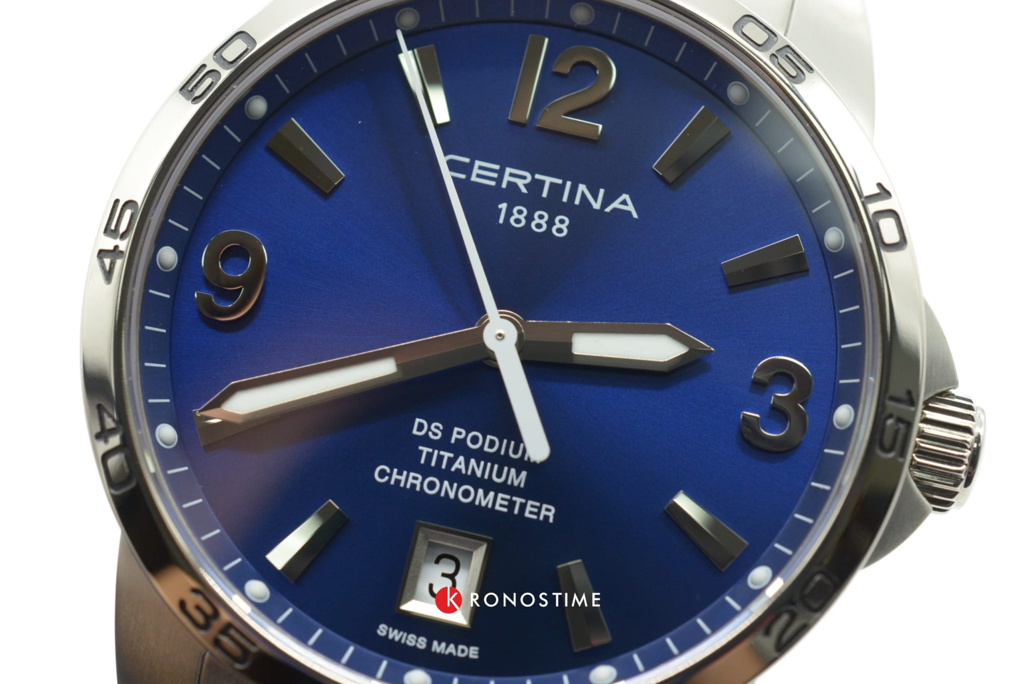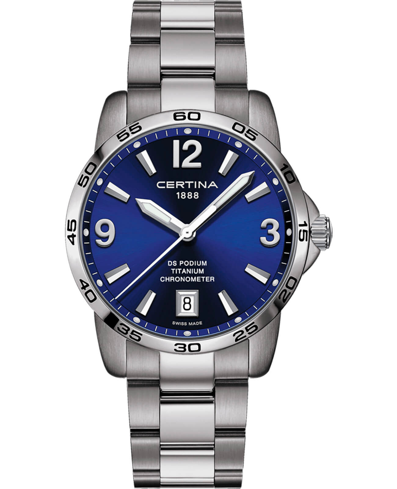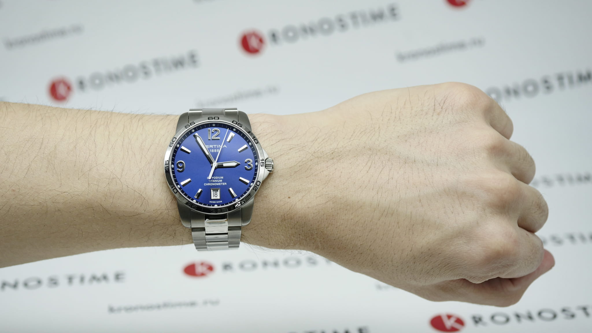 Наручные часы в спортивном стиле дополнены классическими элементами, имеют спокойную расцветку. Синий циферблат представлен в минималистичном оформлении, арабские цифры, индексы имеют контрастный оттенок. Модель оснащена швейцарским кварцевым механизмом ETA F07.412 Precidrive™Precidrive™Инновационный кварцевый механизм Certina. Часы, оснащённые этим швейцарским калибром, приравниваются к точности к сертифицированным хронометрам, точность хода составляет +/-10 секунд в год.. Безупречная точность калибра отмечена официальным сертификатом хронометра COSCСертификат COSCОфициальный сертификат, подтверждающий то, что часы ходят с особо высокой точностью. Для получения документа часы подвергаются тестовым испытаниям, разработанным швейцарским институтом тестирования хронометров COSC. Допустимая норма для механических часов -4/+6 секунд в день, для кварцевых моделей +/- 0,07 секунд в день.. Аксессуар удобен в эксплуатации, сохраняет ударопрочность и водонепроницаемость 100 метров благодаря концепции Double SecurityDS ConceptDouble Security Concept, обозначает двойную надёжность и безупречную точность часов Certina. Двойная система защиты подразумевает обеспечение максимальной устойчивости к ударам и высоких показателей водонепроницаемости.. Корпус и браслет выполнены из гипоаллергенного титана. Заводная головка с системой блокировки. Яркая люминесцентная подсветкаЛюминесцентное покрытиеПозволяет считывать показания времени в темноте. Производители наносят на стрелки, часовые индексы, безель или поверхность циферблата светонакопительный состав, дающий холодное свечение.. Индикатор EOLEOLПредставляет собой систему, уведомляющую владельца часов о необходимости замены элемента питания. За 2 недели до полного разряда батарейки секундная стрелка перестаёт ходить чётко и начинает перепрыгивать на 3-4 деления., апертура даты. Диаметр корпуса: 40 мм.