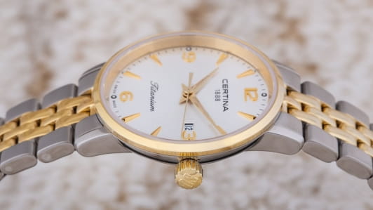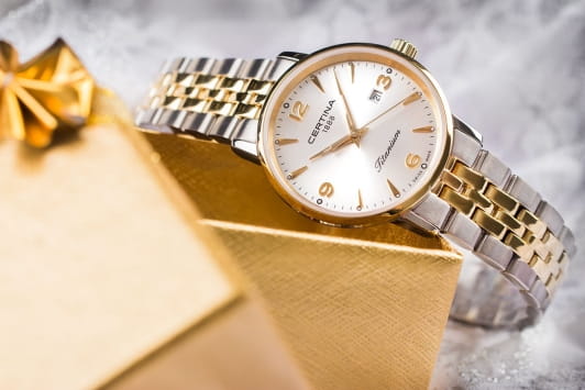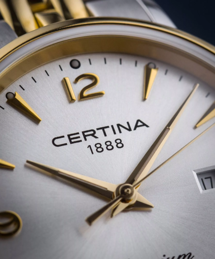 Модель отражает элегантность и изысканность. Швейцарский кварцевый механизм. Корпус и браслет из нержавеющей стали 316L с частичным PVD-покрытиемPVDУльтратонкое покрытие наносится в технике вакуумного напыления, сочетает в себе нитрид титана особой прочности со слоем золота или оксида хрома. Несёт в себе декоративную или защитную функцию.. Система DS ConceptDS ConceptDouble Security Concept, обозначает двойную надёжность и безупречную точность часов Certina. Двойная система защиты подразумевает обеспечение максимальной устойчивости к ударам и высоких показателей водонепроницаемости.. Сапфировое стекло с антибликовым покрытием. Окошко даты находится на 6 часах. Водозащита 100 метров, позволит плавать, нырять и заниматься другими водными видами спорта }.