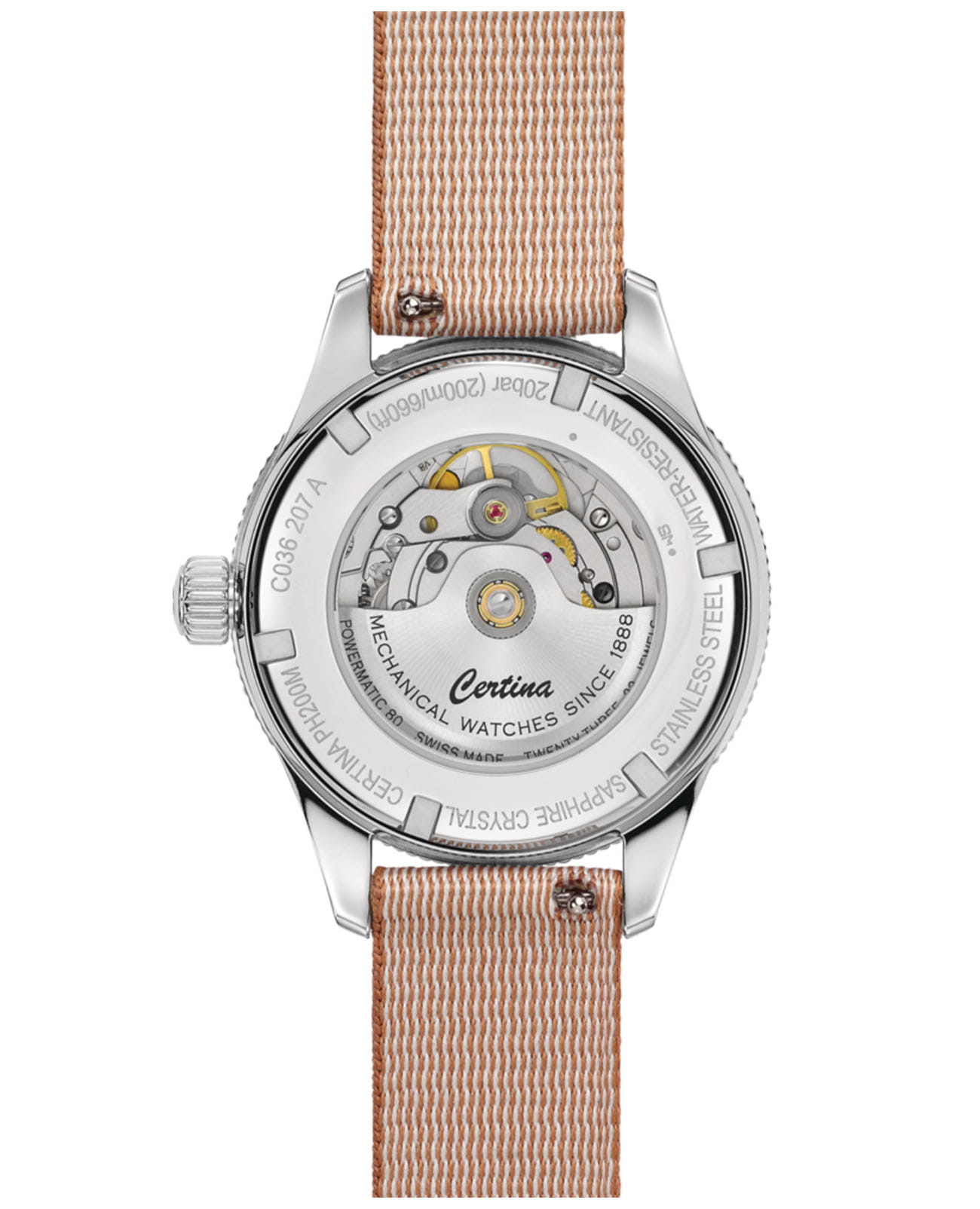 Женские швейцарские механические часы с запасом хода 80 часов Certina DS PH200M C036.207.18.106.00, механический механизм (автоматический калибр) с высокой точностью. Сапфировое стекло устойчивое к появлению царапин, обладающее высокой прозрачностью. Класс водозащиты: 200 метров, позволит плавать, нырять и заниматься другими водными видами спорта. Корпус часов изготовлен из стали, цвета.