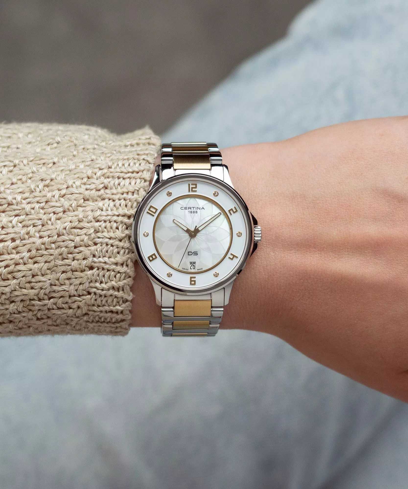 Женские кварцевые часы Certina C039.251.12.116.00 — это изысканный аксессуар, сочетающий в себе надёжность, точность и элегантный дизайн. Модель выполнена в круглой форме из нержавеющей стали с диаметром корпуса 35 мм и толщиной 8 мм, что делает её удобной для повседневного ношения. Циферблат белого цвета дополнен перламутровым покрытием и инкрустирован бриллиантами, придающими модели роскошный внешний вид. Защиту механизма обеспечивает сапфировое стеклоСапфировое стеклоПрочный и надёжный материал из кристалла сапфира синтетического происхождения, характеризующийся особой твёрдостью и устойчивостью к царапинам и повреждениям., устойчивое к царапинам и механическим повреждениям. Ремешок из нержавеющей стали серебристо-золотистого цвета оснащён классической застёжкой, обеспечивающей комфорт и надёжную фиксацию на запястье. Часы водонепроницаемы до 100 метров (, что позволяет использовать их при плавании и других водных активностях без глубокого погружения. Гарантия 2 года подтверждает качество и долговечность изделия. Эти часы станут универсальным аксессуаром для тех, кто ценит сочетание стиля, функциональности и швейцарского мастерства — идеальный выбор для повседневной носки и торжественных случаев.
