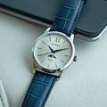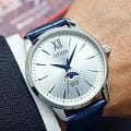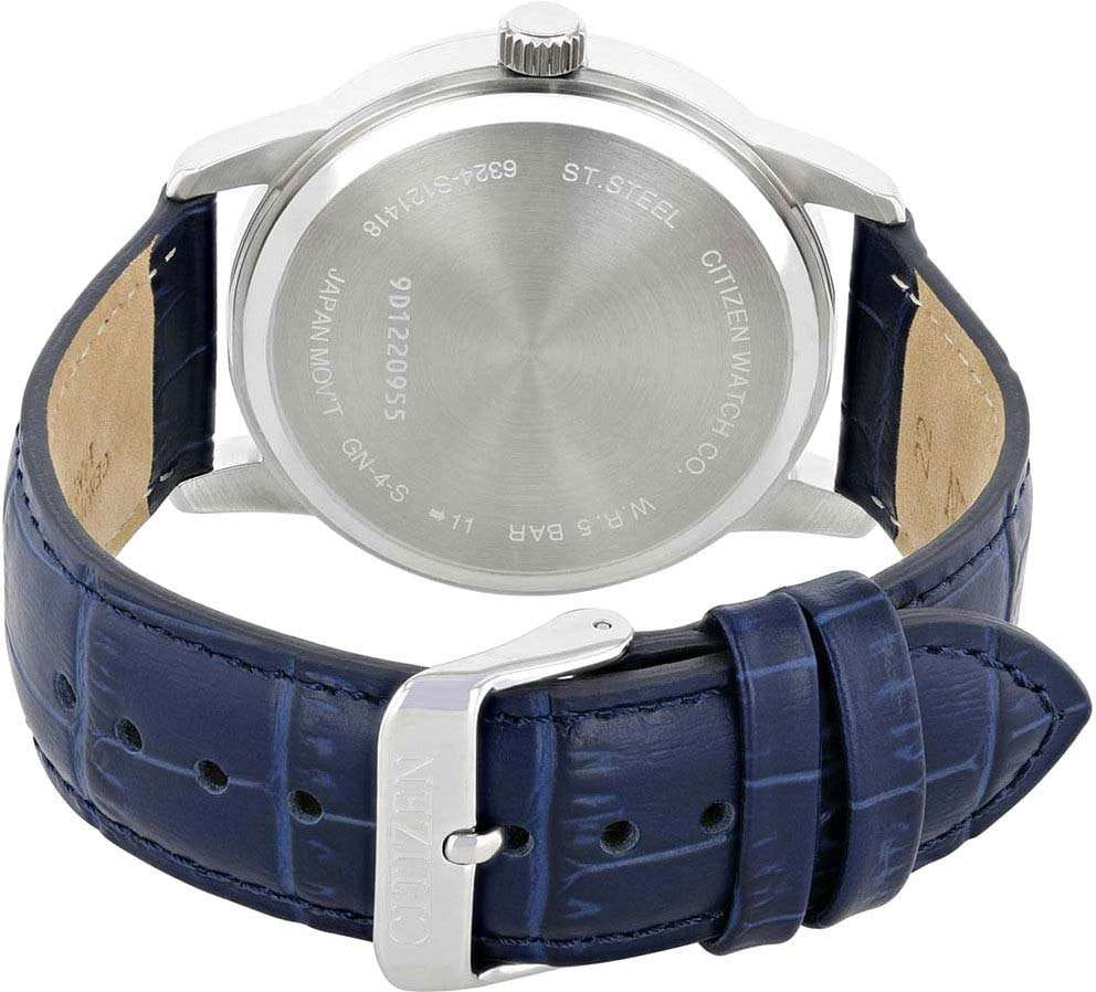 Часы Citizen AK5000-03A произведены в Японии и оснащены надёжным кварцевым механизмом калибра Citizen 6324. Корпус выполнен из нержавеющей стали и имеет классическую круглую форму диаметром 42 мм. Минеральное стеклоМинеральное стеклоМинеральное стекло представляет собой искусственно выращенный минерал кварца. Такое стекло отличается особой устойчивостью к повреждениям и царапинам. Уступает по некоторым качествам сапфировому стеклу. защищает серебристый циферблат, украшенный эффектом солнечных лучей по технологии Sunray. На циферблате расположены клиновидные стрелки в стиле Dauphine, метки в виде штрихов и римская цифра в положении 12 часов, а также индикатор фазы Луны — одно из самых востребованных усложнений в часовой классике. Часы защищены от воды по стандарту 50WR, что позволяет не бояться случайных брызг и дождя. Заводная головка отличается рифлёной поверхностью для удобства использования. Модель комплектуется синим кожаным ремешком с тиснением под кожу аллигатора и классической застёжкой. В качестве элемента питания используется батарейка SR621SW, обеспечивающая автономную работу до двух лет.