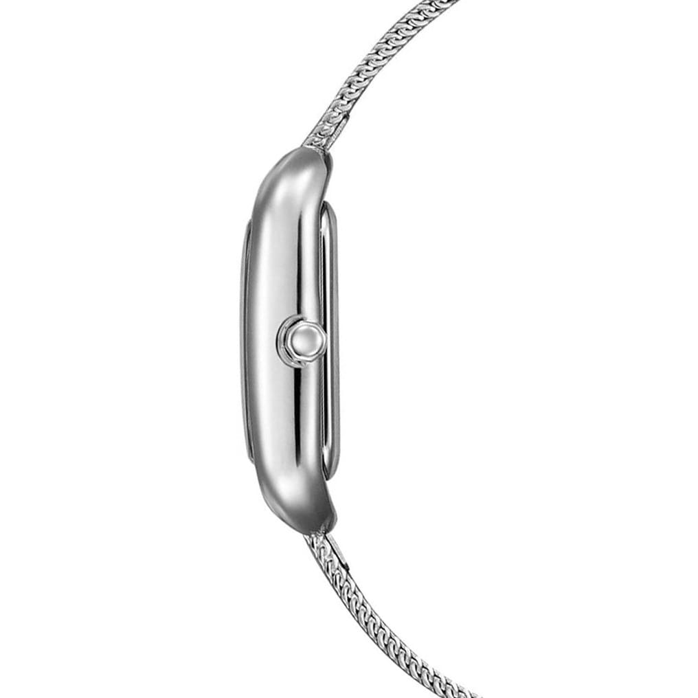 Часы Citizen EM0491-81D созданы для тех, кто ценит элегантность и современные технологии в одном аксессуаре. Корпус выполнен из прочной нержавеющей стали и гармонично сочетается с изысканным стальным браслетом миланского плетения с раскладным замкомРаскладной замокДанный вариант застежки используется только на часах с металлическим браслетом. Отличительная особенность такого крепления в том, что длина браслета становится универсальной и вы можете самостоятельно отрегулировать нужный вам размер – застежка просто двигается по браслету часов., обеспечивающим комфортную посадку на запястье. Особое внимание привлекает перламутровый белый циферблат, украшенный мерцающими кристаллами, которые придают часам особый шарм и изысканность. Метки выполнены в виде аккуратных штрихов, что обеспечивает лёгкое считывание времени. Часы оснащены надёжным кварцевым механизмом Citizen E031 с инновационной системой Eco-Drive, которая позволяет заряжать устройство от любого источника света и не требует замены батарейки. Запас хода составляет до 180 дней, а функция индикации заряда EOLEOLПредставляет собой систему, уведомляющую владельца часов о необходимости замены элемента питания. За 2 недели до полного разряда батарейки секундная стрелка перестаёт ходить чётко и начинает перепрыгивать на 3-4 деления. своевременно напомнит о необходимости подзарядки. Прочное минеральное стеклоМинеральное стеклоМинеральное стекло представляет собой искусственно выращенный минерал кварца. Такое стекло отличается особой устойчивостью к повреждениям и царапинам. Уступает по некоторым качествам сапфировому стеклу. защищает циферблат от царапин и повреждений, а водозащита до 30 метров позволяет не беспокоиться о случайных брызгах воды. Размер корпуса составляет 24 х 32 мм. Лёгкий вес всего 42 грамма, толщина корпуса 7,7 мм и ширина браслета 14 мм делают эту модель удобной для повседневного ношения и подчёркивают стильный образ.