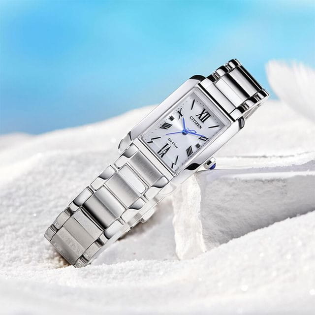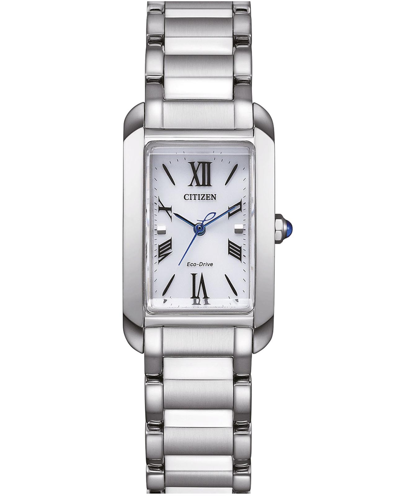 Изящные женские часы Citizen EW5620-55A сочетают в себе японское качество и современный дизайн. Корпус прямоугольной формы выполнен из прочной нержавеющей стали, а элегантный браслет оснащён удобной застежкой «бабочка»Застёжка "бабочка"Такой вид застёжки дополняется предохранителями, помогающими избежать случайного раскрытия браслета. Обладают изящным исполнением. . Серебристый перламутровый циферблат украшен римскими цифрами и изысканными синими стрелками. Модель оснащена надёжным кварцевым механизмом японского производства, защищена сапфировым стекломСапфировое стеклоПрочный и надёжный материал из кристалла сапфира синтетического происхождения, характеризующийся особой твёрдостью и устойчивостью к царапинам и повреждениям. и обладает водозащитой WR 50, что позволяет использовать часы во время плавания. Размеры корпуса — 19 мм в ширину, 32,5 мм в высоту и 7 мм в толщину.