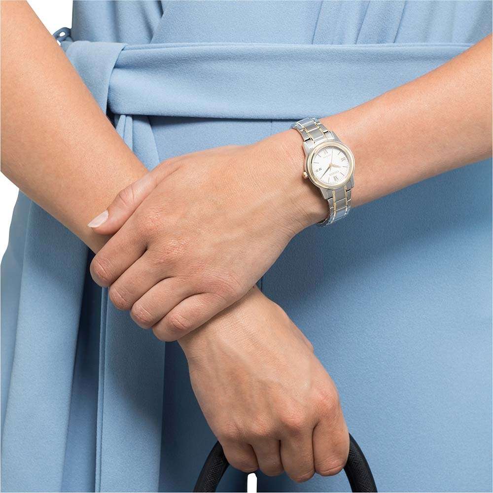 Элегантные часы Citizen FE1226-82A сочетают в себе классический дизайн и современные технологии. Модель изготовлена в Японии и оснащена кварцевым механизмом Citizen J710 с инновационной системой Eco-Drive, которая обеспечивает работу часов за счет солнечной энергии и не требует замены батарейки. Запас хода составляет до 240 дней, а функция индикации заряда позволяет всегда знать уровень энергии. Корпус и браслет выполнены из прочной нержавеющей стали, а безельБезельВнешний ободок, закрепляющий стекло. В спортивных часах так называется поворотное кольцо с делениями на циферблате, выполняет роль таймера – замеряет отрезки времени на шкале. Неподвижный безель – элемент декора. Однонаправленно вращающийся безель на дайверских часах позволяет фиксировать моменты погружения и выныривания на поверхность. и браслет (частично) с золотистым PVD-покрытиемPVDУльтратонкое покрытие наносится в технике вакуумного напыления, сочетает в себе нитрид титана особой прочности со слоем золота или оксида хрома. Несёт в себе декоративную или защитную функцию., надежная раскладная застёжкаРаскладная застёжкаТакой тип застёжки используется только на браслетах из металла. Она никогда не раскрывается полностью, происходит разделение на 2 и более частей. Раскладывающая застёжка снизит вероятность потери часов к минимуму. с системой блокировки обеспечивает дополнительную безопасность при ношении. Белый циферблат украшен окошком даты, а минеральное стеклоМинеральное стеклоМинеральное стекло представляет собой искусственно выращенный минерал кварца. Такое стекло отличается особой устойчивостью к повреждениям и царапинам. Уступает по некоторым качествам сапфировому стеклу. надежно защищает его от повреждений. Водозащита до 100 метров позволяет использовать часы в повседневной жизни и во время активного отдыха. Диаметр корпуса составляет 30 мм, толщина — 8,9 мм, вес — 69 г. Эта модель станет отличным выбором для тех, кто ценит надежность, стиль и современные технологии в одном аксессуаре.