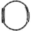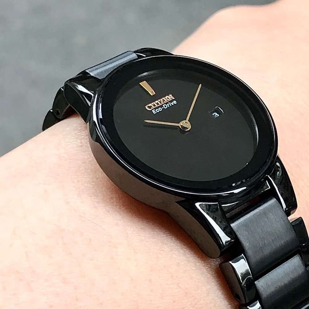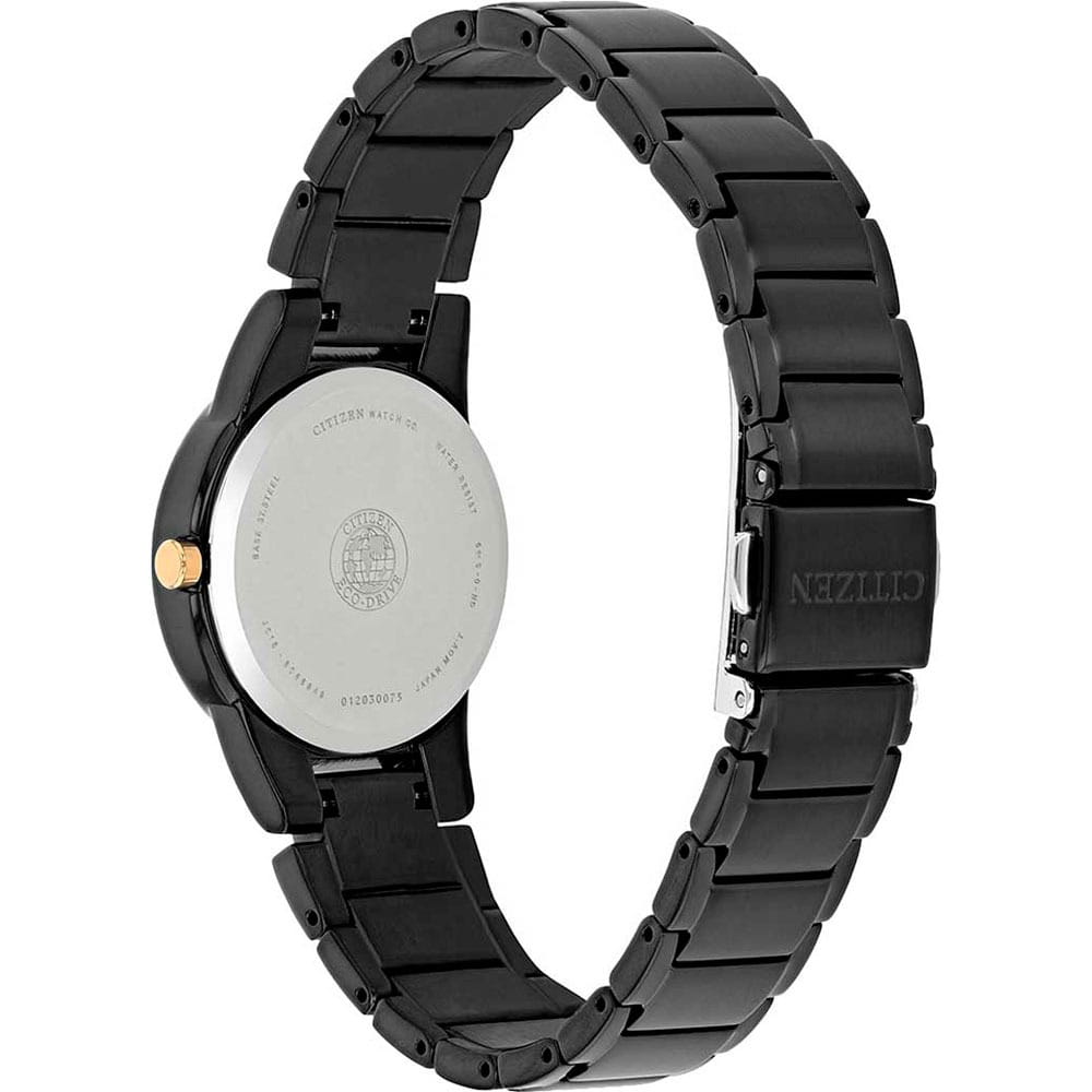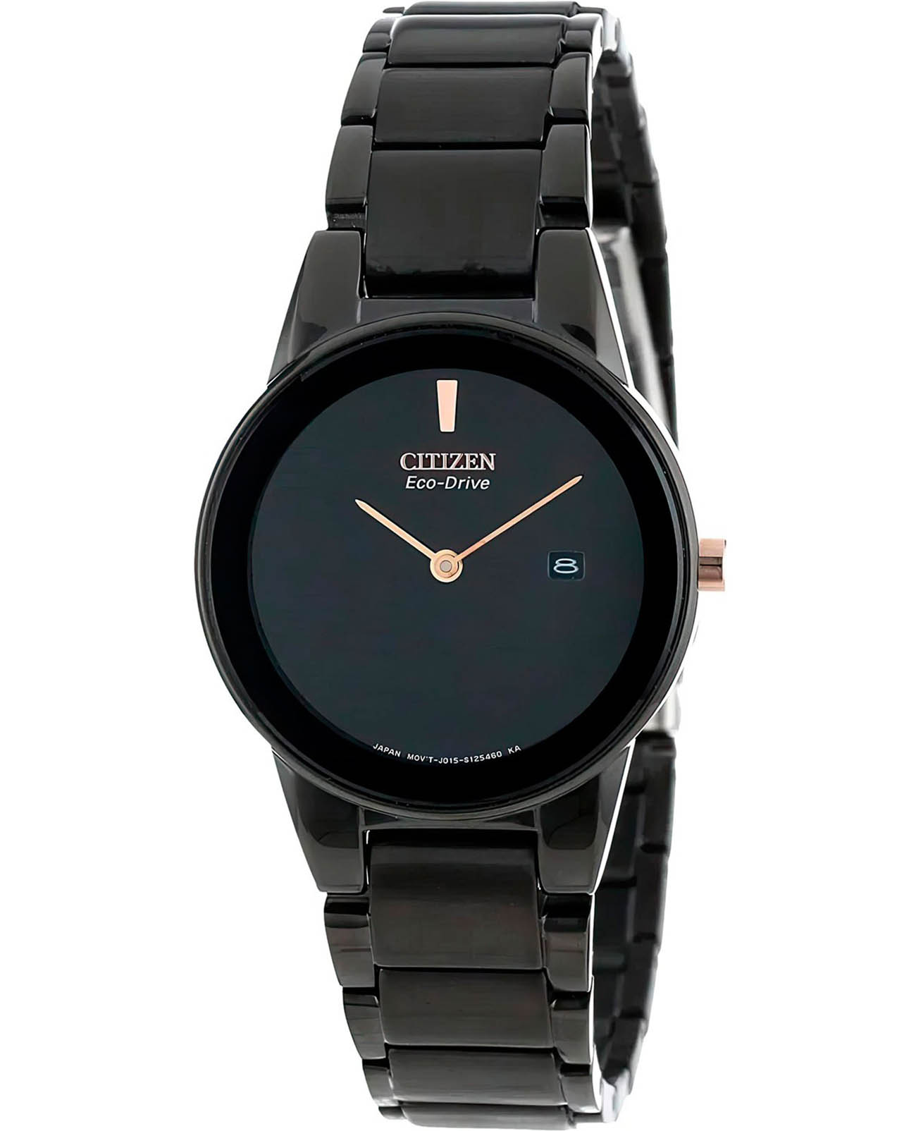 Часы Citizen GA1055-57F произведены в Японии и воплощают стильный минимализм, который гармонично дополнит любой образ. Корпус диаметром 29,5 мм и браслет шириной 16 мм выполнены из прочной нержавеющей стали с износостойким черным PVD-покрытиемPVDУльтратонкое покрытие наносится в технике вакуумного напыления, сочетает в себе нитрид титана особой прочности со слоем золота или оксида хрома. Несёт в себе декоративную или защитную функцию., что придает модели современный и лаконичный вид. Черный циферблат с лаконичной разметкой оснащён окошком календаря с указанием числа в положении 3 часа, а минеральное стеклоМинеральное стеклоМинеральное стекло представляет собой искусственно выращенный минерал кварца. Такое стекло отличается особой устойчивостью к повреждениям и царапинам. Уступает по некоторым качествам сапфировому стеклу. надежно защищает его от царапин. Кварцевый механизм Citizen J710 работает на инновационной системе Eco-Drive, благодаря которой часы не требуют замены батарейки и заряжаются от любого источника света, обеспечивая запас хода до 180 дней. Дополнительные функции включают индикацию низкого заряда EOLEOLПредставляет собой систему, уведомляющую владельца часов о необходимости замены элемента питания. За 2 недели до полного разряда батарейки секундная стрелка перестаёт ходить чётко и начинает перепрыгивать на 3-4 деления. и предотвращение перезарядки. Водозащита уровня WR30 позволяет не бояться случайных брызг, а удобная раскладная застёжкаРаскладная застёжкаТакой тип застёжки используется только на браслетах из металла. Она никогда не раскрывается полностью, происходит разделение на 2 и более частей. Раскладывающая застёжка снизит вероятность потери часов к минимуму. гарантирует комфортное ношение. Вес часов составляет 78 грамм. Эта модель станет идеальным выбором для ценителей лаконичного дизайна и современных технологий.