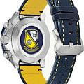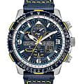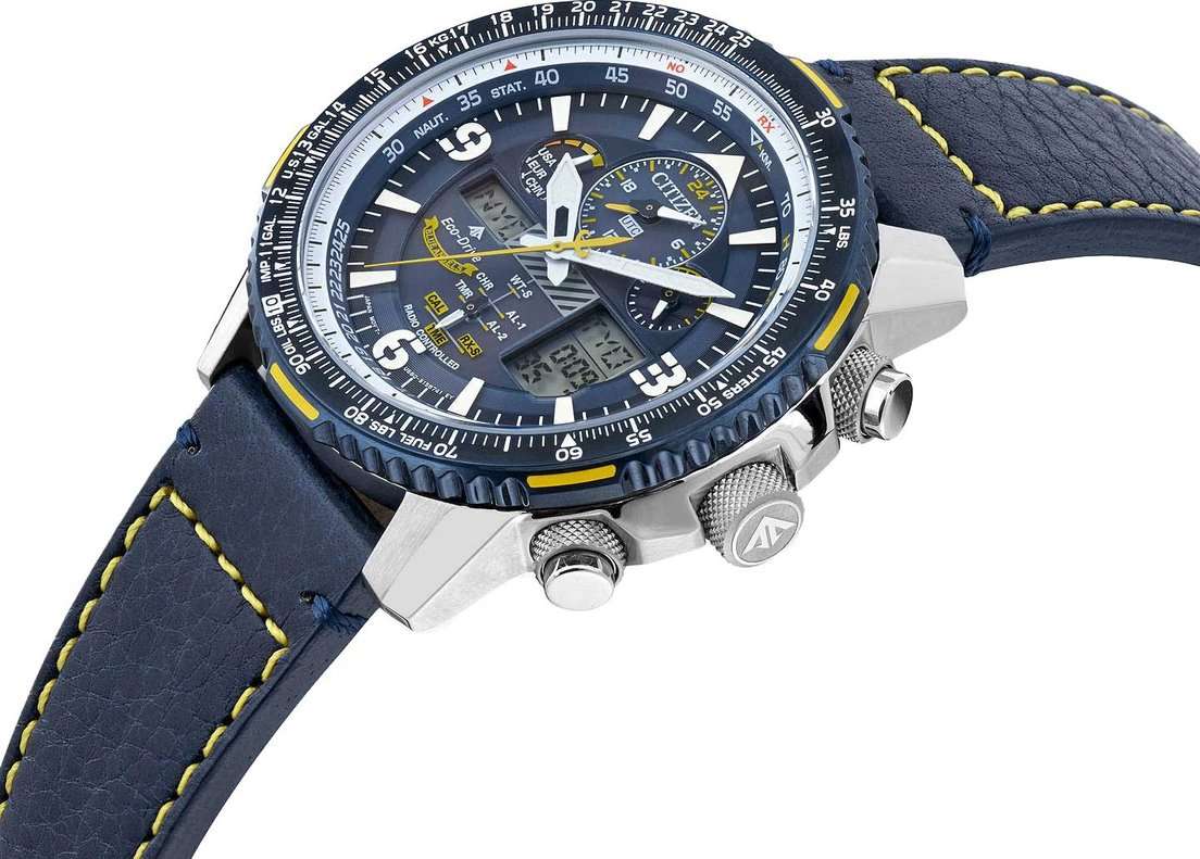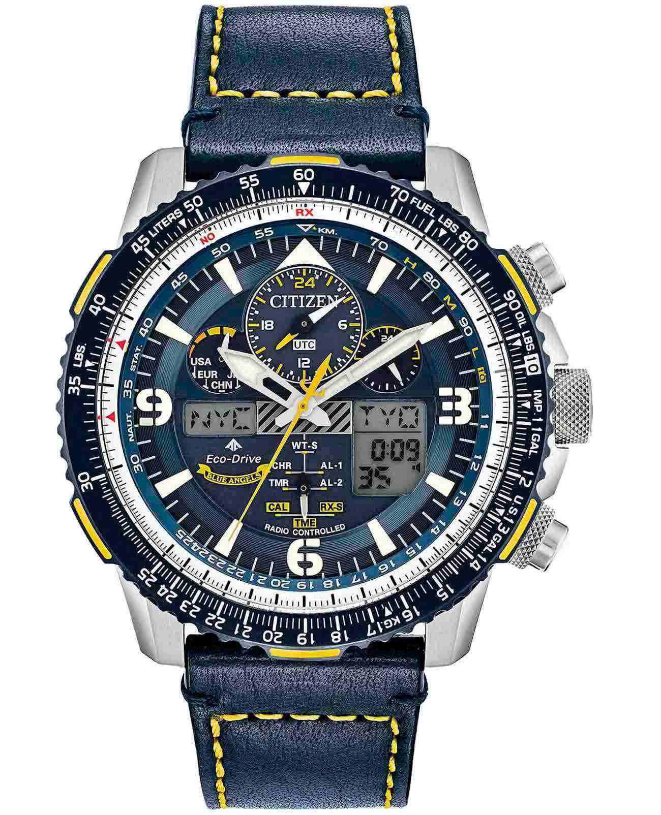 Citizen Promaster JY8078-01L часы-хронографХронографФункция позволяет измерять отрезки времени с особой точностью: часы, минуты, секунды. Верным признаком хронографа является наличие на циферблате 3 дополнительных окошек-счётчиков. с секундомеромСекундомерСекундоме́р — прибор, способный измерять интервалы времени с точностью до долей секунды. спортивного дизайна с высоким уровнем водозащиты. Корпус из нержавеющей стали диаметром 45,4 мм идеально сбалансирован. Сапфировое стеклоСапфировое стеклоПрочный и надёжный материал из кристалла сапфира синтетического происхождения, характеризующийся особой твёрдостью и устойчивостью к царапинам и повреждениям. обеспечивает отличную защиту циферблата от царапин. Часы работают на основе кварцевого механизма, питание от солнечной энергии. Кожаный ремешок на стандартной застёжке идеально дополняют дизайн часов, обеспечивая комфортное ношение. Стрелки и метки на циферблате имеют люминесцентное покрытиеЛюминесцентное покрытиеПозволяет считывать показания времени в темноте. Производители наносят на стрелки, часовые индексы, безель или поверхность циферблата светонакопительный состав, дающий холодное свечение. позволяющее легко определять время даже в темноте. Поворотный безельБезельВнешний ободок, закрепляющий стекло. В спортивных часах так называется поворотное кольцо с делениями на циферблате, выполняет роль таймера – замеряет отрезки времени на шкале. Неподвижный безель – элемент декора. Однонаправленно вращающийся безель на дайверских часах позволяет фиксировать моменты погружения и выныривания на поверхность. с IP-покрытиемIP-покрытиеМетод ионного напыления. Демонстрирует повышенную устойчивость к истиранию, окислению и химическим веществам. Под воздействием высокого давления и температуры около 1500°C молекулы металла надёжно соединяются с частицами корпуса часов.. Автоматический прием сигналов от радиовышек, расположенных в различных точках земного шара, которые передают временные сигналы от определенных атомных часов. Коррекция текущего времени радиосигналом на территории почти всей Европы, США, Японии и Китая. Функция индикации заряда (EOL) и предотвращения перезарядки. Мировое времяМировое время Полезное часовое усложнение, отображающее время в основных городах и известных областях по всему миру, оно связано с часовыми поясами, удобно для путешественников и бизнесменов.  - 43 города (29 часовых поясов), переход на зимнее и летнее время. Всемирное координированное время UTCUTCВсемирное кординационное время, не имеющее привязки к географическому положению Гринвича, основывается на атомном отсчёте времени. Регулировка времени осуществляется более точно, чем устаревшее GMT.