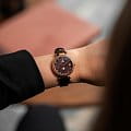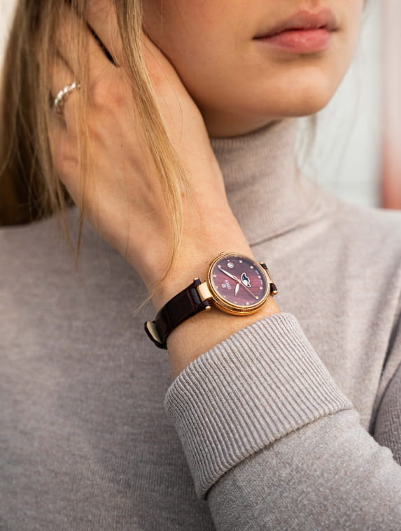 Женские часы Cover Moon CO196.07 - это аксессуар для истинных леди из коллекции Fly Me To The Moon. Часы работают на кварцевом калибре ETA. Циферблат выполнен в коричневом перламутровом исполнении, создавая игру света при каждом движении запястья, и украшен 11 кристаллами Swarovski, которые служат часовым индикатором, добавляя блики света и роскоши. Кроме того, модель имеет окно фаз Луны на «6 часах» и апертуру даты на «3 часах», что делает ее функциональной для ценителей астрономических усложнений. Часы имеют 32-миллиметровый корпус из нержавеющей стали с PVD-покрытиемPVDУльтратонкое покрытие наносится в технике вакуумного напыления, сочетает в себе нитрид титана особой прочности со слоем золота или оксида хрома. Несёт в себе декоративную или защитную функцию. цвета розового золота. Водонепроницаемость часов достигает 5 атмосфер (WR 50), что позволяет использовать их в повседневной жизни, однако не рекомендуется для контакта с водой во время плавания или дайвинга. Маркировка «Swiss Made». Кожаный ремешок на классической застежке.
