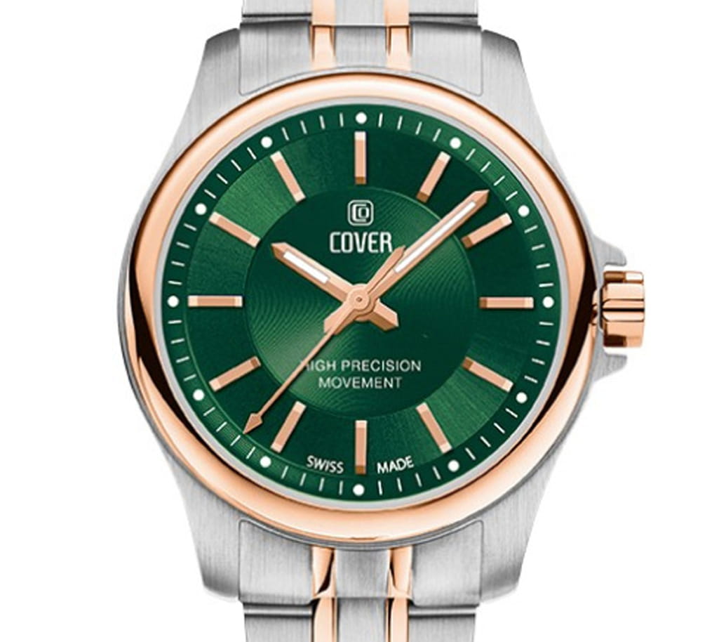 Женские наручные часы Cover CO201.33 из коллекции Marville сочетают в себе классический дизайн и высокую точность швейцарского производства. Модель обладает круглым корпусом диаметром 28 мм, изготовленным из нержавеющей стали, что придает изделию благородный внешний вид. Зеленый циферблат оснащен стрелками с люминесцентным покрытиемЛюминесцентное покрытиеПозволяет считывать показания времени в темноте. Производители наносят на стрелки, часовые индексы, безель или поверхность циферблата светонакопительный состав, дающий холодное свечение.. Для защиты используется сапфировое стеклоСапфировое стеклоПрочный и надёжный материал из кристалла сапфира синтетического происхождения, характеризующийся особой твёрдостью и устойчивостью к царапинам и повреждениям. с антибликовым покрытиемАнтибликовое покрытиеСлой оксида металла в 0,13-0,3 микрон, благодаря которому стекло часов не бликует и не отражает свет. Антибликовое покрытие уменьшает отражение света в 10 раз, обеспечивая отличную читаемость показателей циферблата., обеспечивающее прочную защиту от царапин и превосходную читаемость времени даже при ярком свете. БезельБезельВнешний ободок, закрепляющий стекло. В спортивных часах так называется поворотное кольцо с делениями на циферблате, выполняет роль таймера – замеряет отрезки времени на шкале. Неподвижный безель – элемент декора. Однонаправленно вращающийся безель на дайверских часах позволяет фиксировать моменты погружения и выныривания на поверхность. с PVD-покрытиемPVDУльтратонкое покрытие наносится в технике вакуумного напыления, сочетает в себе нитрид титана особой прочности со слоем золота или оксида хрома. Несёт в себе декоративную или защитную функцию. цвета розового золота. Часы работают на высокоточном кварцевом механизме ETA, гарантирующем исключительную точность хода с погрешностью около 20 секунд в месяц. Браслет выполнен из нержавеющей стали с частичным PVD-покрытиемPVDУльтратонкое покрытие наносится в технике вакуумного напыления, сочетает в себе нитрид титана особой прочности со слоем золота или оксида хрома. Несёт в себе декоративную или защитную функцию. и оснащен раскладной застежкойРаскладная застёжкаТакой тип застёжки используется только на браслетах из металла. Она никогда не раскрывается полностью, происходит разделение на 2 и более частей. Раскладывающая застёжка снизит вероятность потери часов к минимуму., обеспечивающей комфортное ношение и безопасность. Водонепроницаемость достигает 10 атмосфер (100 метров), что позволяет использовать их во время плавания и других водных видов спорта, однако не рекомендуется для глубоководного дайвинга. Эти швейцарские часы станут идеальным дополнением как классического, так и современного образа.