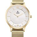 Женские наручные часы Cover CO2037.08 из коллекции Essential сочетают в себе классический дизайн и высокую точность швейцарского производства. Модель обладает круглым корпусом диаметром 38 мм, изготовленным из нержавеющей стали с PVD-покрытиемPVDУльтратонкое покрытие наносится в технике вакуумного напыления, сочетает в себе нитрид титана особой прочности со слоем золота или оксида хрома. Несёт в себе декоративную или защитную функцию., что придает изделию благородный внешний вид. Для защиты используется сапфировое стеклоСапфировое стеклоПрочный и надёжный материал из кристалла сапфира синтетического происхождения, характеризующийся особой твёрдостью и устойчивостью к царапинам и повреждениям. с антибликовым покрытиемАнтибликовое покрытиеСлой оксида металла в 0,13-0,3 микрон, благодаря которому стекло часов не бликует и не отражает свет. Антибликовое покрытие уменьшает отражение света в 10 раз, обеспечивая отличную читаемость показателей циферблата., обеспечивающее прочную защиту от царапин и превосходную читаемость времени даже при ярком свете. Часы работают на высокоточном кварцевом механизме, гарантирующем исключительную точность хода с погрешностью около 20 секунд в месяц. Браслет "миланского плетения" выполнен из нержавеющей стали с золотистым PVD-покрытиемPVDУльтратонкое покрытие наносится в технике вакуумного напыления, сочетает в себе нитрид титана особой прочности со слоем золота или оксида хрома. Несёт в себе декоративную или защитную функцию. и оснащен раскладным замком, который легко можно подогнать по руке. Водонепроницаемость достигает 5 атмосфер (50 метров), что позволяет использовать их во время дождя и мытья рук, но не рекомендуется для плавания. Эти швейцарские часы станут идеальным дополнением как классического, так и современного образа.