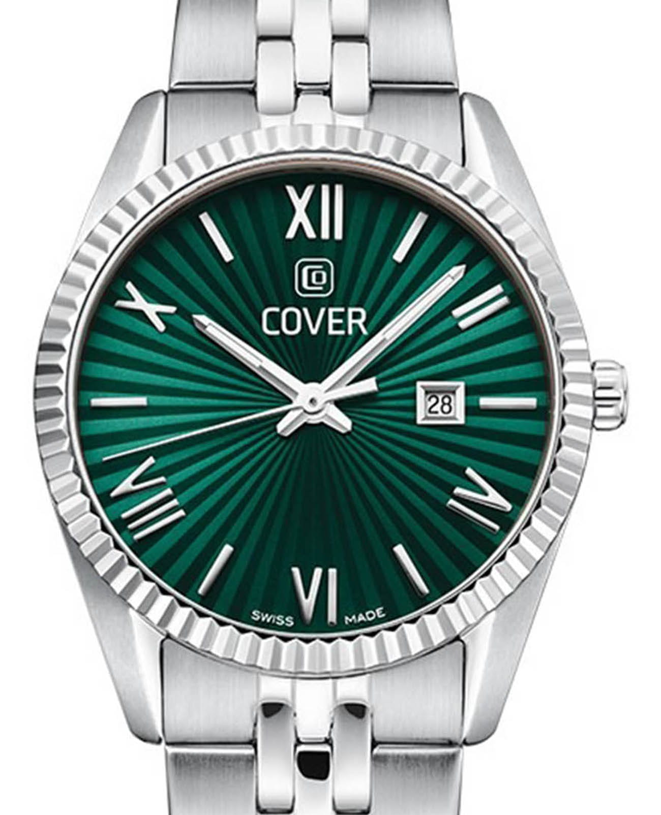 Часы COVER CO217.04 из коллекции Alston – элегантная модель швейцарского производства. Эти часы станут идеальным аксессуаром для элегантных дам, которые ценят стиль и качество. Корпус и браслет с раскладной застёжкойРаскладная застёжкаТакой тип застёжки используется только на браслетах из металла. Она никогда не раскрывается полностью, происходит разделение на 2 и более частей. Раскладывающая застёжка снизит вероятность потери часов к минимуму. изготовлены из нержавеющей стали, имеют диаметр 30 мм. На зеленом циферблате расположены  накладные римские цифры. Надежное минеральное стеклоМинеральное стеклоМинеральное стекло представляет собой искусственно выращенный минерал кварца. Такое стекло отличается особой устойчивостью к повреждениям и царапинам. Уступает по некоторым качествам сапфировому стеклу. защищает часы от царапин и долго сохраняет первоначальный внешний вид. Они показывают день месяца, индикатор которых с накладной рамкой расположен в положении «3 часа». Водозащита 50 метров делает часы практичными для повседневного использования. На часовую, минутную стрелки нанесено люминесцентное покрытиеЛюминесцентное покрытиеПозволяет считывать показания времени в темноте. Производители наносят на стрелки, часовые индексы, безель или поверхность циферблата светонакопительный состав, дающий холодное свечение., которое светится в темноте, создавая необычное изображение. Эти часы идеально подойдут для светских раутов, бизнес-встреч и других важных событий, подчеркнут вашу элегантность и статус.