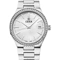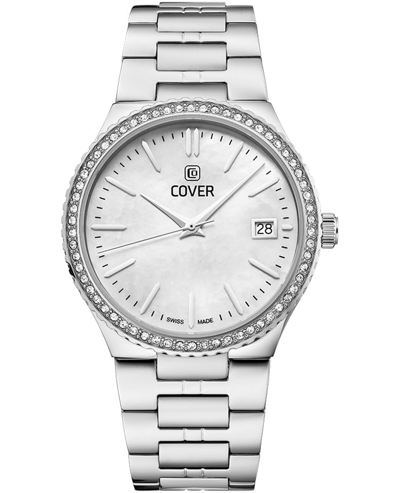 Cover Jumeira CO218.01 – элегантные женские часы, сочетающие современный дизайн и швейцарское качество. Корпус диаметром 36 мм выполнен из нержавеющей стали 316L, что придаёт модели роскошный вид и обеспечивает долговечность. БезельБезельВнешний ободок, закрепляющий стекло. В спортивных часах так называется поворотное кольцо с делениями на циферблате, выполняет роль таймера – замеряет отрезки времени на шкале. Неподвижный безель – элемент декора. Однонаправленно вращающийся безель на дайверских часах позволяет фиксировать моменты погружения и выныривания на поверхность. украшен кристаллами, добавляя изысканности и блеска, а поверхность циферблата защищена сапфировым стекломСапфировое стеклоПрочный и надёжный материал из кристалла сапфира синтетического происхождения, характеризующийся особой твёрдостью и устойчивостью к царапинам и повреждениям., устойчивым к царапинам. Часы оснащены швейцарским кварцевым механизмом, обеспечивающим точный ход и надёжность. Функциональность дополняется окошком даты, расположенным на позиции «3 часа». Браслет из нержавеющей стали оснащён раскладной застёжкойРаскладная застёжкаТакой тип застёжки используется только на браслетах из металла. Она никогда не раскрывается полностью, происходит разделение на 2 и более частей. Раскладывающая застёжка снизит вероятность потери часов к минимуму., обеспечивающей удобную и надёжную фиксацию на запястье. Водонепроницаемость 50 метров (5 ATM) позволяет использовать часы в повседневной жизни, защищая их от случайных брызг и дождя.