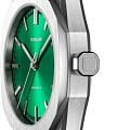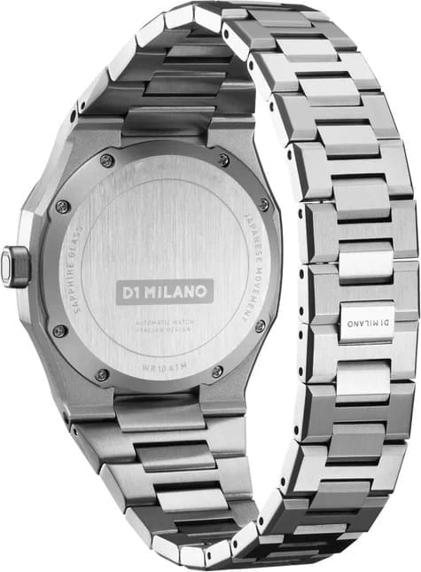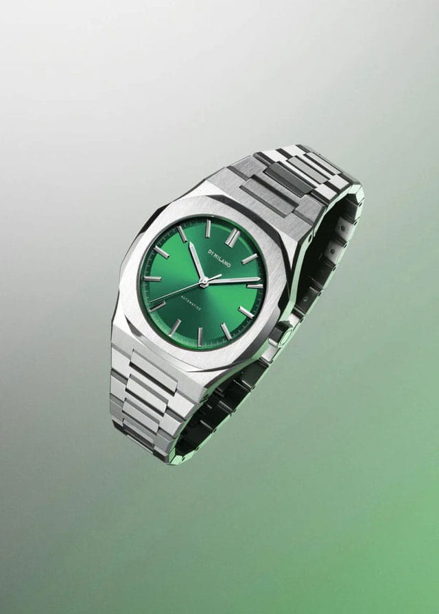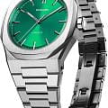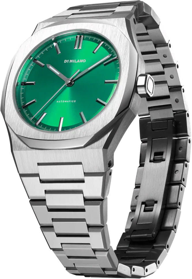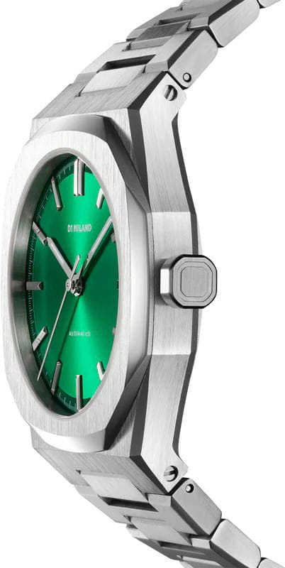 Часы D1 Milano Automatico Green Code ATBU05 – стильный аксессуар для современных женщин. Часы механические с автоподзаводом. Корпус выполнен из прочной нержавеющей стали 316L, а изысканный зеленый циферблат украшен простыми штрихами вместо цифр. Минималистичный дизайн циферблата, защищенный прочным сапфировым стекломСапфировое стеклоПрочный и надёжный материал из кристалла сапфира синтетического происхождения, характеризующийся особой твёрдостью и устойчивостью к царапинам и повреждениям. с антибликовым покрытиемАнтибликовое покрытиеСлой оксида металла в 0,13-0,3 микрон, благодаря которому стекло часов не бликует и не отражает свет. Антибликовое покрытие уменьшает отражение света в 10 раз, обеспечивая отличную читаемость показателей циферблата., привлекает внимание своей сдержанной красотой. Лаконичные стрелки с люминесцентным покрытиемЛюминесцентное покрытиеПозволяет считывать показания времени в темноте. Производители наносят на стрелки, часовые индексы, безель или поверхность циферблата светонакопительный состав, дающий холодное свечение.. Задняя крышка закреплена на 8 винтах, что обеспечивает надежность конструкции. Стальной браслет с удобной застёжкой «бабочка»Застёжка "бабочка"Такой вид застёжки дополняется предохранителями, помогающими избежать случайного раскрытия браслета. Обладают изящным исполнением. обеспечивают комфорт при ношении. Часы имеют водозащиту 100 метров (100WR), что позволит плавать, нырять и заниматься другими водными видами спорта. Это не просто часы, а статусный аксессуар, подчеркивающий безупречный вкус и внимание к деталям своего владельца.