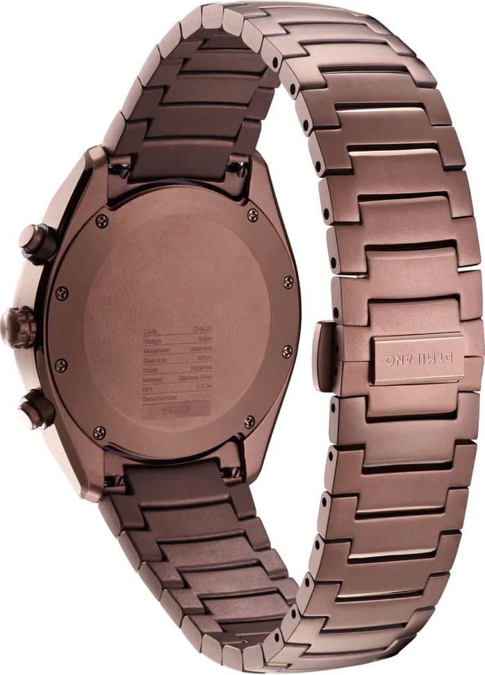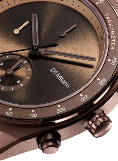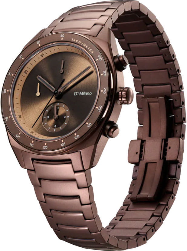 Элегантный хронограф D1 Milano Cronografo Essential Brown CHBJ22 - идеальное воплощение мужественности и стиля. Этот многофункциональный аксессуар оснащен секундомером, тахиметромТахиметрРазмеченная шкала, располагается на ободке или безеле часов. Тахиметр позволяет рассчитать скорость на определённом участке пути, расстояние измеряется в километрах или милях.. что делает его незаменимым компаньоном в повседневной жизни. Изысканный корпус и браслет выполнены из стали с PVD-покрытиемPVDУльтратонкое покрытие наносится в технике вакуумного напыления, сочетает в себе нитрид титана особой прочности со слоем золота или оксида хрома. Несёт в себе декоративную или защитную функцию.. Минималистичный дизайн циферблата, защищенный прочным сапфировым стекломСапфировое стеклоПрочный и надёжный материал из кристалла сапфира синтетического происхождения, характеризующийся особой твёрдостью и устойчивостью к царапинам и повреждениям. с антибликовым покрытиемАнтибликовое покрытиеСлой оксида металла в 0,13-0,3 микрон, благодаря которому стекло часов не бликует и не отражает свет. Антибликовое покрытие уменьшает отражение света в 10 раз, обеспечивая отличную читаемость показателей циферблата., привлекает внимание своей сдержанной красотой.  Стрелки с люминесцентным покрытиемЛюминесцентное покрытиеПозволяет считывать показания времени в темноте. Производители наносят на стрелки, часовые индексы, безель или поверхность циферблата светонакопительный состав, дающий холодное свечение., обеспечивающим хорошую читаемость в темноте. Надежная конструкция с задней крышкой на 8 винтах и стильный браслет с удобной застёжкой «бабочка» с кнопкамиЗастёжка "бабочка"Такой вид застёжки дополняется предохранителями, помогающими избежать случайного раскрытия браслета. Обладают изящным исполнением. обеспечивают комфорт при ношении.  Водозащита 50 метров защищает часы от брызг и дождя, делая их подходящими для повседневного использования. Это не просто часы, а статусный аксессуар, подчеркивающий безупречный вкус и внимание к деталям своего владельца.