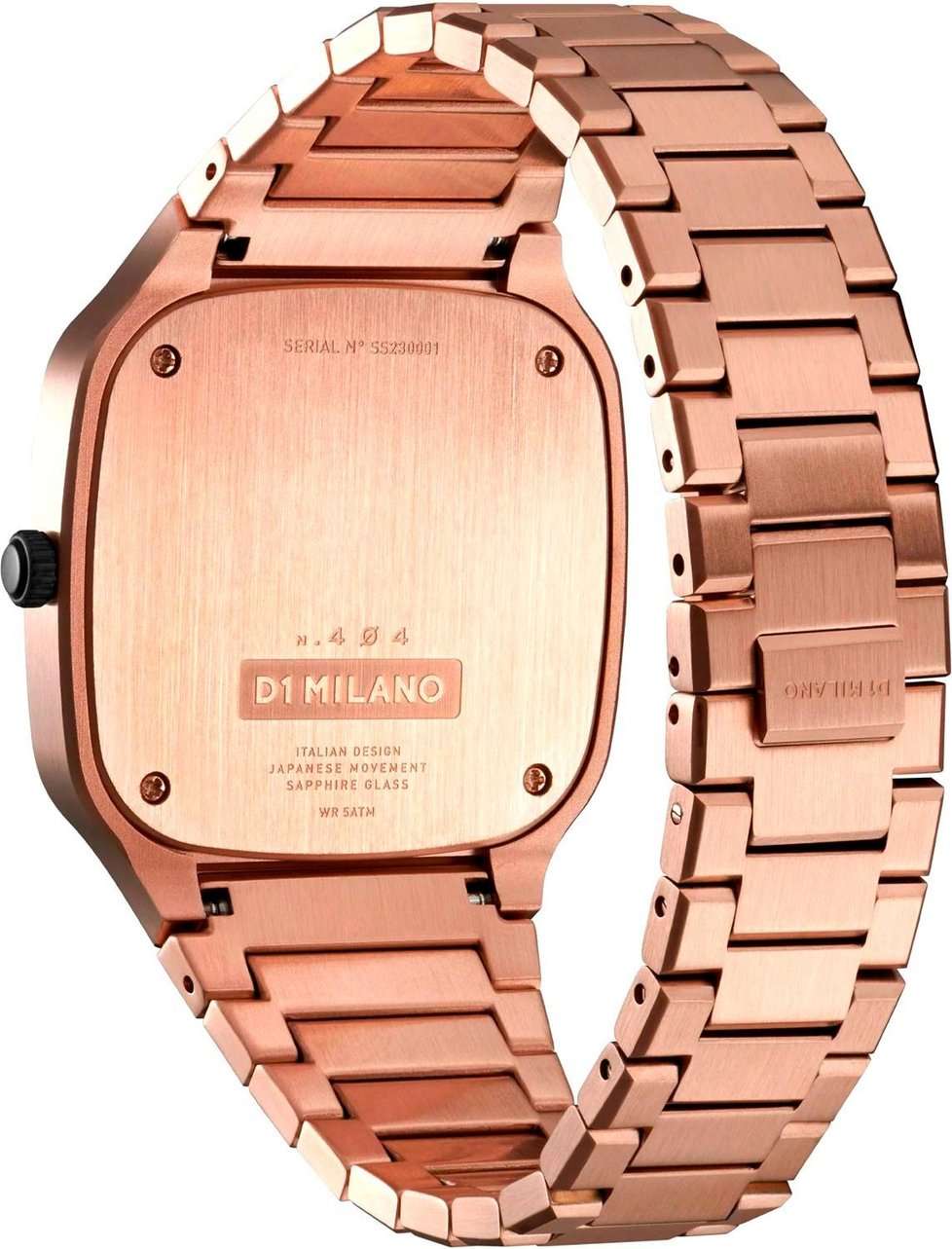 Часы D1 Milano SQBJ04 — это уникальные кварцевые часы, которые подчеркнут ваш изысканный стиль. Эти наручные часы с эффектным монохромным дизайном станут выразительным акцентом вашего образа. Квадратный корпус из стали с сатинированной отделкой, PVDPVDУльтратонкое покрытие наносится в технике вакуумного напыления, сочетает в себе нитрид титана особой прочности со слоем золота или оксида хрома. Несёт в себе декоративную или защитную функцию. покрытием и габаритами 37х37 мм придает часам современный и утонченный вид. Золотистый циферблат, выполненный по технологии Sunray, украшен накладными метками в виде штрихов, а черные хроматические стрелки и индексы создают стильный контраст, подчёркивая элегантность модели. Задняя крышка из нержавеющей стали закреплена на 4-х винтах и дополнена индивидуальным серийным номером, что подчеркивает уникальность каждого экземпляра. Стальной браслет с PVDPVDУльтратонкое покрытие наносится в технике вакуумного напыления, сочетает в себе нитрид титана особой прочности со слоем золота или оксида хрома. Несёт в себе декоративную или защитную функцию. покрытием и раскладной застёжкойРаскладная застёжкаТакой тип застёжки используется только на браслетах из металла. Она никогда не раскрывается полностью, происходит разделение на 2 и более частей. Раскладывающая застёжка снизит вероятность потери часов к минимуму. обеспечивает надежность и комфорт в повседневном использовании. Сапфировое стеклоСапфировое стеклоПрочный и надёжный материал из кристалла сапфира синтетического происхождения, характеризующийся особой твёрдостью и устойчивостью к царапинам и повреждениям. с антибликовым покрытием защищает циферблат, а водозащита до 50WR делает эти часы практичным выбором для любых условий. Благодаря калибру Miyota 1L22, они отличаются точностью и надежностью. Эти итальянские часы представляют собой идеальное сочетание традиционного мастерства и инновационного подхода, воплощая в себе новый взгляд на классическую элегантность.
