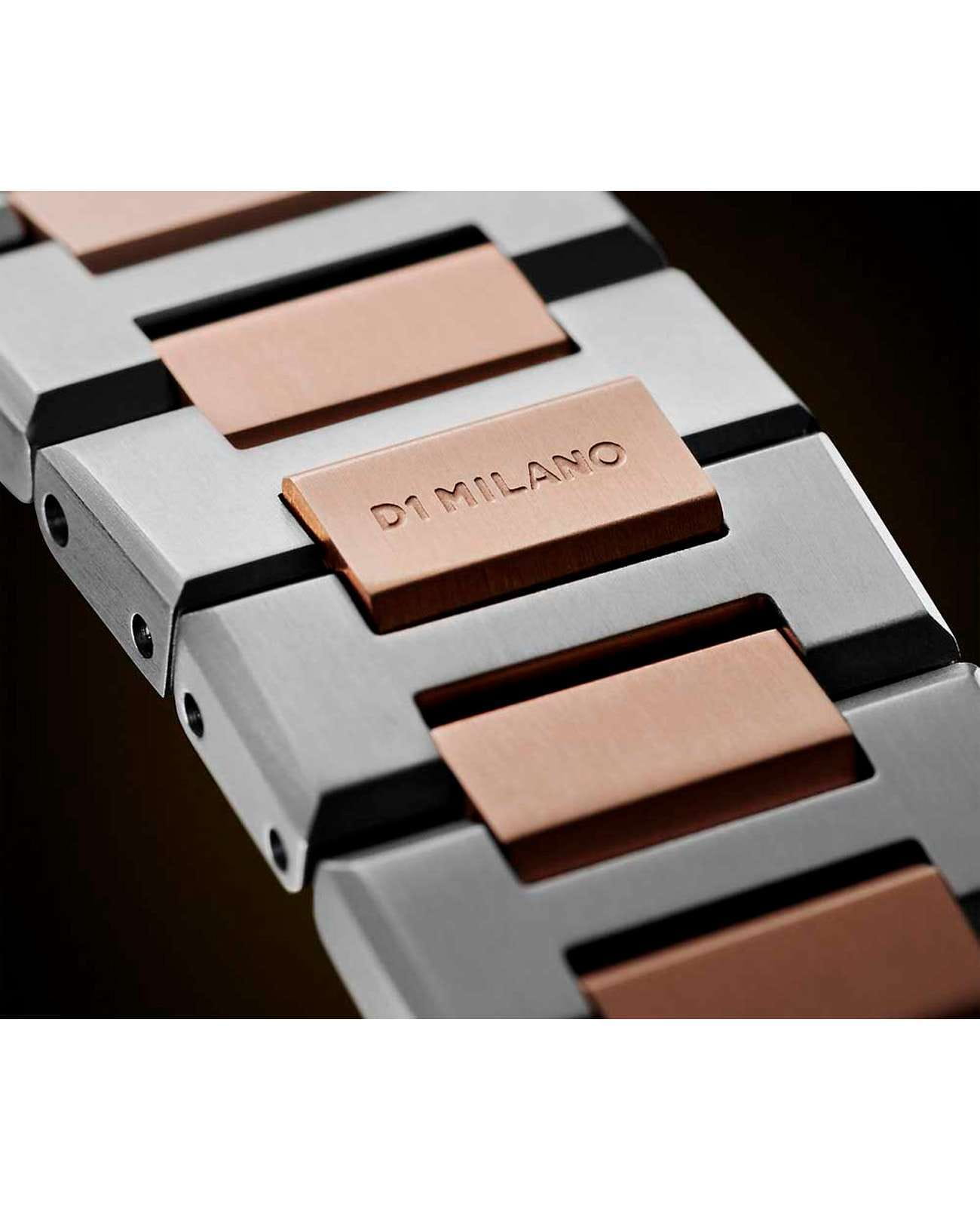 Наручные часы D1 Milano UTBU03 сочетают в себе элегантный дизайн и современные технологии. Модель обладает корпусом диаметром 38 мм, изготовленным из нержавеющей стали, что обеспечивает высокую устойчивость к внешним воздействиям. БезельБезельВнешний ободок, закрепляющий стекло. В спортивных часах так называется поворотное кольцо с делениями на циферблате, выполняет роль таймера – замеряет отрезки времени на шкале. Неподвижный безель – элемент декора. Однонаправленно вращающийся безель на дайверских часах позволяет фиксировать моменты погружения и выныривания на поверхность. с PVD-покрытиемPVDУльтратонкое покрытие наносится в технике вакуумного напыления, сочетает в себе нитрид титана особой прочности со слоем золота или оксида хрома. Несёт в себе декоративную или защитную функцию.. Циферблат черного цвета украшен метками в виде штрихов, а его защиту обеспечивает прочное сапфировое стеклоСапфировое стеклоПрочный и надёжный материал из кристалла сапфира синтетического происхождения, характеризующийся особой твёрдостью и устойчивостью к царапинам и повреждениям., известное своей устойчивостью к царапинам. Часы оснащены кварцевым механизмом, гарантирующим точность хода без необходимости подзаводки. Браслет выполнен из нержавеющей стали на раскладной застёжкеРаскладная застёжкаТакой тип застёжки используется только на браслетах из металла. Она никогда не раскрывается полностью, происходит разделение на 2 и более частей. Раскладывающая застёжка снизит вероятность потери часов к минимуму., что обеспечивает комфортное ношение на протяжении всего дня. Водонепроницаемость модели составляет 50 метров, что позволяет использовать часы в повседневной жизни, включая контакт с водой при мытье рук или дожде, однако не рекомендуется для погружений или активных водных видов спорта. Изготовленные в Италии, эти ультратонкие часы станут стильным аксессуаром как для мужчин, так и для женщин, идеально дополняя образ в любой ситуации.