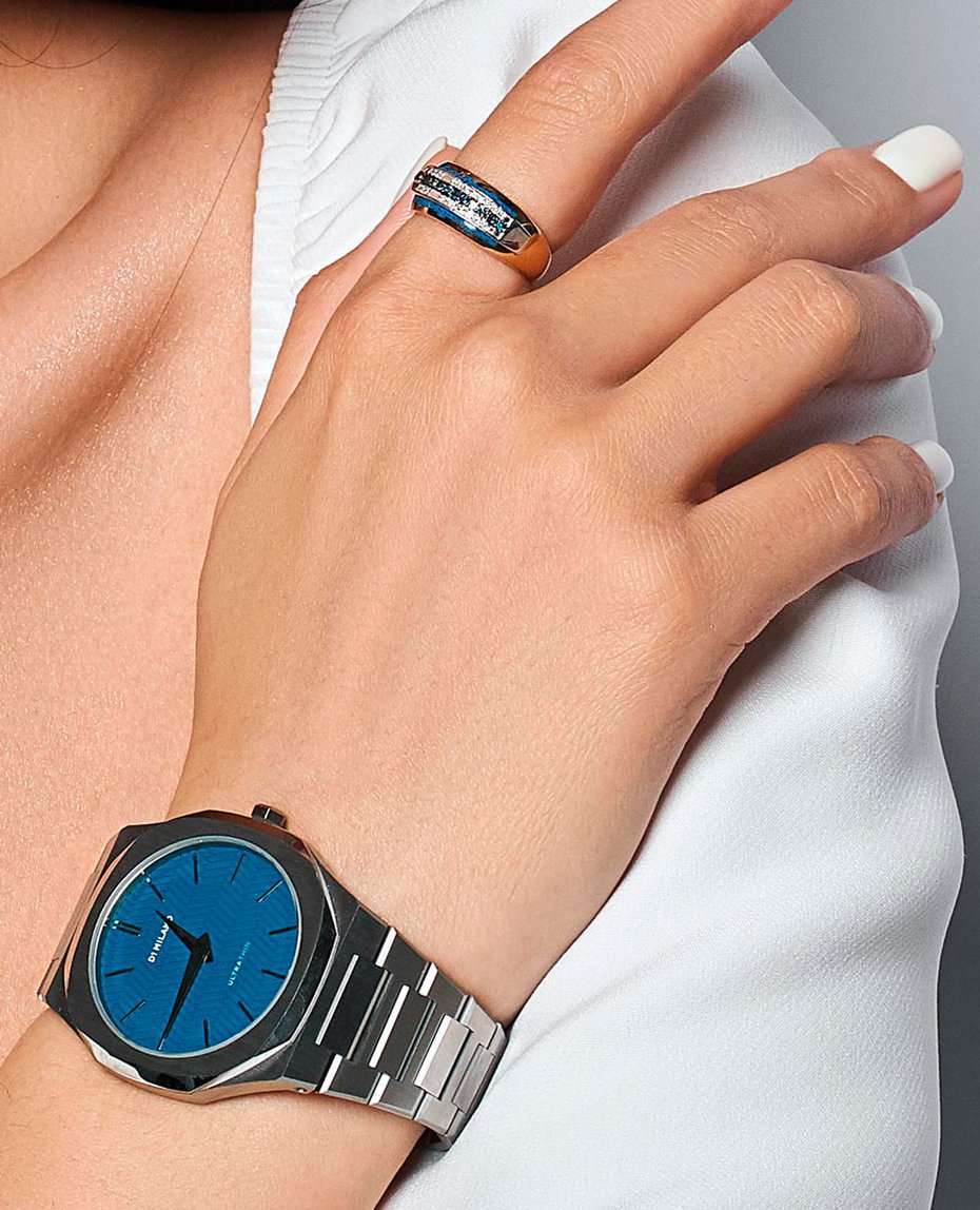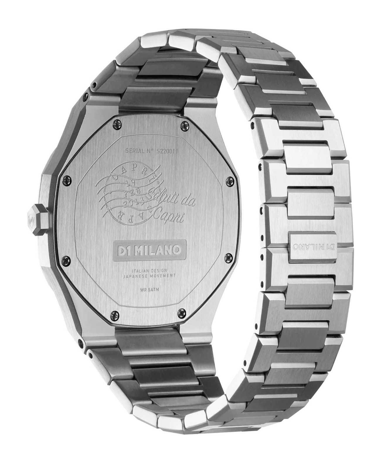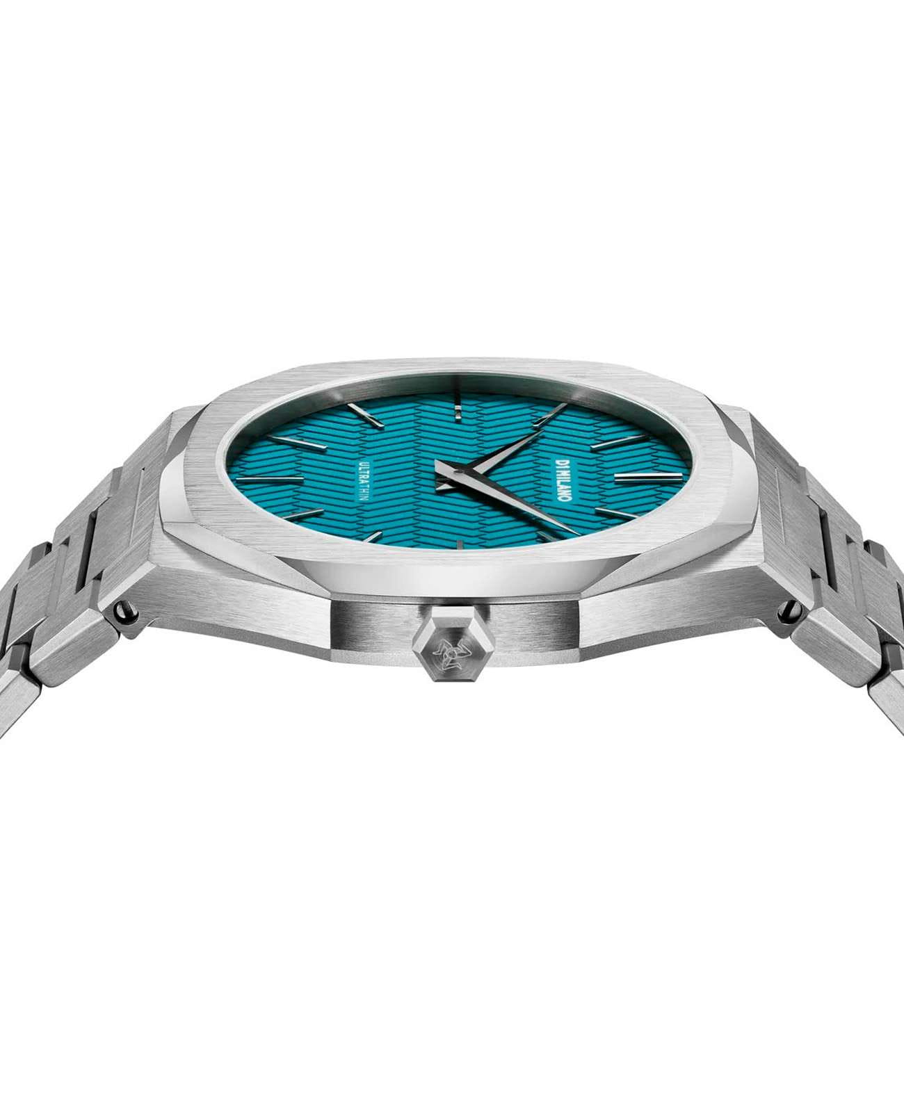 Наручные часы D1 Milano UTBU04 сочетают в себе современный дизайн и надежность технологий. Модель обладает круглым корпусом диаметром 38 мм, изготовленным из нержавеющей стали, что обеспечивает устойчивость к внешним воздействиям. Циферблат бирюзового цвета, вдохновленный кристально чистыми водами острова Панарея, украшен минималистичными метками в виде штрихов, создавая элегантный и запоминающийся образ. Защиту циферблата обеспечивает прочное сапфировое стеклоСапфировое стеклоПрочный и надёжный материал из кристалла сапфира синтетического происхождения, характеризующийся особой твёрдостью и устойчивостью к царапинам и повреждениям., известное своей устойчивостью к царапинам и высокой прозрачностью. Часы оснащены кварцевым механизмом, гарантирующим точность хода без необходимости подзаводки. Браслет выполнен из нержавеющей стали на раскладной застёжкеРаскладная застёжкаТакой тип застёжки используется только на браслетах из металла. Она никогда не раскрывается полностью, происходит разделение на 2 и более частей. Раскладывающая застёжка снизит вероятность потери часов к минимуму., что обеспечивает комфортное ношение на протяжении всего дня. Водонепроницаемость модели составляет 50 метров, что позволяет использовать часы в повседневной жизни, включая контакт с водой при мытье рук или дожде, однако не рекомендуется для погружений или активных водных видов спорта. Изготовленные в Италии, эти ультратонкие часы станут стильным аксессуаром, идеально дополняющим как деловой, так и casual-образ.