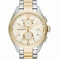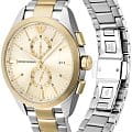 Мужские часы Emporio Armani Claudio AR11605 - стильные с кварцевым механизмом сочетают в себе элегантность и функциональность, что делает их идеальным аксессуаром для современного мужчины. Корпус часов из нержавеющей стали, а безельБезельВнешний ободок, закрепляющий стекло. В спортивных часах так называется поворотное кольцо с делениями на циферблате, выполняет роль таймера – замеряет отрезки времени на шкале. Неподвижный безель – элемент декора. Однонаправленно вращающийся безель на дайверских часах позволяет фиксировать моменты погружения и выныривания на поверхность. с золотистым IP-покрытиемIP-покрытиеМетод ионного напыления. Демонстрирует повышенную устойчивость к истиранию, окислению и химическим веществам. Под воздействием высокого давления и температуры около 1500°C молекулы металла надёжно соединяются с частицами корпуса часов., что обеспечивает долговечность и устойчивость к внешним воздействиям. Минеральное стеклоМинеральное стеклоМинеральное стекло представляет собой искусственно выращенный минерал кварца. Такое стекло отличается особой устойчивостью к повреждениям и царапинам. Уступает по некоторым качествам сапфировому стеклу. защищает золотистый циферблат, добавляя изысканности всей конструкции. Размер корпуса составляет 43 мм, что придаёт часам солидный внешний вид, не утяжеляя при этом запястье. Часы имеют водонепроницаемость WR50 (5 атм), это позволяет использовать их в повседневной жизни, не опасаясь воздействия воды. Стальной браслет на застежке «бабочка»Застёжка "бабочка"Такой вид застёжки дополняется предохранителями, помогающими избежать случайного раскрытия браслета. Обладают изящным исполнением. с частичным золотистым IP-покрытиемIP-покрытиеМетод ионного напыления. Демонстрирует повышенную устойчивость к истиранию, окислению и химическим веществам. Под воздействием высокого давления и температуры около 1500°C молекулы металла надёжно соединяются с частицами корпуса часов. обеспечивает комфортное и надёжное крепление на запястье.  Этот хронографХронографФункция позволяет измерять отрезки времени с особой точностью: часы, минуты, секунды. Верным признаком хронографа является наличие на циферблате 3 дополнительных окошек-счётчиков. с функцией секундомераСекундомерСекундоме́р — прибор, способный измерять интервалы времени с точностью до долей секунды. и календарем, отображающим дату, станет идеальным аксессуаром для тех, кто ценит функциональность и итальянское качество. Стрелки с люминесцентным покрытиемЛюминесцентное покрытиеПозволяет считывать показания времени в темноте. Производители наносят на стрелки, часовые индексы, безель или поверхность циферблата светонакопительный состав, дающий холодное свечение. обеспечивают удобное считывание времени в темноте после кратковременного пребывания на свету, что делает эти часы практичными в любых условиях.