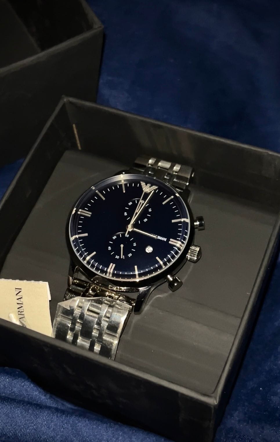 Мужские наручные часы-хронографХронографФункция позволяет измерять отрезки времени с особой точностью: часы, минуты, секунды. Верным признаком хронографа является наличие на циферблате 3 дополнительных окошек-счётчиков. с секундомеромСекундомерСекундоме́р — прибор, способный измерять интервалы времени с точностью до долей секунды. и минеральным стекломМинеральное стеклоМинеральное стекло представляет собой искусственно выращенный минерал кварца. Такое стекло отличается особой устойчивостью к повреждениям и царапинам. Уступает по некоторым качествам сапфировому стеклу. Emporio Armani Classics AR1648, кварцевый механизм с высокой точностью. Корпус часов изготовлен из стали. Окошко даты находится в положении 4 часа. Стрелки и метки с люминесцентным покрытиемЛюминесцентное покрытиеПозволяет считывать показания времени в темноте. Производители наносят на стрелки, часовые индексы, безель или поверхность циферблата светонакопительный состав, дающий холодное свечение.. Класс водозащиты: 50 метров, позволит защитить корпус от случайных брызг или капель дождя. Стальной браслет на застёжке-бабочке с кнопкамиЗастёжка "бабочка"Такой вид застёжки дополняется предохранителями, помогающими избежать случайного раскрытия браслета. Обладают изящным исполнением. .