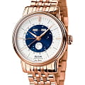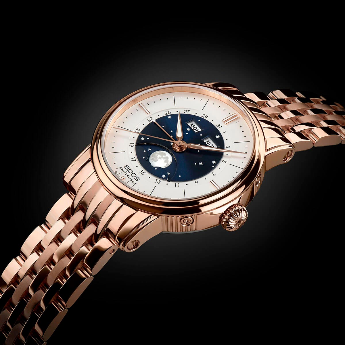 Мужские швейцарские механические часы с автоподзаводом Epos Oeuvre d'art 3439.322.24.26.34. Сапфировое стеклоСапфировое стеклоПрочный и надёжный материал из кристалла сапфира синтетического происхождения, характеризующийся особой твёрдостью и устойчивостью к царапинам и повреждениям. устойчивое к появлению царапин, обладающее высокой прозрачностью. Корпус и браслет часов изготовлен из нержавеющей стали с PVD-покрытиемPVDУльтратонкое покрытие наносится в технике вакуумного напыления, сочетает в себе нитрид титана особой прочности со слоем золота или оксида хрома. Несёт в себе декоративную или защитную функцию.. В механизме 25 камней, частота 28800 полуколебаний в час. Запас хода 42 часа. Механизм декорирован узором Cotes de Geneve. Циферблат выполнен по технологии Sunray (солнечные лучи). В центре циферблат дополнен изображением ночного неба со светящимися звездами и большой светящейся луной луна с люминесцентной подсветкойЛюминесцентное покрытиеПозволяет считывать показания времени в темноте. Производители наносят на стрелки, часовые индексы, безель или поверхность циферблата светонакопительный состав, дающий холодное свечение.. Накладные метки в виде штрихов. Дата отображается центральной стрелкой. Окошко дня недели и месяца. Автоматический указатель фазы луны. Винтажная заводная головка. Прозрачная задняя крышка. Класс водозащиты: 50 метров, позволит защитить корпус от случайных брызг или капель дождя. Стальной браслет на раскладной застёжкеРаскладная застёжкаТакой тип застёжки используется только на браслетах из металла. Она никогда не раскрывается полностью, происходит разделение на 2 и более частей. Раскладывающая застёжка снизит вероятность потери часов к минимуму..