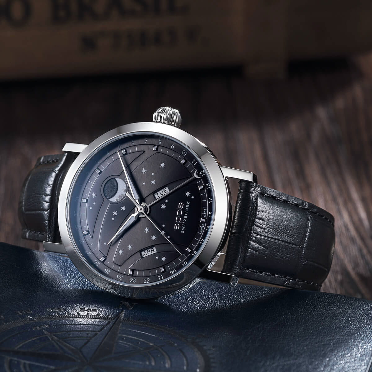 Мужские швейцарские механические часы с автоподзаводом Epos Big Moon 3440.322.20.14.25. Сапфировое стеклоСапфировое стеклоПрочный и надёжный материал из кристалла сапфира синтетического происхождения, характеризующийся особой твёрдостью и устойчивостью к царапинам и повреждениям. устойчивое к появлению царапин, обладающее высокой прозрачностью. Корпус часов изготовлен из нержавеющей стали. Стрелки и метки с люминесцентной подсветкойЛюминесцентное покрытиеПозволяет считывать показания времени в темноте. Производители наносят на стрелки, часовые индексы, безель или поверхность циферблата светонакопительный состав, дающий холодное свечение.. Циферблат с метками в виде точек. Дата отображается центральной стрелкой. Окошки для дня недели и месяца, индикатор фазы Луны. Часовой механизм декорирован жемчужной фактурной шлифовкой (Le Perlage). Прозрачная задняя крышка. Класс водозащиты: 50 метров, позволит защитить корпус от случайных брызг или капель дождя. Кожаный ремешок на стандартной застёжке.