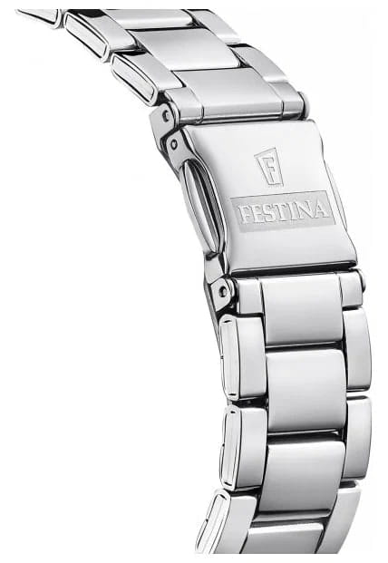 Часы Festina F16790/B — прекрасный выбор для активных и стильных девушек, которые ценят гармонию элегантности и практичности в аксессуарах. Эта модель привлекает внимание своим ярким и современным дизайном, который отлично дополнит как повседневный, так и деловой образ. Надежный кварцевый механизм обеспечивает высокую точность хода и не требует дополнительного обслуживания. Прочное минеральное стеклоМинеральное стеклоМинеральное стекло представляет собой искусственно выращенный минерал кварца. Такое стекло отличается особой устойчивостью к повреждениям и царапинам. Уступает по некоторым качествам сапфировому стеклу. защищает поверхность от появления царапин, сохраняя презентабельный внешний вид часов на долгое время, а также отличается высокой прозрачностью. Особое внимание заслуживает циферблат, выполненный по технологии Sunray — игра света на его поверхности придаёт аксессуару особое очарование, а дополняет необыкновенный вид циферблата — кристаллы. Класс водозащиты 50 метров защитит корпус от случайных брызг и капель дождя. Корпус выполнен из нержавеющей стали, а браслет с раскладной застёжкойРаскладная застёжкаТакой тип застёжки используется только на браслетах из металла. Она никогда не раскрывается полностью, происходит разделение на 2 и более частей. Раскладывающая застёжка снизит вероятность потери часов к минимуму. обеспечивает комфорт и надежность при носке. Также часы дополнены удобным календарем с окошком даты на позиции 4,5 часа.