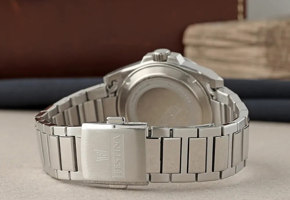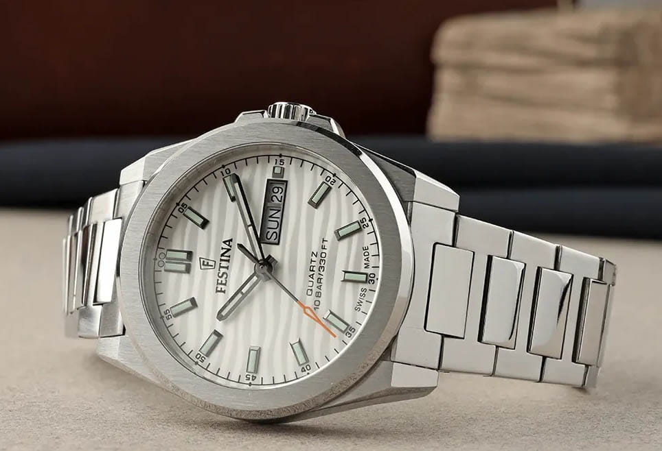 Мужские кварцевые часы Festina F20073/1 из коллекции Swiss Made — это стильный аксессуар с швейцарским качеством и повседневным дизайном. Корпус диаметром 40 мм выполнен из нержавеющей стали серебряного цвета. Циферблат белого цвета дополнен окошком даты и дня недели в положении 3 часов. Циферблат защищён сапфировым стекломСапфировое стеклоПрочный и надёжный материал из кристалла сапфира синтетического происхождения, характеризующийся особой твёрдостью и устойчивостью к царапинам и повреждениям.. Секундная стрелка — оранжевого цвета, что добавляет модели яркий акцент. Заводная головка — вытягивающегося типа, задняя крышка — завинчивающаяся. Часы оснащены стальным браслетом на раскладной застёжкеРаскладная застёжкаТакой тип застёжки используется только на браслетах из металла. Она никогда не раскрывается полностью, происходит разделение на 2 и более частей. Раскладывающая застёжка снизит вероятность потери часов к минимуму. с кнопками. Механизм — швейцарский кварцевый калибр Ronda 517 с 45-месячным сроком службы батареи. Водонепроницаемость 100 м позволяет использовать часы для плавания. Универсальный выбор для тех, кто ценит точность, надёжность и лаконичный стиль.