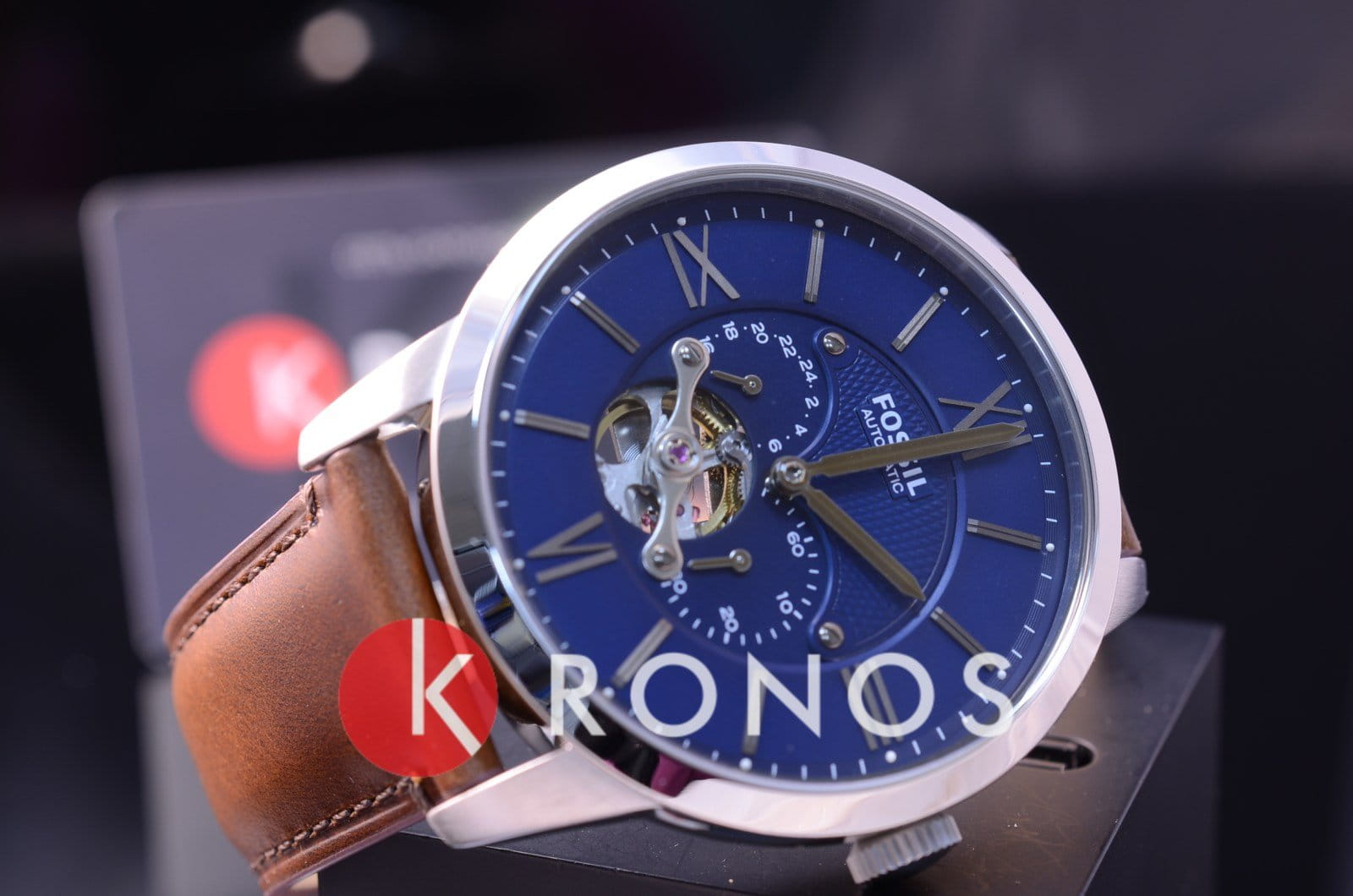 Наручные часы от популярного американского бренда Fossil - они будут замечательно смотреться как с повседневным стилем одежды, так и костюмом;  браслет: кожа; корпус: сталь; цвет браслета: темно-коричневый; цвет корпуса: серебро; цвет циферблата: синий; ширина браслета: 22MM; водонепроницаемость: 5 ATM; диаметр корпуса: 44MM