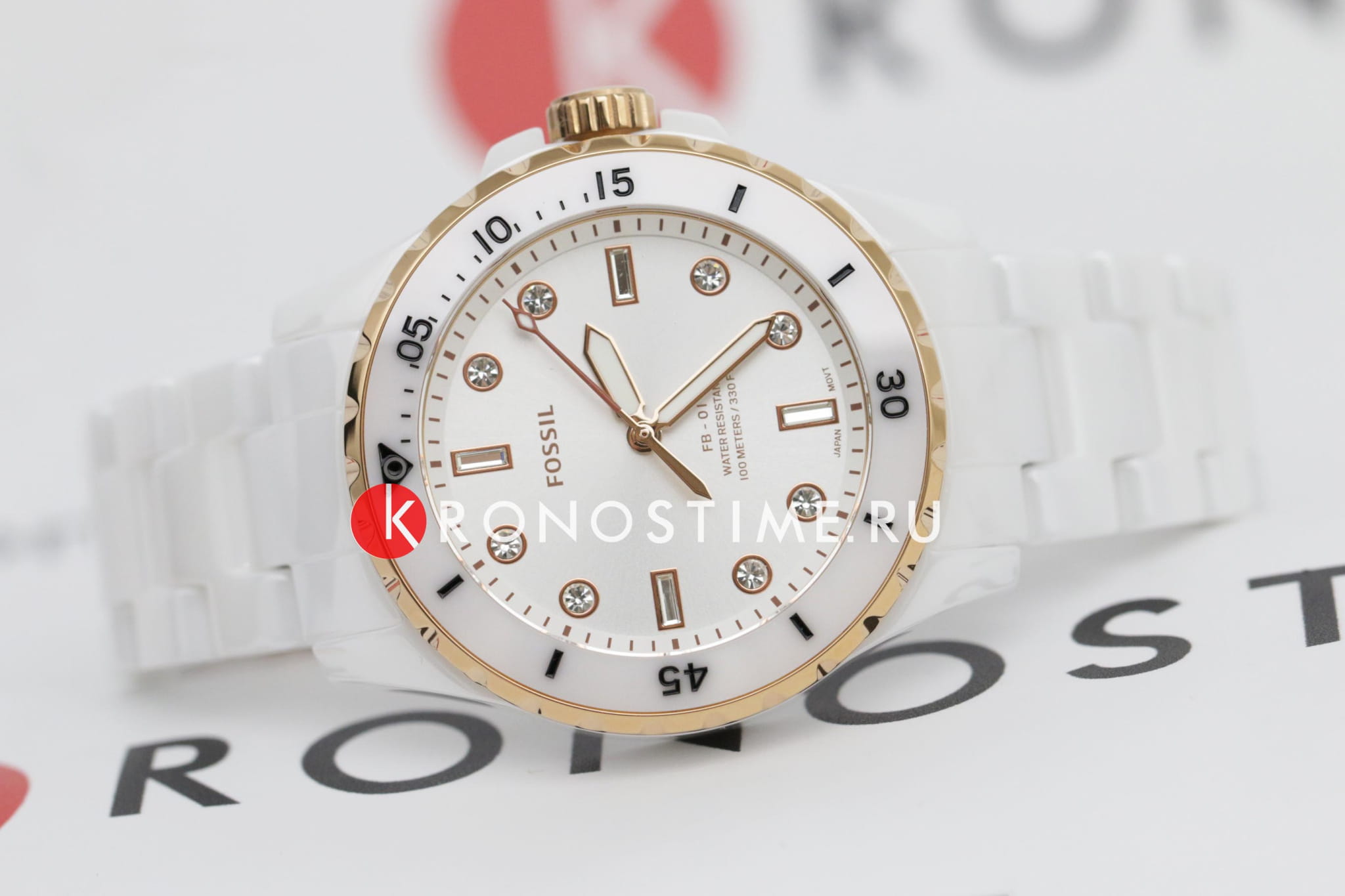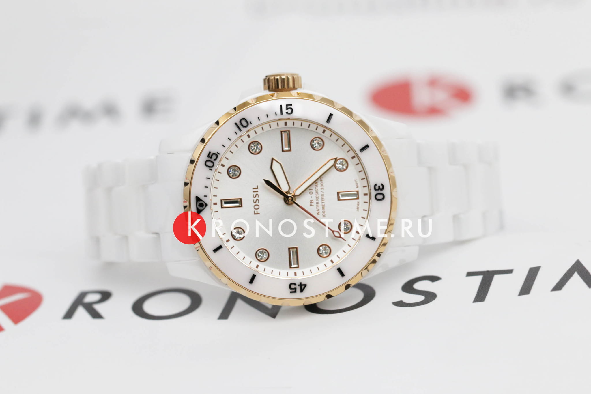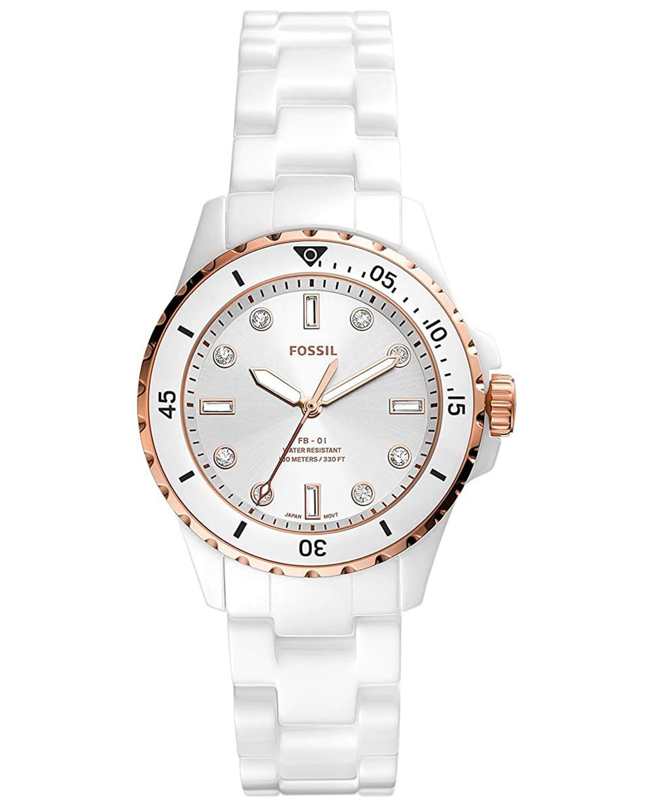Женские наручные часы Fossil на браслете Fossil FB-01 CE1107, кварцевый механизм с высокой точностью. Класс водозащиты: 100 метров, позволит плавать, нырять и заниматься другими водными видами спорта. Стрелки с люминесцентным покрытиемЛюминесцентное покрытиеПозволяет считывать показания времени в темноте. Производители наносят на стрелки, часовые индексы, безель или поверхность циферблата светонакопительный состав, дающий холодное свечение.. Циферблат украшен кристаллами. Корпус часов изготовлен из стали. Керамический браслет с раскладной застёжкойРаскладная застёжкаТакой тип застёжки используется только на браслетах из металла. Она никогда не раскрывается полностью, происходит разделение на 2 и более частей. Раскладывающая застёжка снизит вероятность потери часов к минимуму..